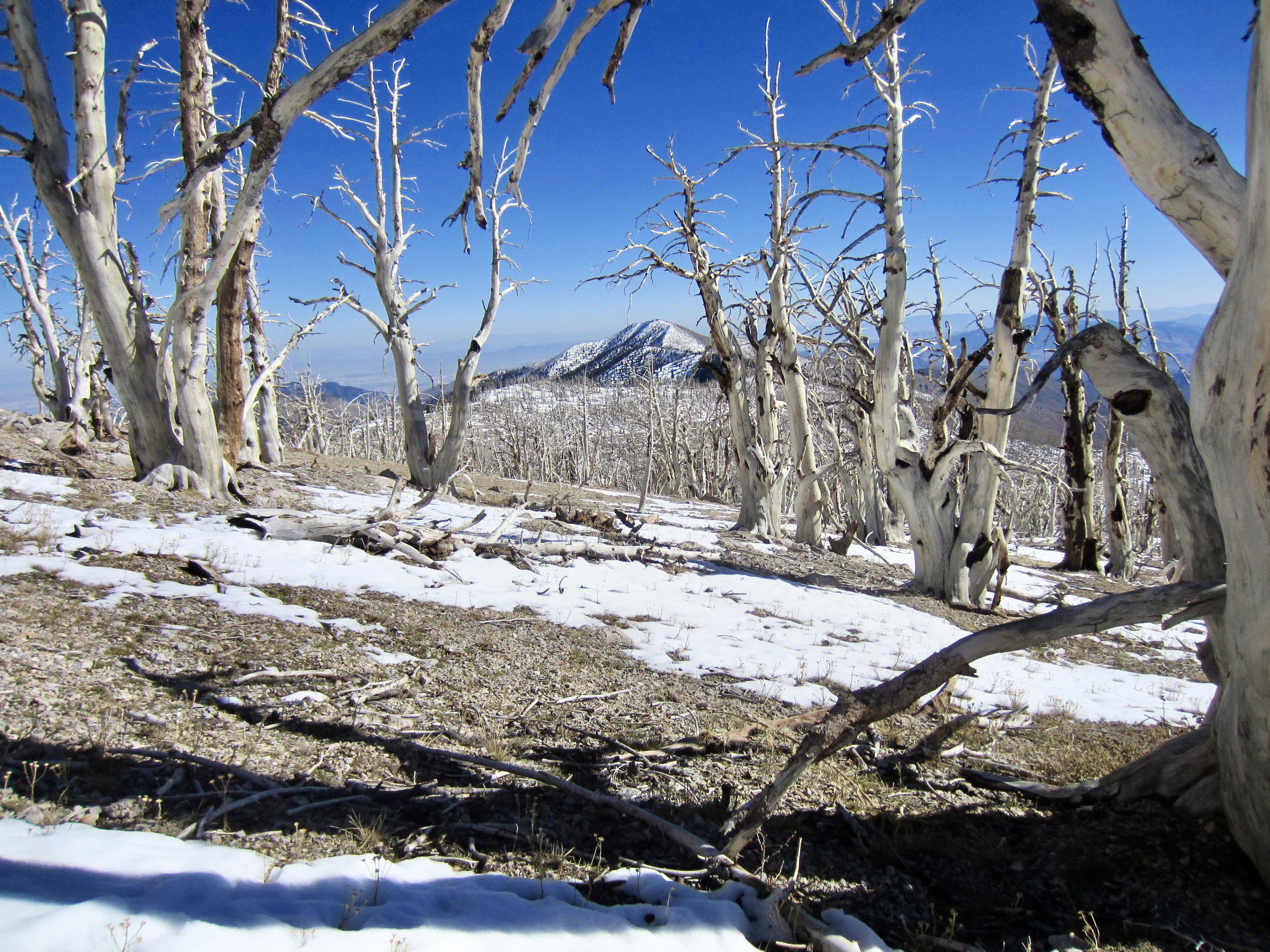 After a long mile, the two branches converged into a single trail and crossed over an 11,400-foot saddle in a spur ridge. This took me onto a south-facing aspect with a distinctly different appearance. Very soon, I re-entered the 1940s-era burn zone, which is covered by countless thousands of bristlecone pine “skeletons.”