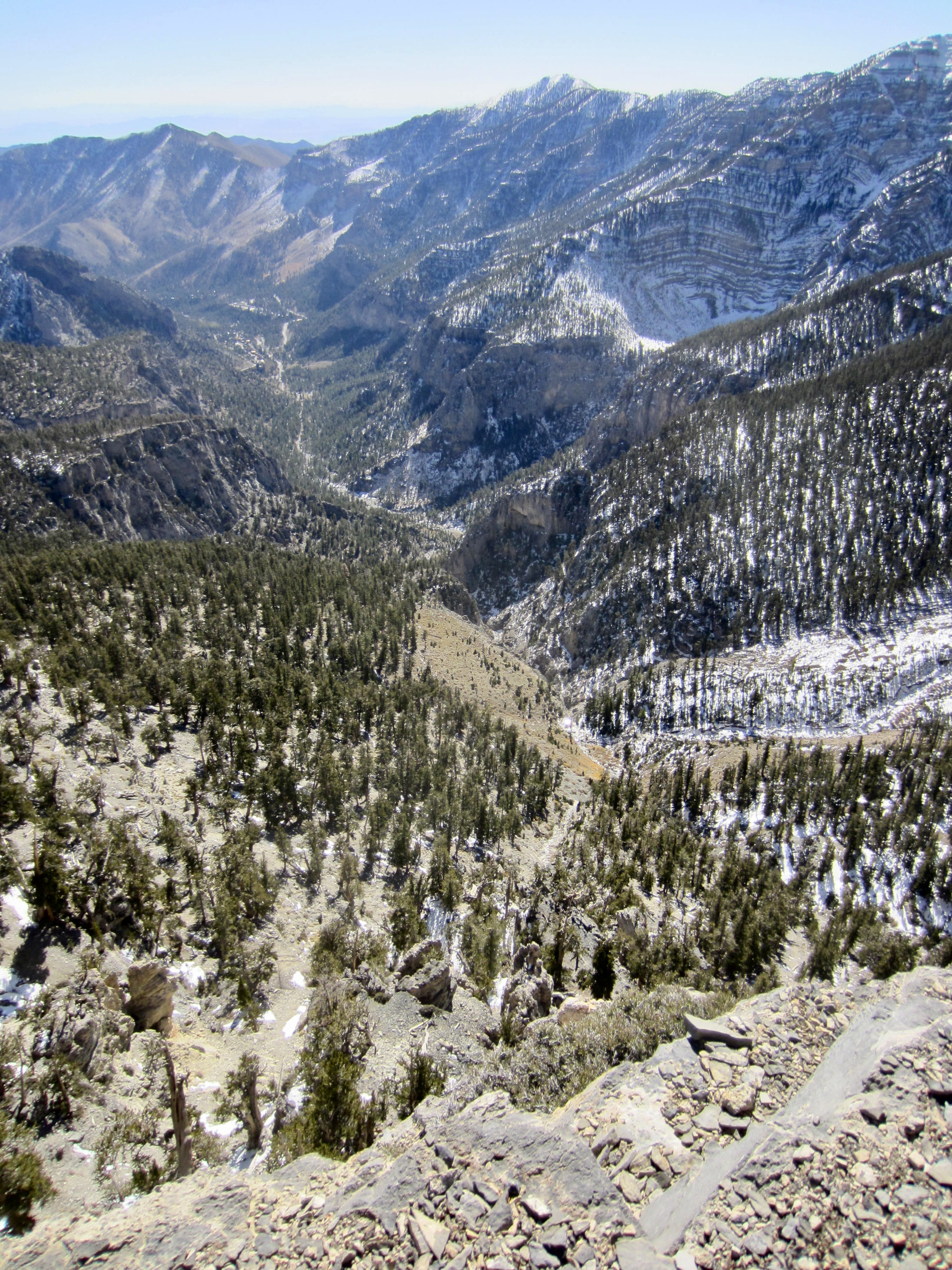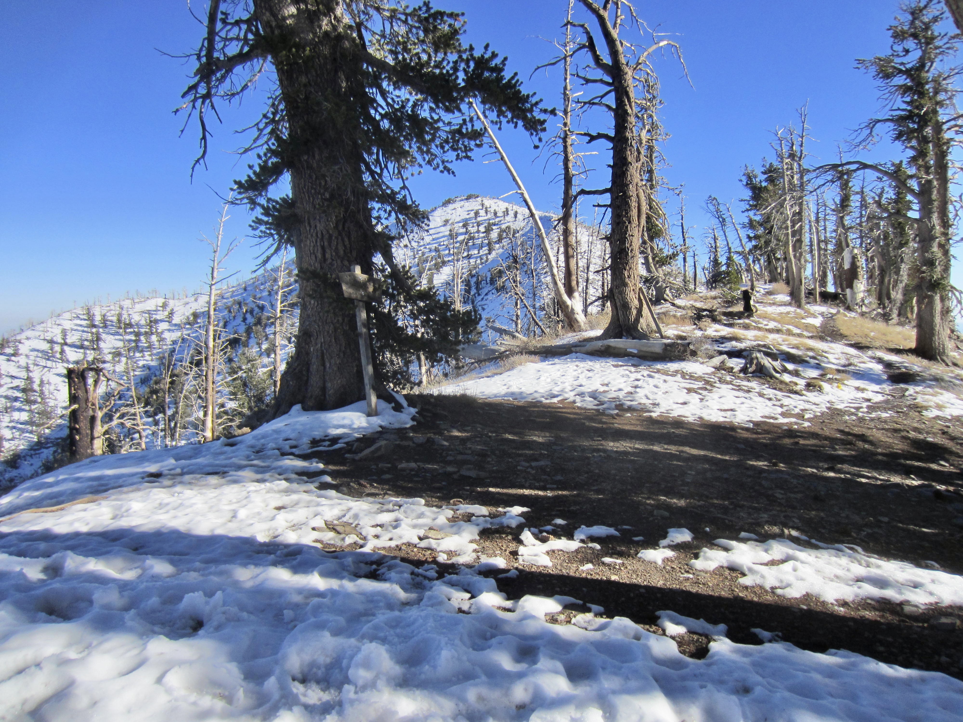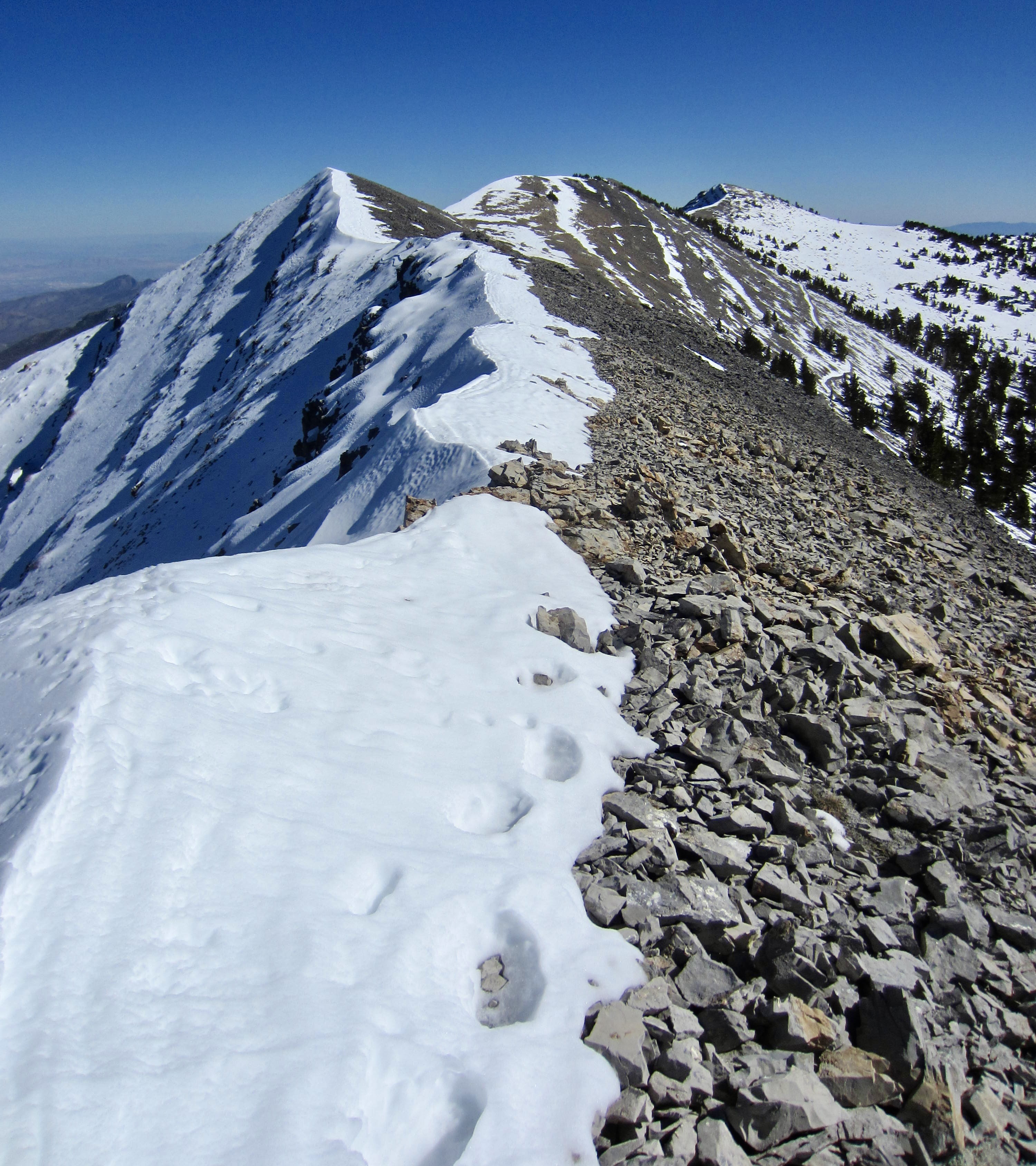 The Charleston Peak Traverse could, of course, be completed in either a north-to-south or a south-to-north direction. I chose the former direction because it involves ascending the more exposed parts of the route, then descending the less exposed parts. Normally, I wouldn’t be too concerned about exposure on a well-constructed trail, but my hike occurred one week after a freak snowstorm blanketed Mt. Charleston with snow and ice—putting an emphasis on alpine desert peak! In retrospect, this was a good direction from both a safety standpoint and an esthetic standpoint. I would recommend it even without snow and ice.