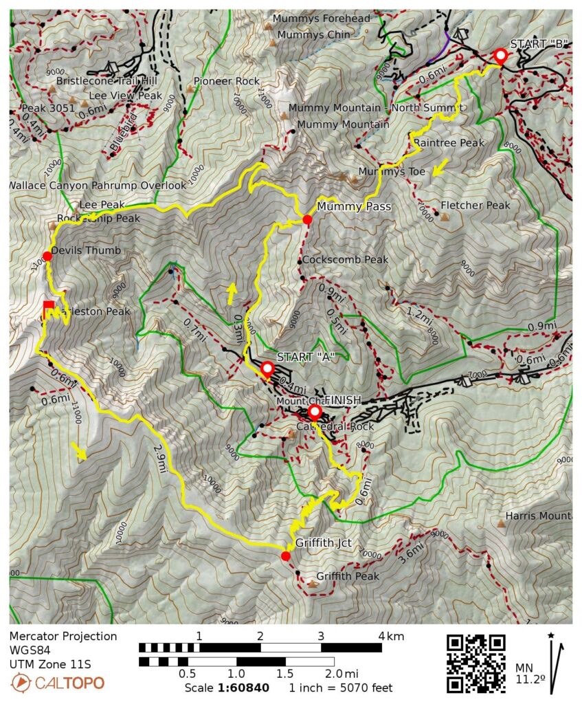 When doing a north-to-south traverse, you currently have your choice between two different starting points and corresponding approaches to Mummy Pass. These two options are: (A) start at Echo Trailhead on Echo Road inside Mt. Charleston Village and approach via Trail Canyon; or (B) start at North Loop Trailhead on Deer Creek Road outside of the village and approach via Raintree Junction. Key pros and cons of each option are summarized below. Regardless of starting point, your traverse will go through Mummy Pass and Griffith Junction, then end at the Cathedral Rock / South Loop Trailhead on Kyle Canyon Road in the village.