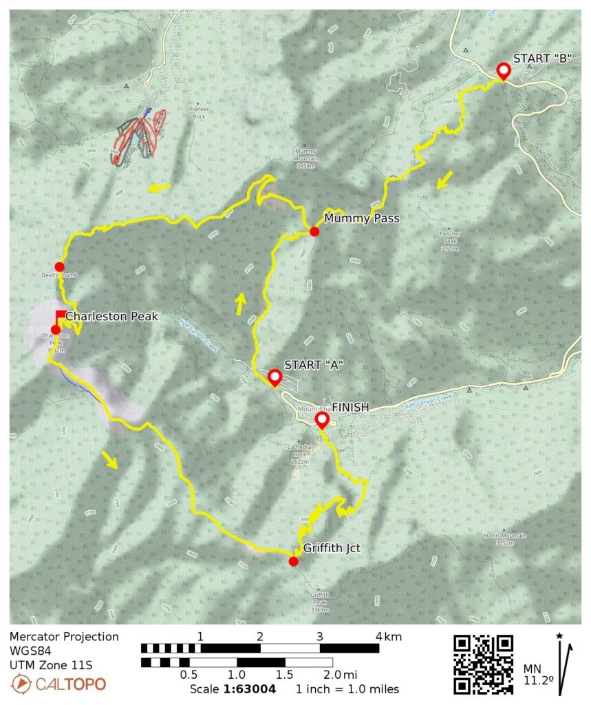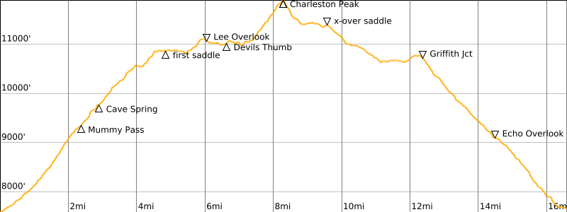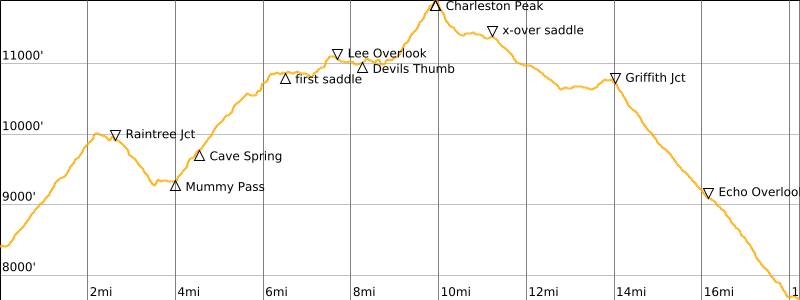 For purposes of this trip report, I’ve divided the traverse into five segments, as follows: Echo Trailhead (starting option “A”) to Mummy Pass; North Loop Trailhead (starting option “B”) to Mummy Pass; Mummy Pass to Charleston Peak summit; Charleston Peak summit to Griffith Junction; and Griffith Junction to South Loop Trailhead.