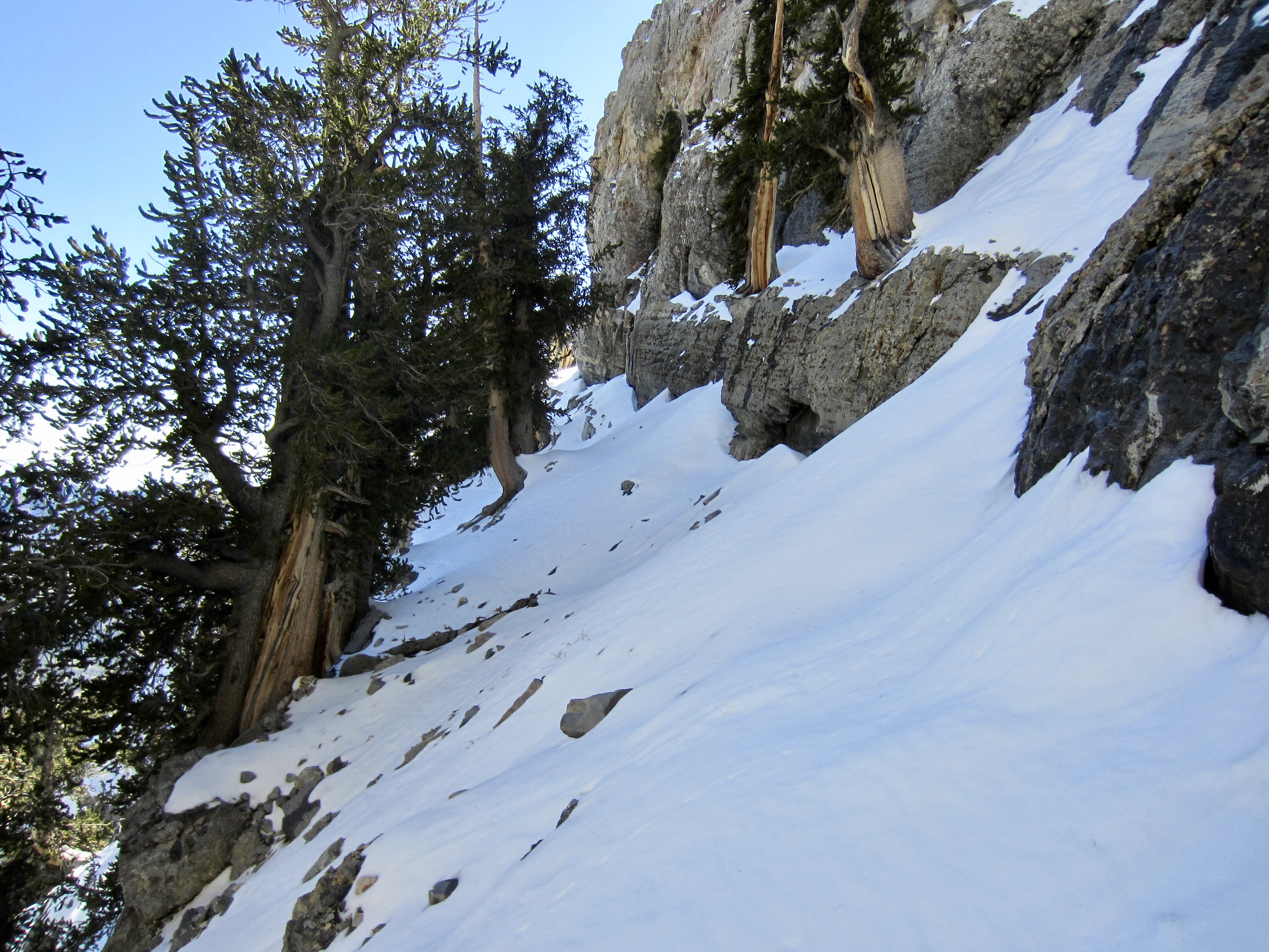I began plowing forward, carefully staying on the trail as best I could as it contoured across a series of ribs and gullies. Typically, the snow depth decreased to only a few inches where the trail rounded a rib, but it increased to knee-deep in the gullies. The exposure would have warranted an ice axe and crampons if the sun crust had been much harder, but I was able to punch through the crust with each step.