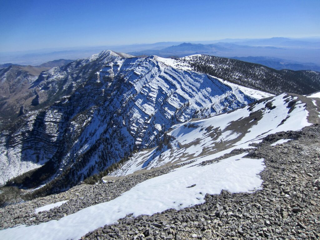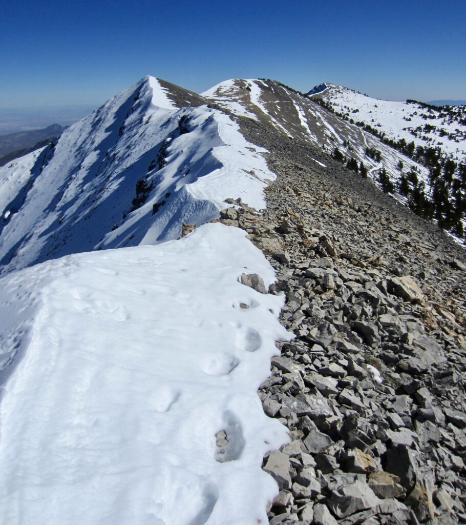 By all accounts, the “signature hike” at Mt. Charleston is the Charleston Peak Traverse—a one-way trail traverse over the summit. This challenging day-hike showcases the wide variety of topography, botany, and geomorphology in the massif, while offering great views of nearby canyons, ridges, peaks, and desert plains. Completing the traverse seems to be a rite of passage for Las Vegas hikers, and I would include it on my all-time list of Top Three Desert Day-Hikes, along with the Superstition Ridge Full Traverse in Arizona and the Chesler Park Loop in Utah.