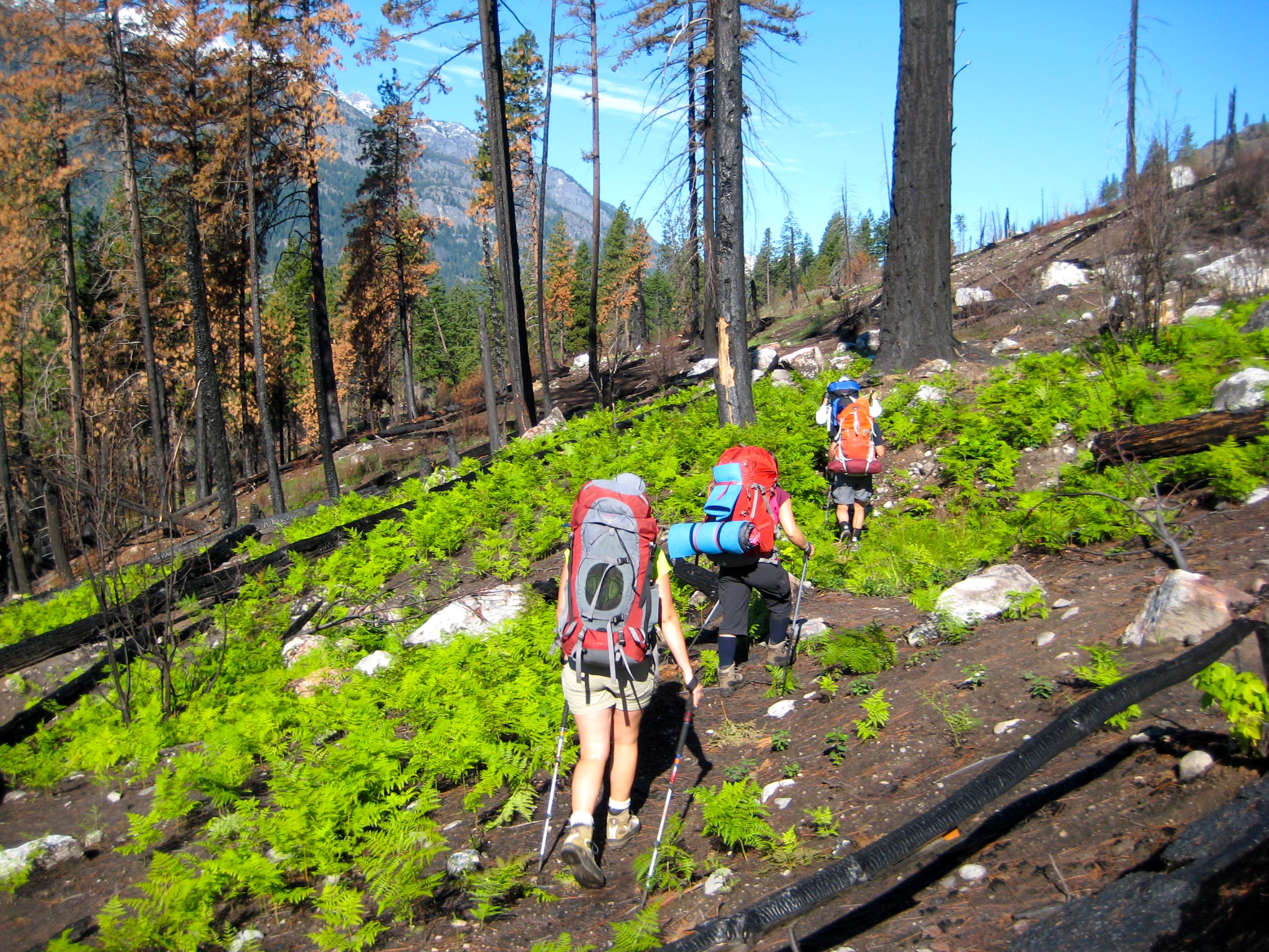 Day 2 began a little warmer and calmer than the previous day, so we made no haste in getting out of camp. Once on the trail, we passed through a large burn area that extended for 2 miles or more. It was reassuring to see vegetation starting to grow on the charred hillsides.