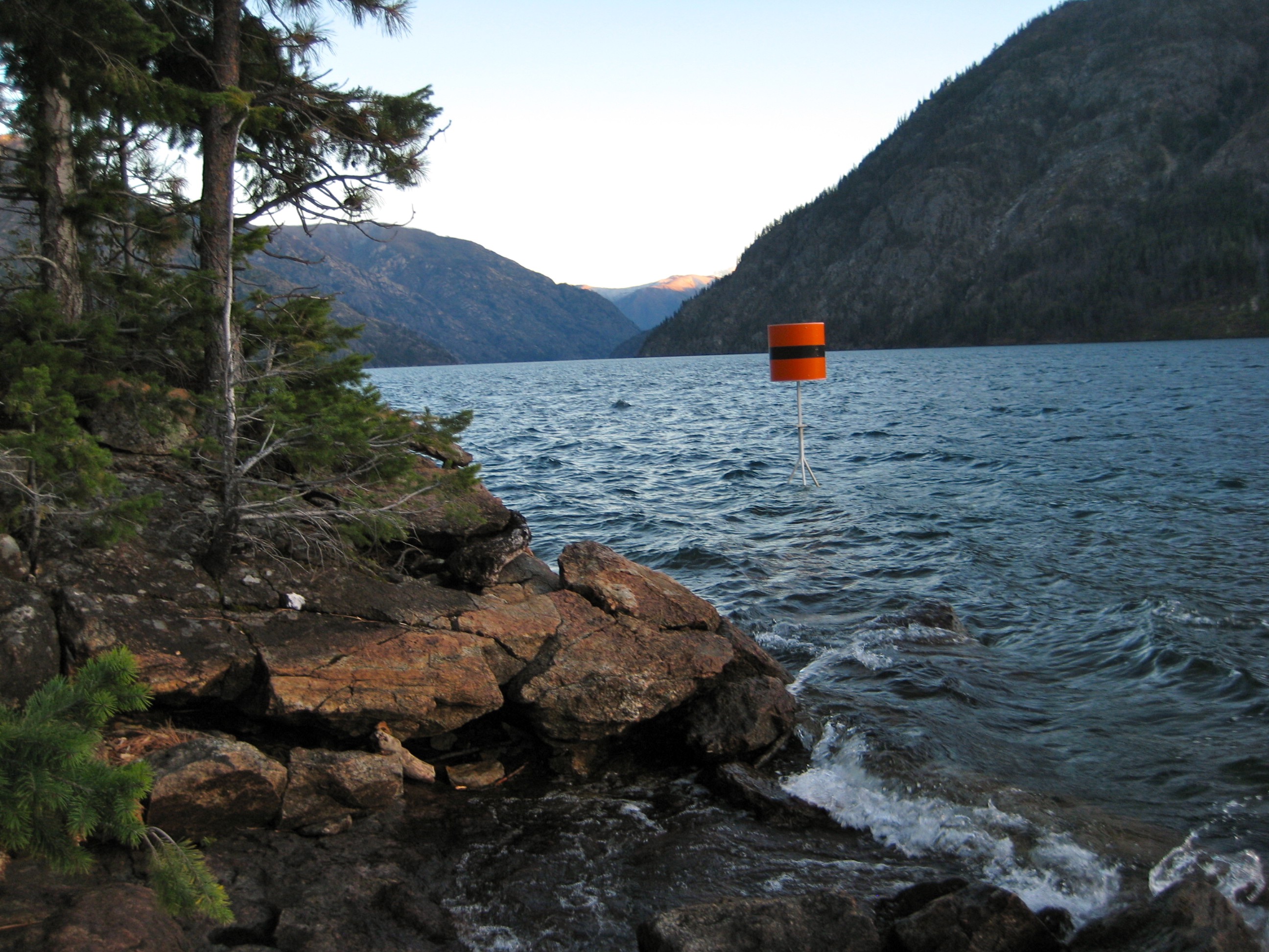 The grassy bench campsite can be readily identified by an orange channel marker just offshore. There is easy access to the lakeshore at a little rock beach near the marker.