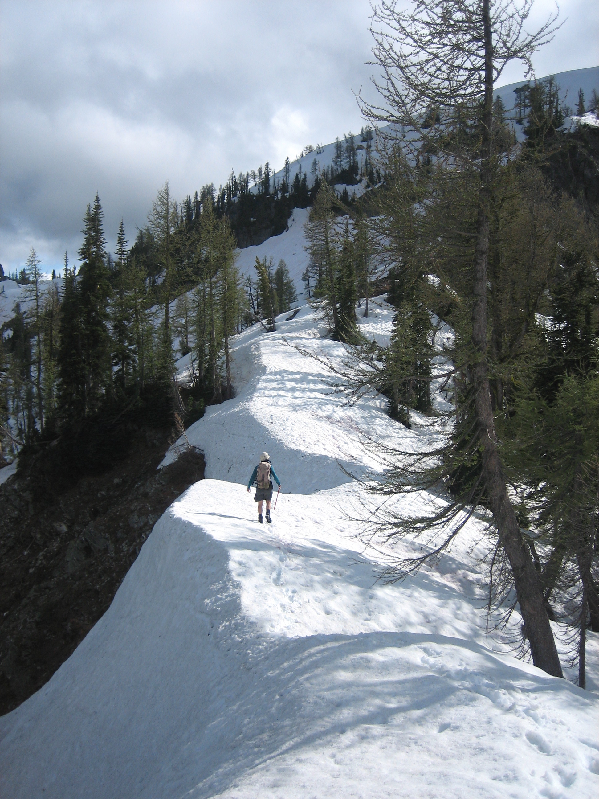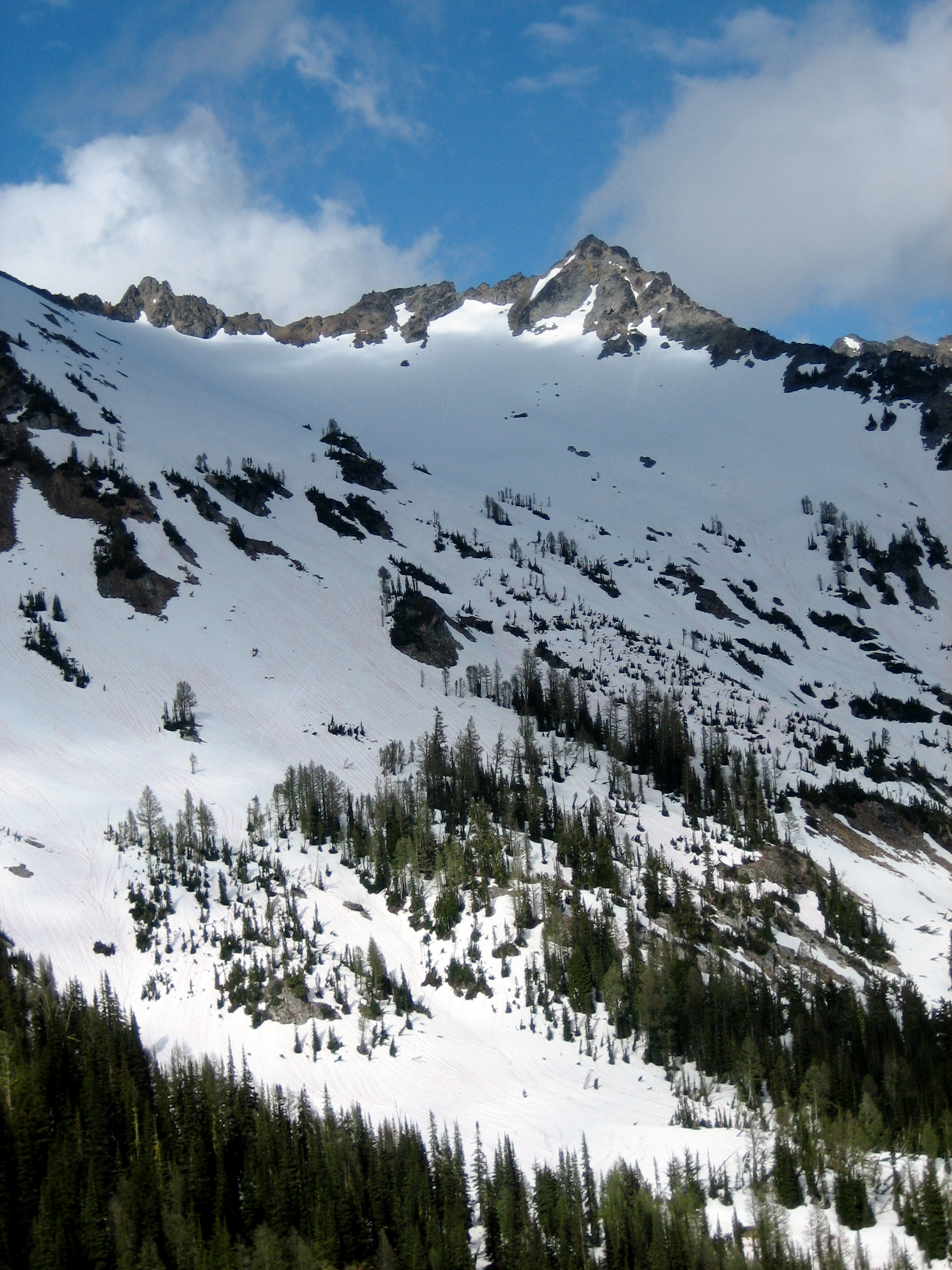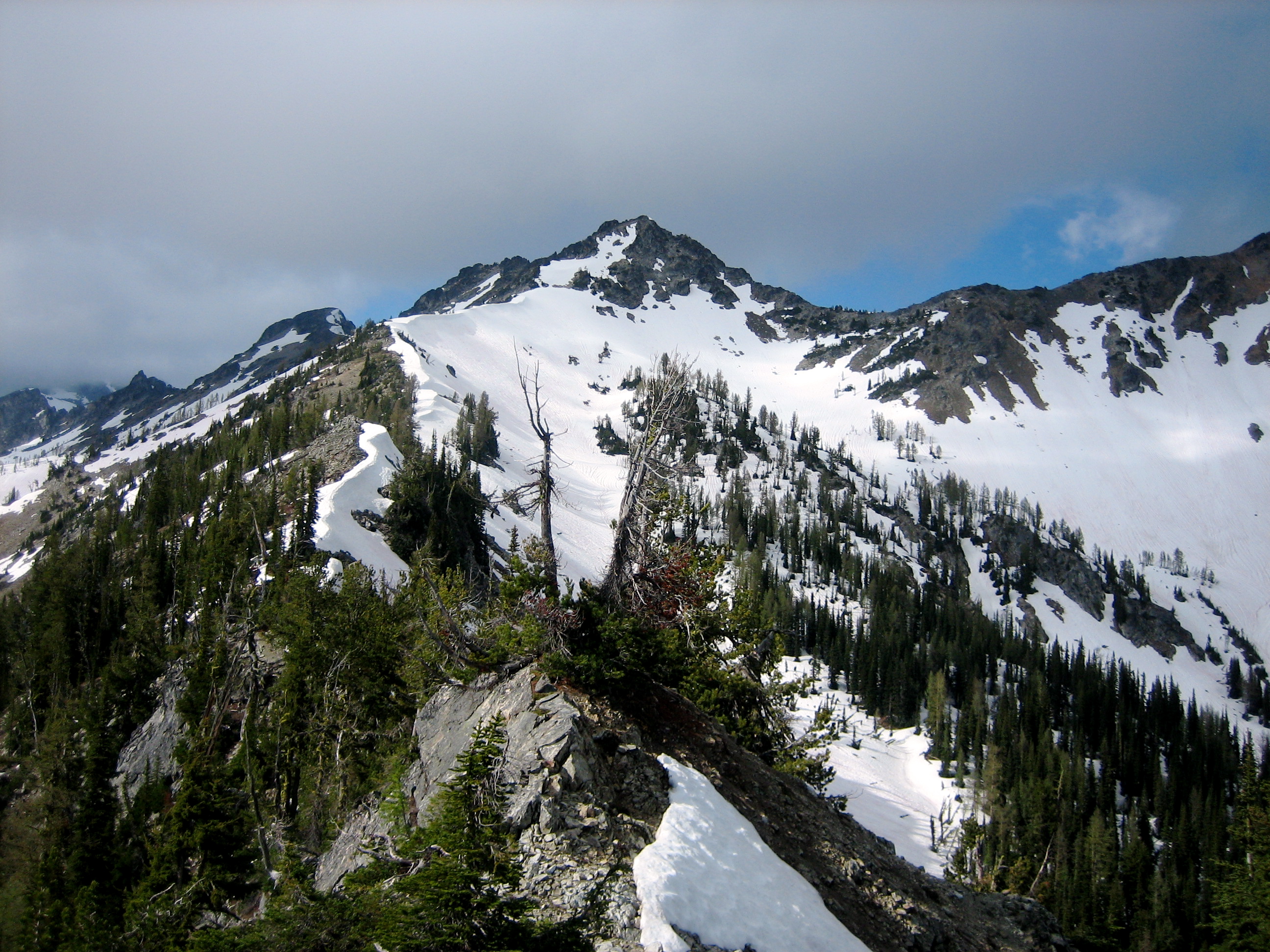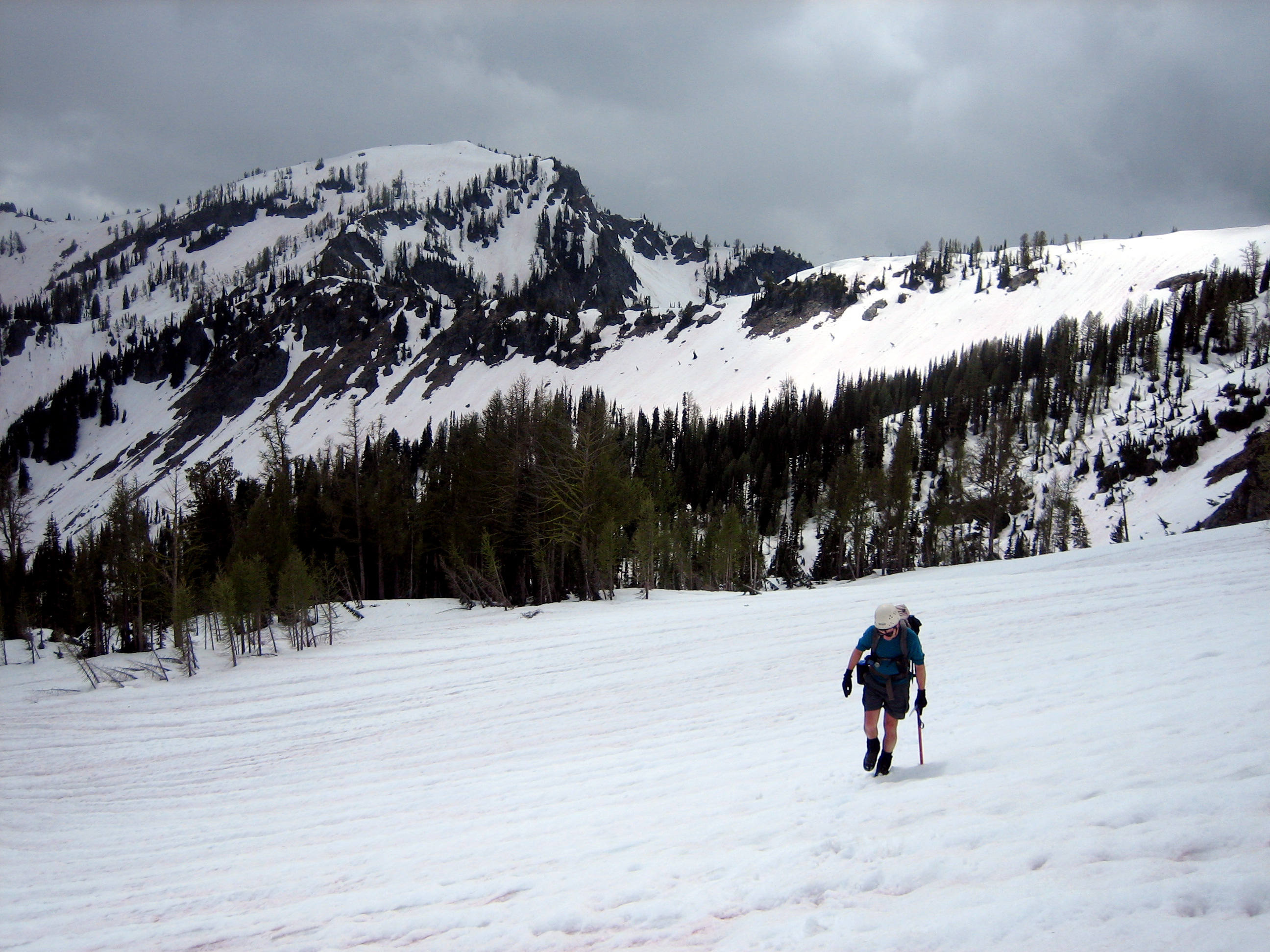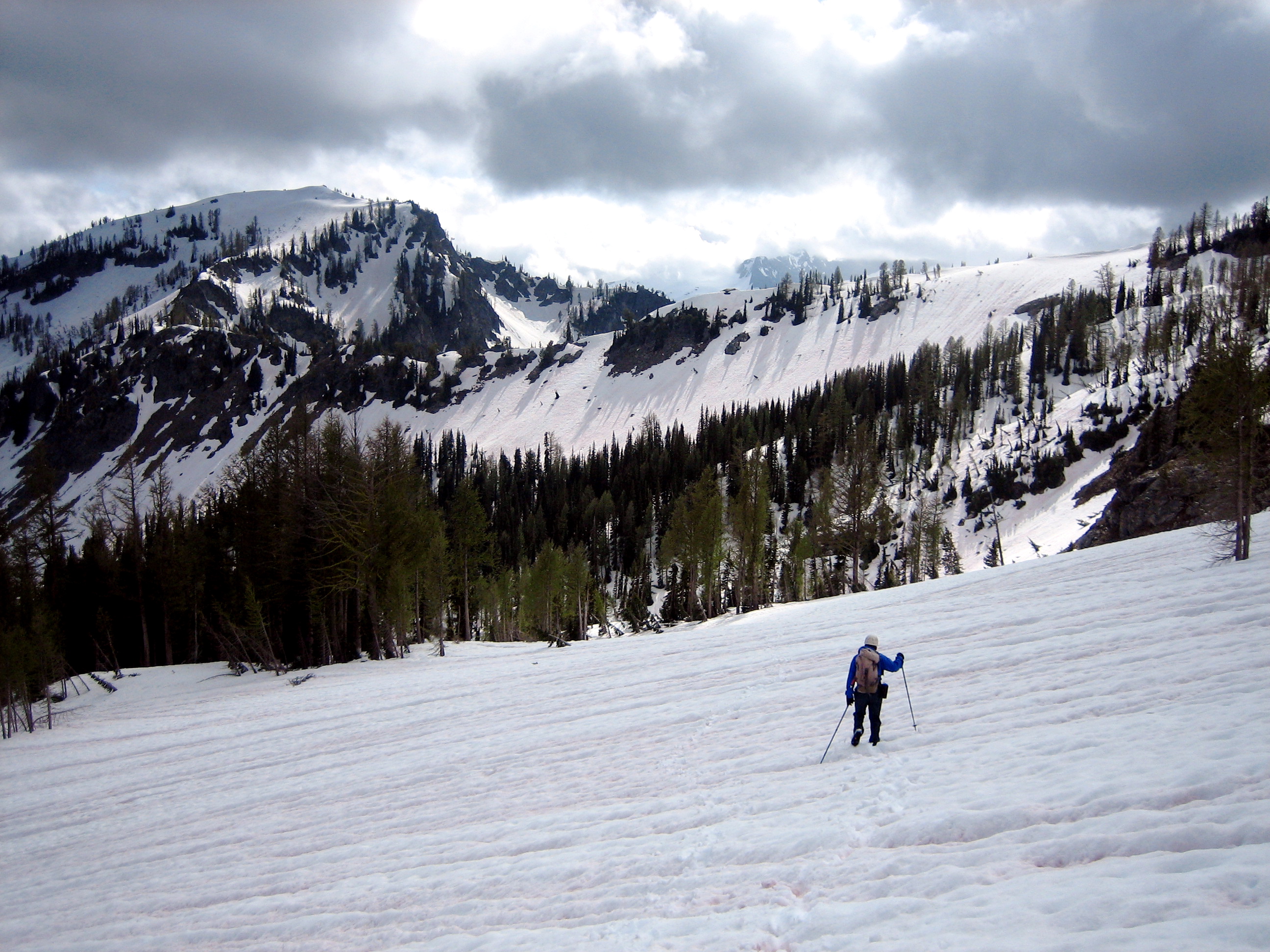 We hiked up the not-yet-logged-out Carne Mountain Trail, encountering a solid snowpack in Carne Basin. We continued over Carne Pass to Rock Creek Pass, dropped 100 feet towards the east, then kicked steps northeasterly up a wide-open snow basin.
