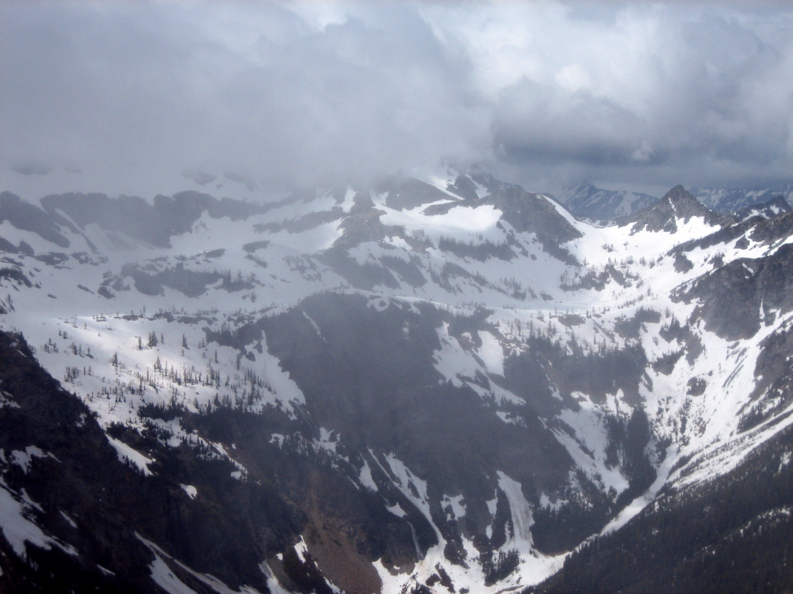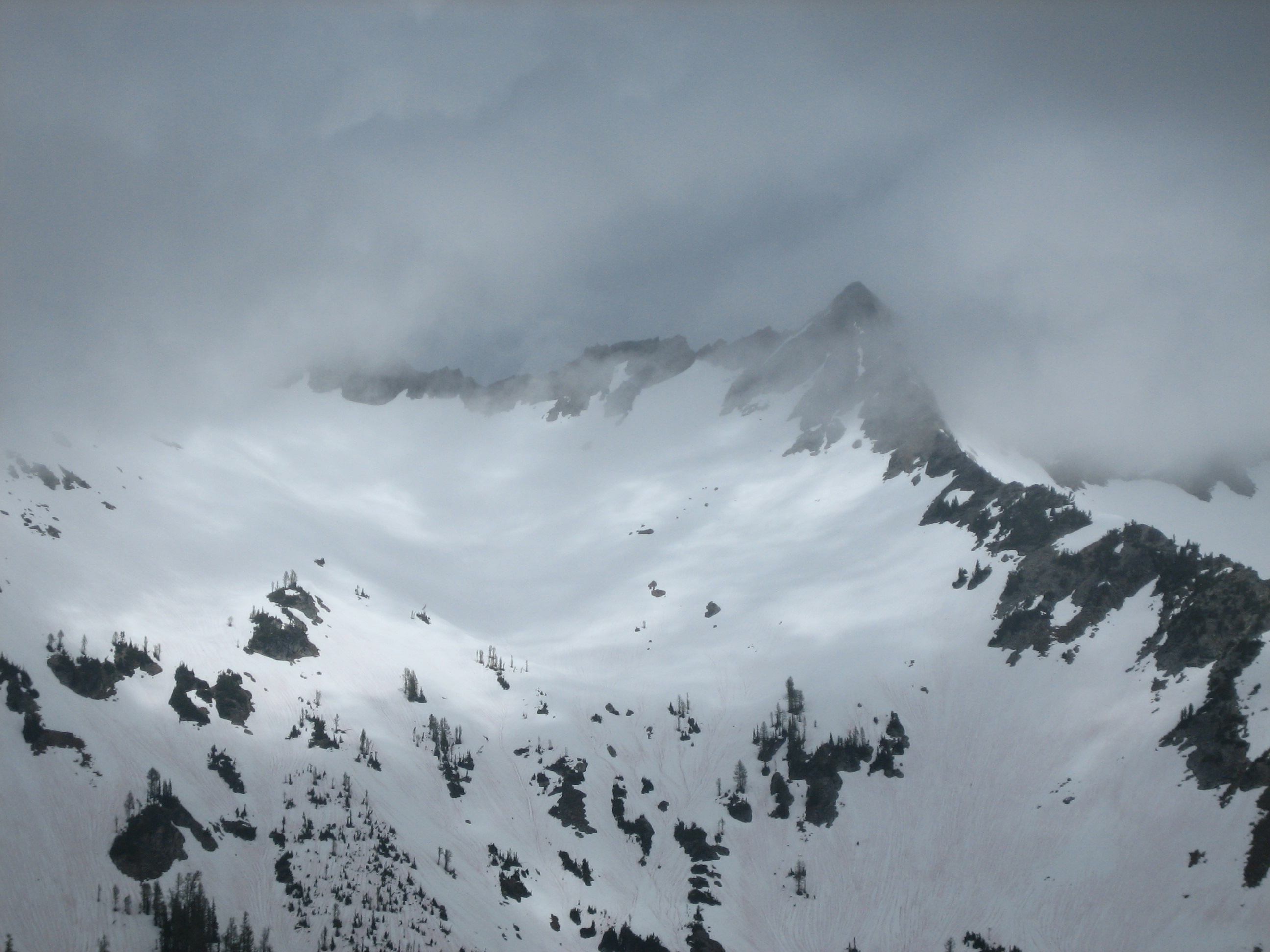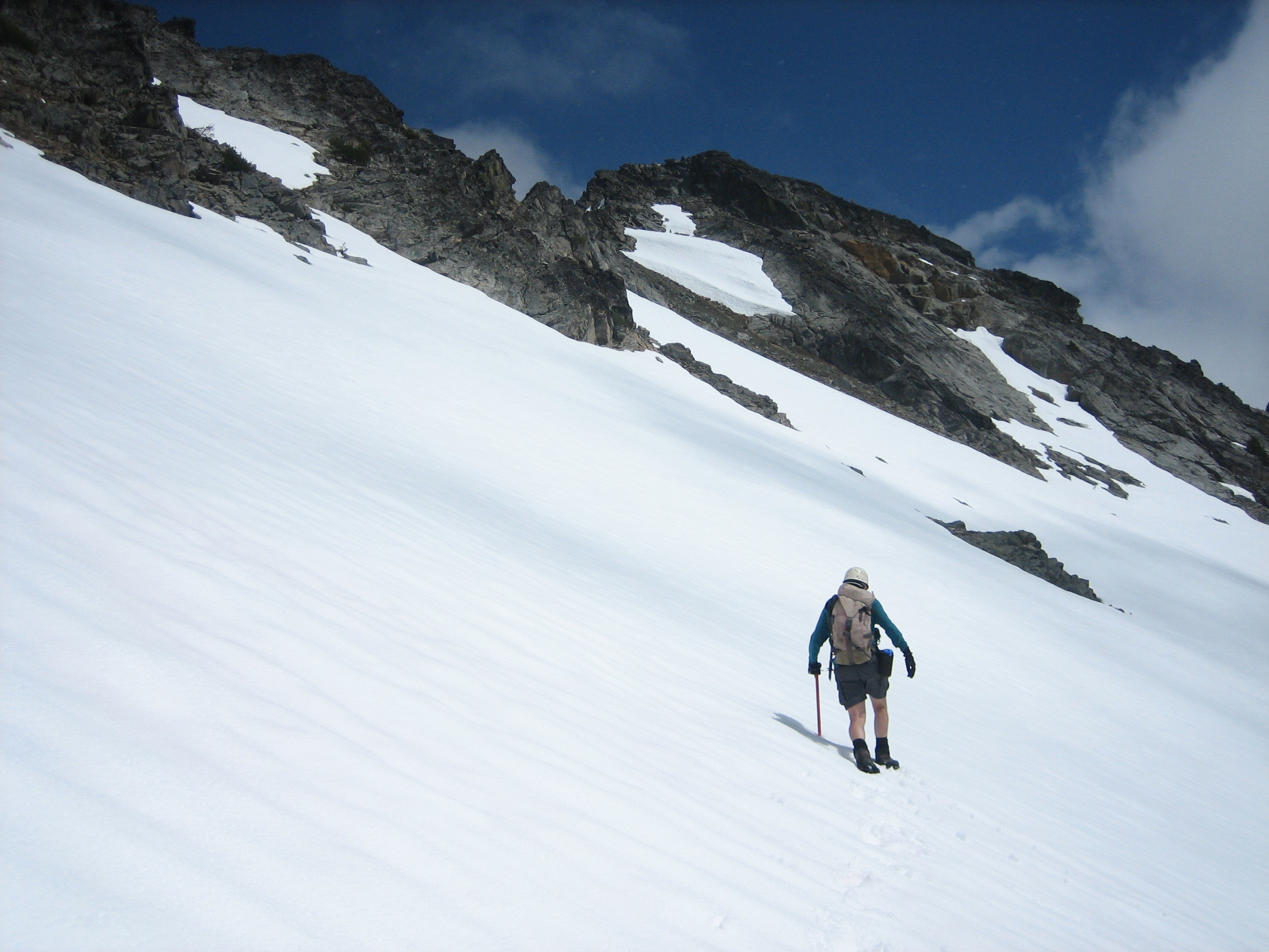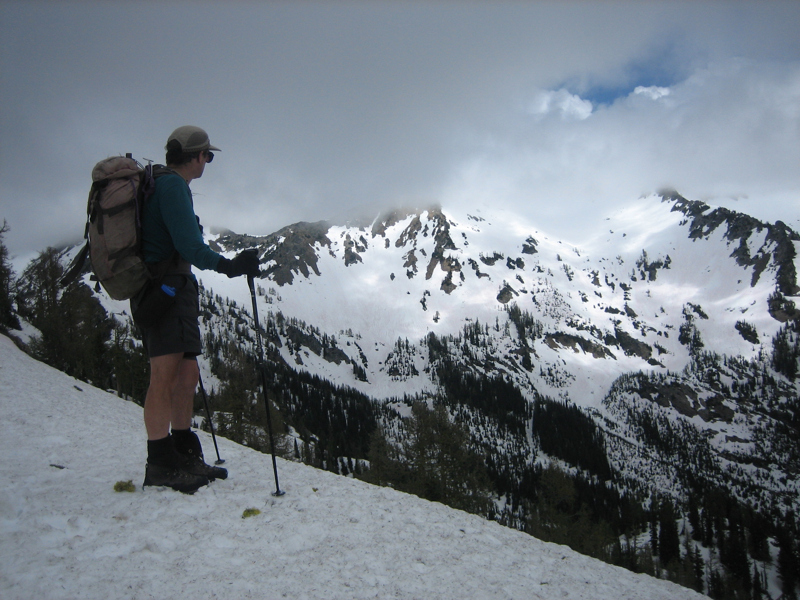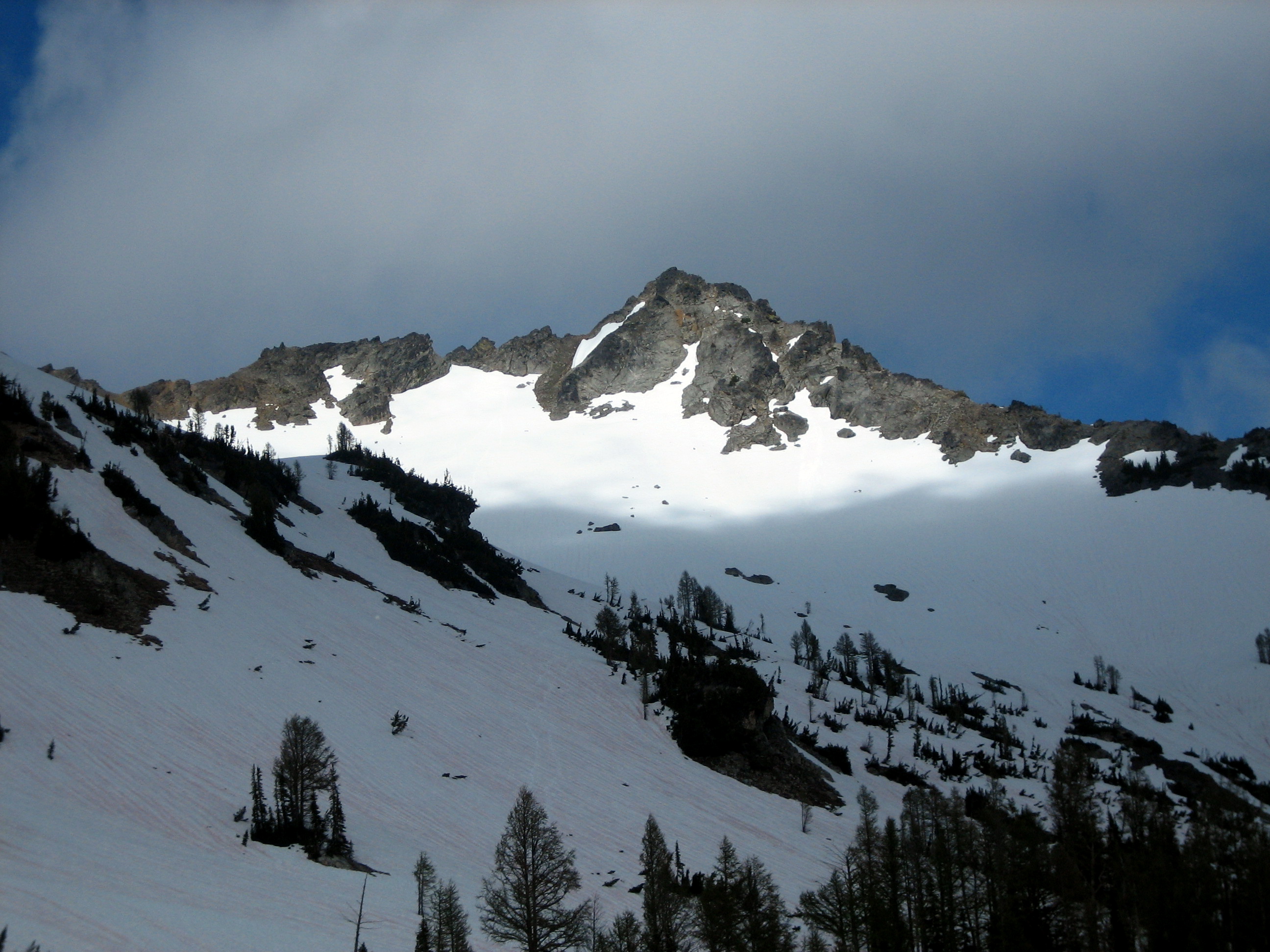 We hiked up the not-yet-logged-out Carne Mountain Trail, encountering a solid snowpack in Carne Basin. We continued over Carne Pass to Rock Creek Pass, dropped 100 feet towards the east, then kicked steps northeasterly up a wide-open snow basin.