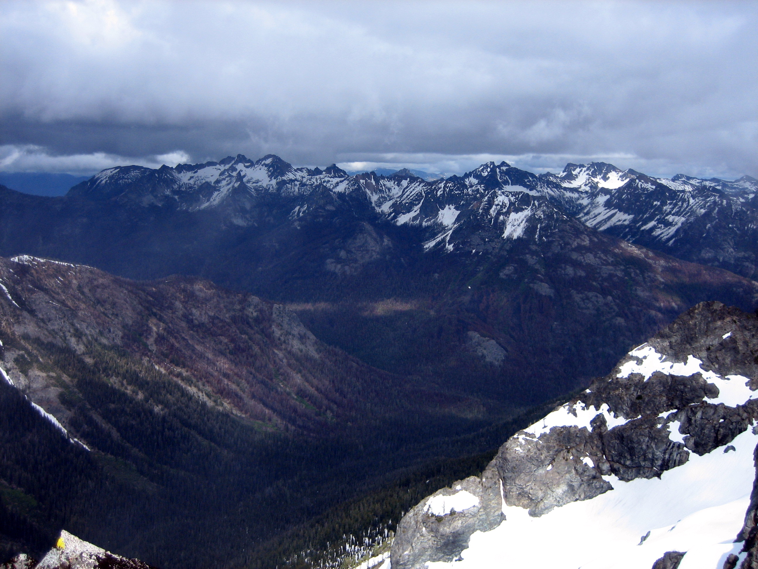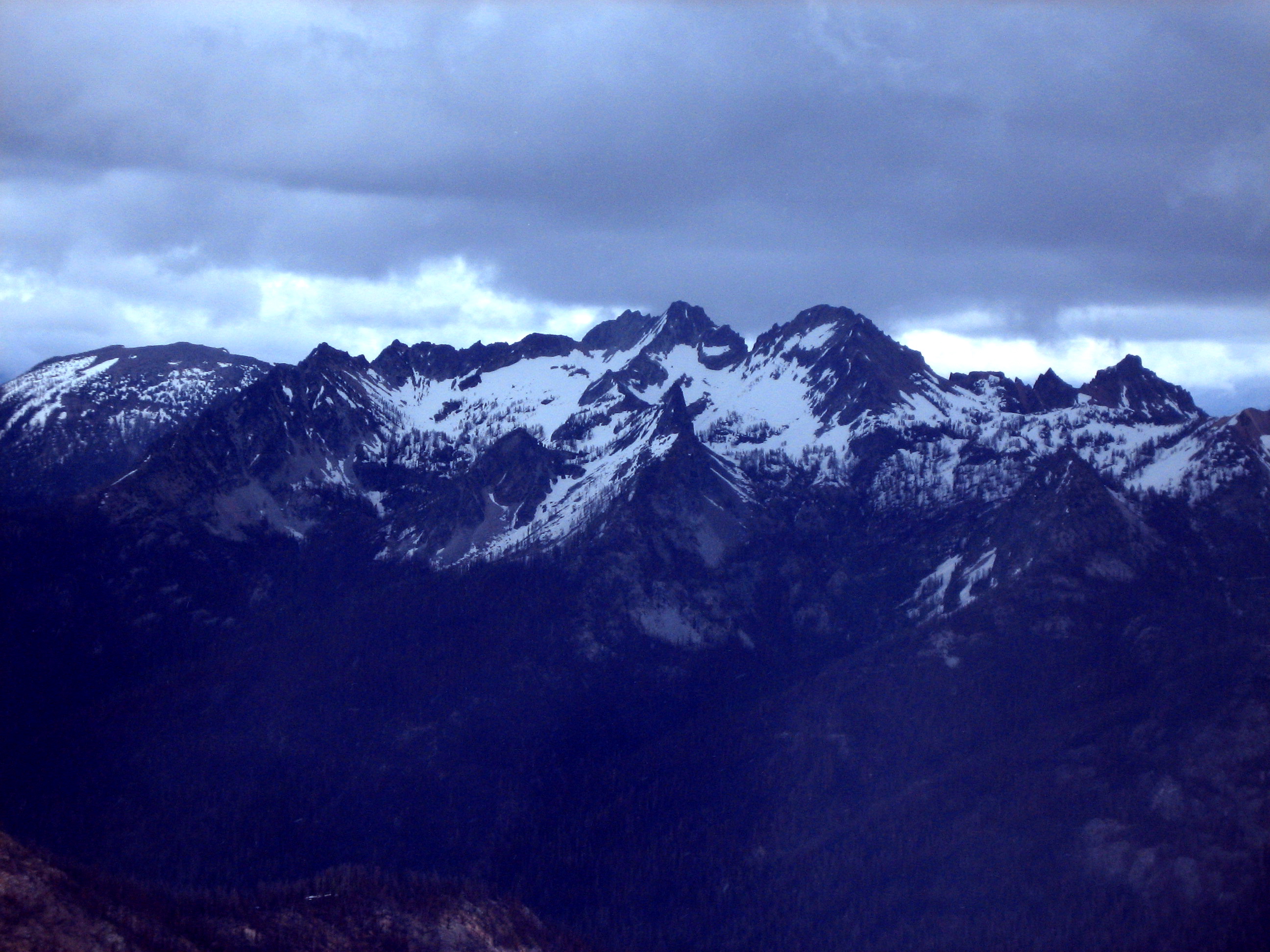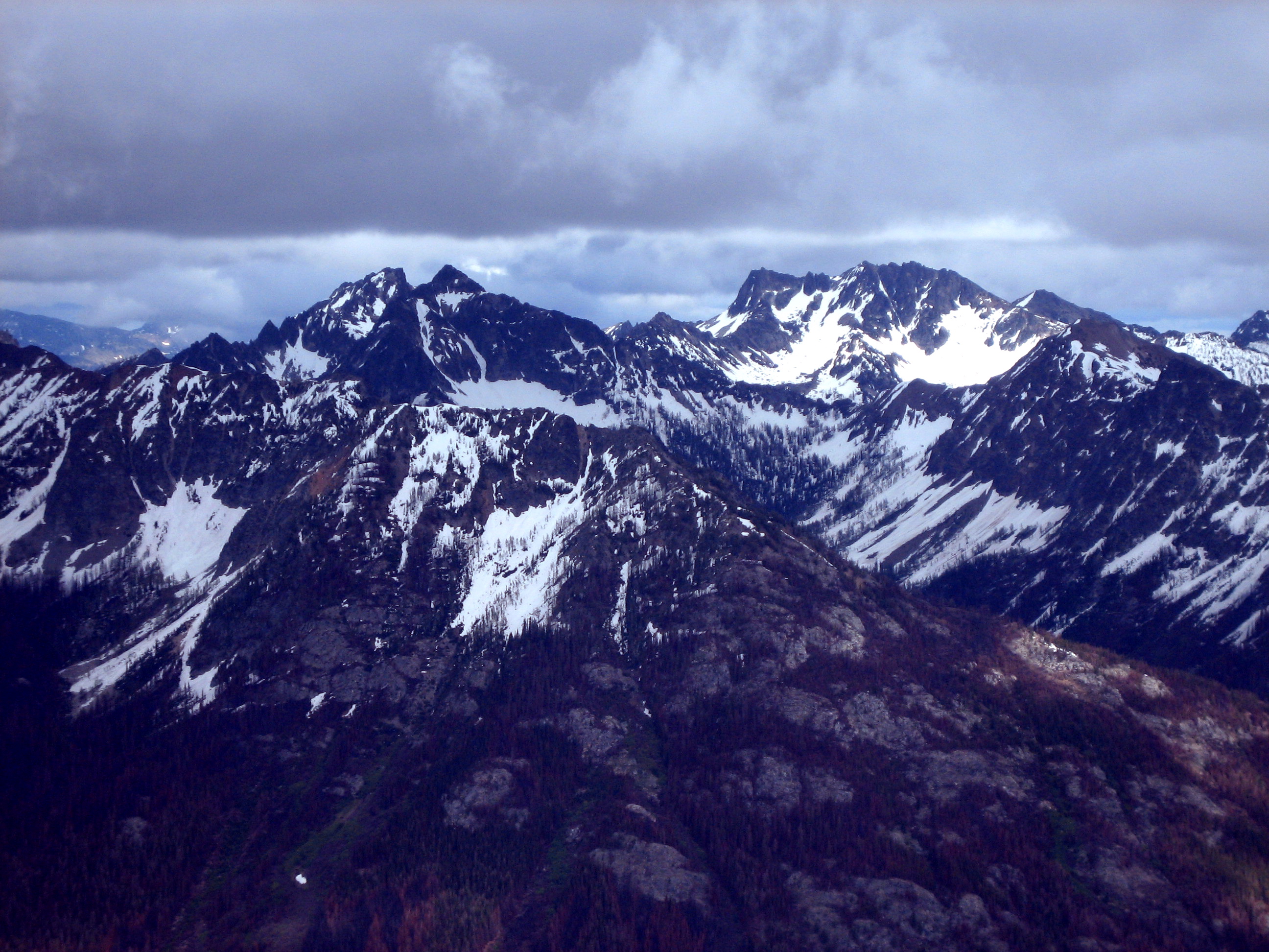 On an overcast Saturday, I did a climb of Chilly Peak in the Entiat Mountains with Steve. This is the point shown as 7968′ on old 15-min maps and as 7920’+ on newer 7.5-min maps. John Roper suggested the name “Chilly Peak” because it could be readily combined with an ascent of nearby Carne Mountain, thereby giving the possibility of doing….you guessed it…..Chilly con Carne. I can hear you climbers groaning over the pun, but this turned out to be a dandy alpine peak with an attractive pyramidal summit and a marvelous view of the Ice Lakes bowl.
