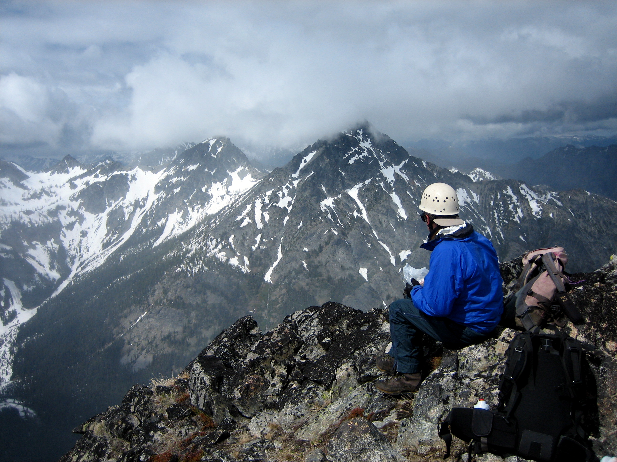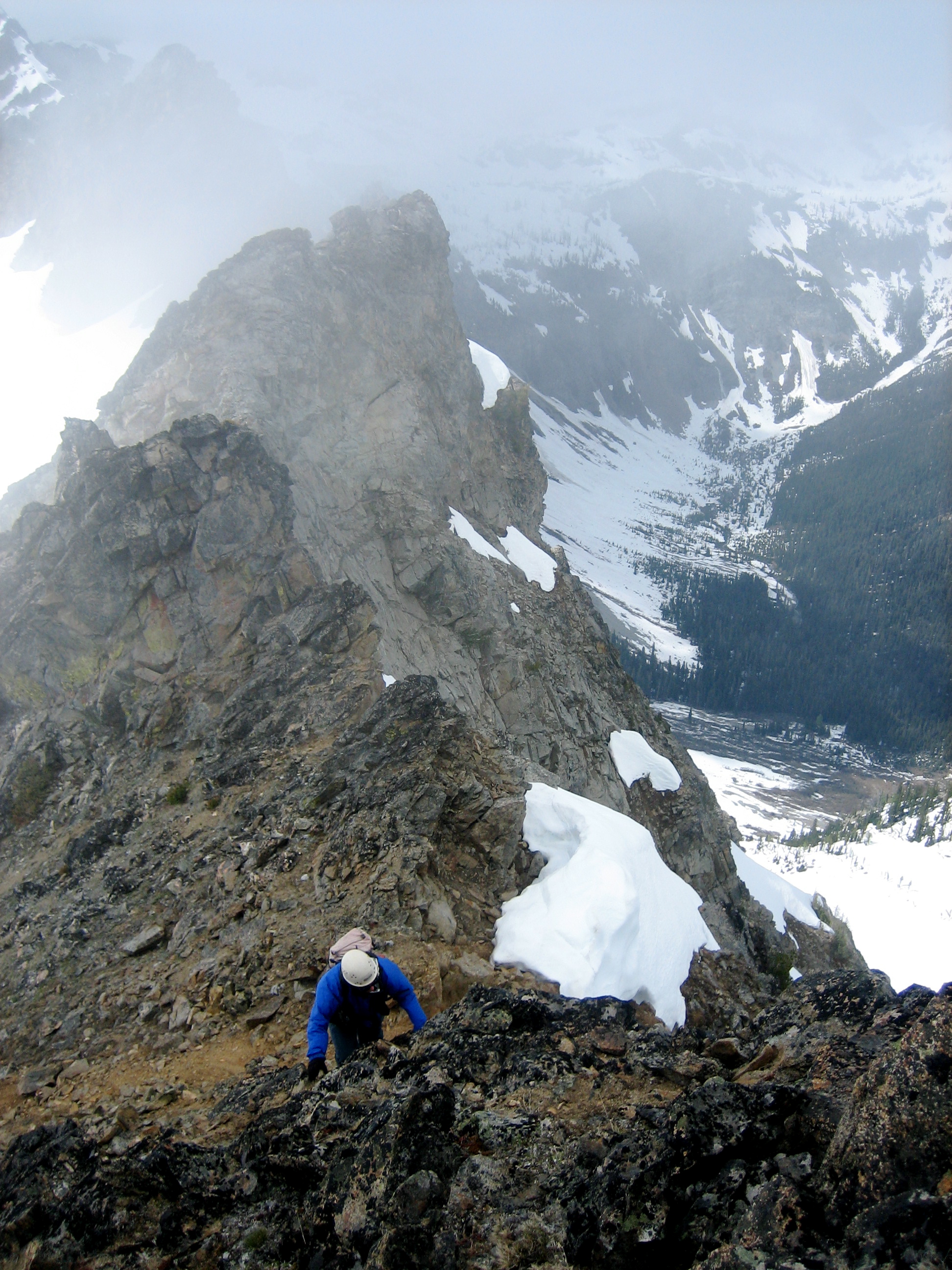 The summit pyramid was a short, pleasant Class 2-3 scramble. There appeared to be remnants of a summit cairn but no register, so I left one of mine.