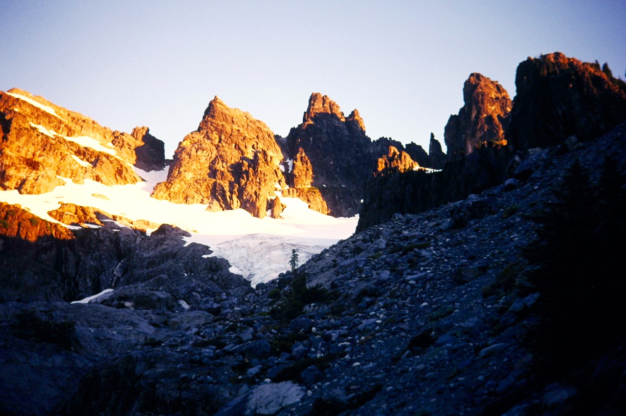 Jim and I started out on the Pete Lake trail around 3:00pm Friday afternoon. The trail is dusty, but is in great shape. We left the trail at the first switchback in the avalanche path, just as Beckey’s book mentions, and proceeded up the Chimney Creek drainage to our base camp. There is a climber’s trail that begins at an obvious logjam that provides an excellent creek crossing. It is faint to start, but becomes more well-defined. Beckey describes the climber’s trail as 200 yards into the forest from the avalanche slope; however, we found that the trail is only about 20 yards inside the forest, adjacent to the avalanche path. It is marked in places with orange flagging. We bivied on the top of a high rock buttress that we named “Sunrise Knob” (4.5 hours from TH), just below the moraine and overlooking the waterfalls. The multiple peaks of Chimney Rock tower overhead.