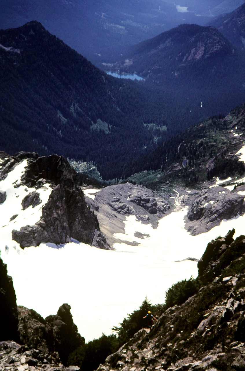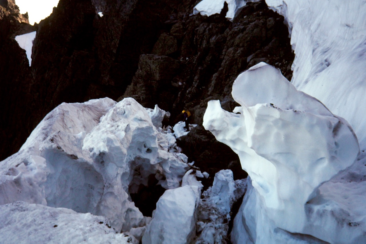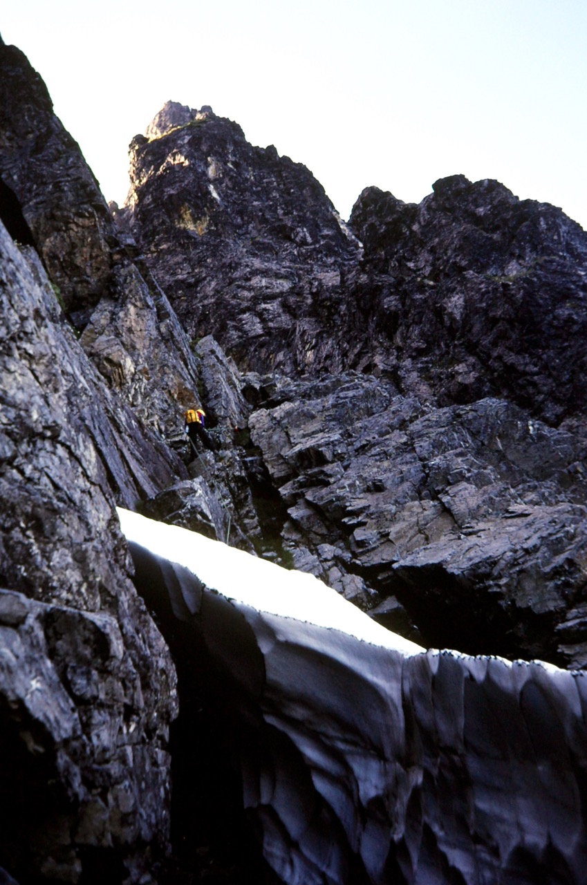 The descent was as much of a challenge as the ascent, but fortunately there were good rappels (using a single 165-foot rope) from the summit to the broad ledge. From the broad ledge, downclimbing to the gully is very feasible, with a short up-climb to the Main Notch. This was followed by a long down-climb of the third class ledges, two rappels near the base of the rock over the wet fourth-class sections, and a final third class downclimb to the bergschrund.