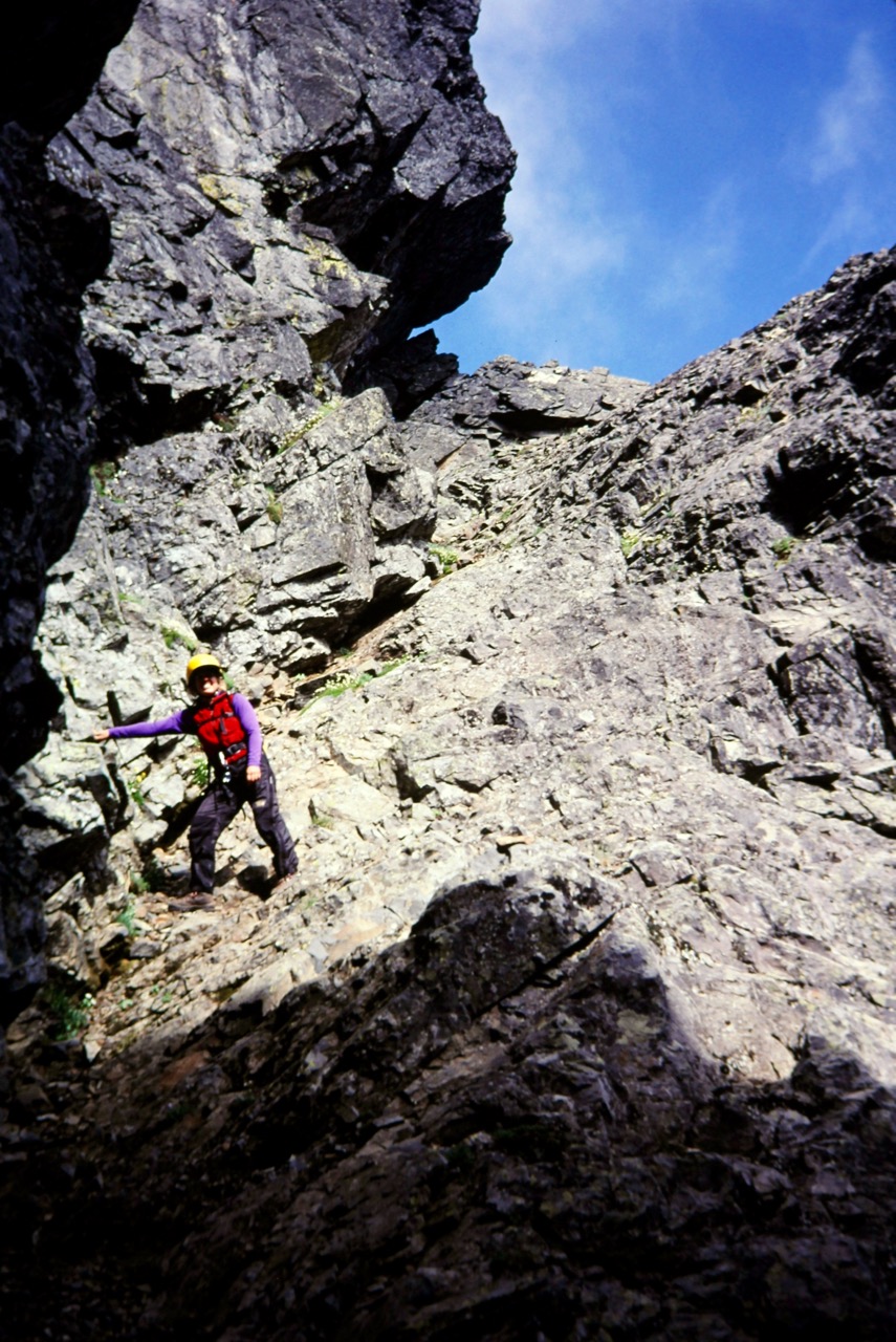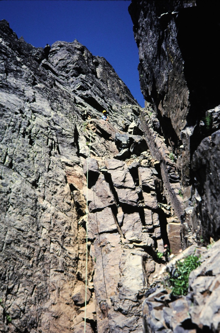 An even easier way to access this small notch is to downclimb from the Main Notch about 50 feet and look toward the Main Peak – a fairly obvious reddish ramp (third/fourth class) leads up to this small notch. When we reached the broad ledge, we changed into rock shoes. From here, the route was fairly obvious – starting in a shallow slot.