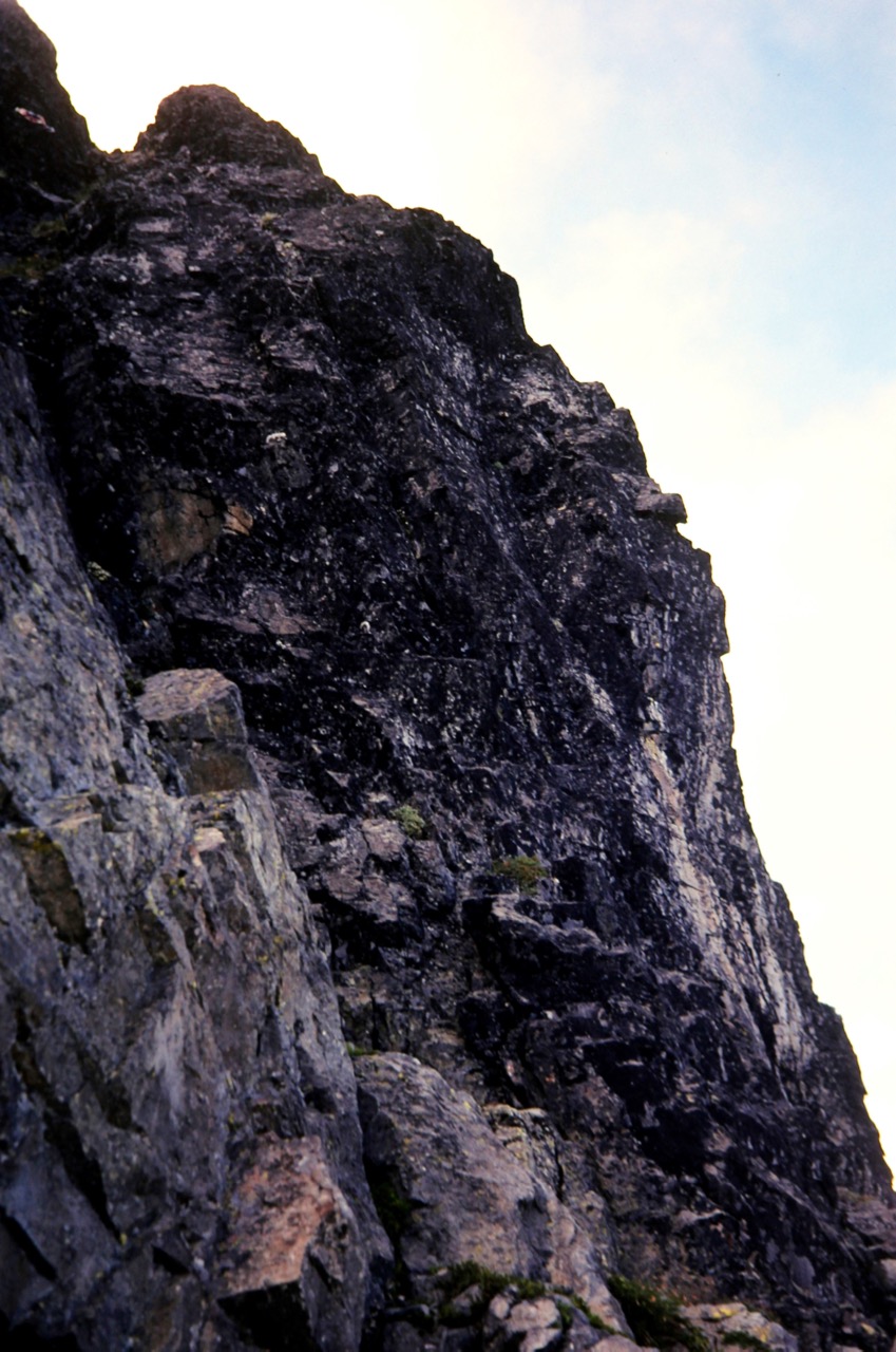 This pitch has some low-fifth-class moves on generally sound rock with decent protection (slings, stoppers, and some 1/2 and 3/4 inch cams). The second pitch starts with a short traverse across a small, heathered ledge and then continues up a very exposed fourth-class face.