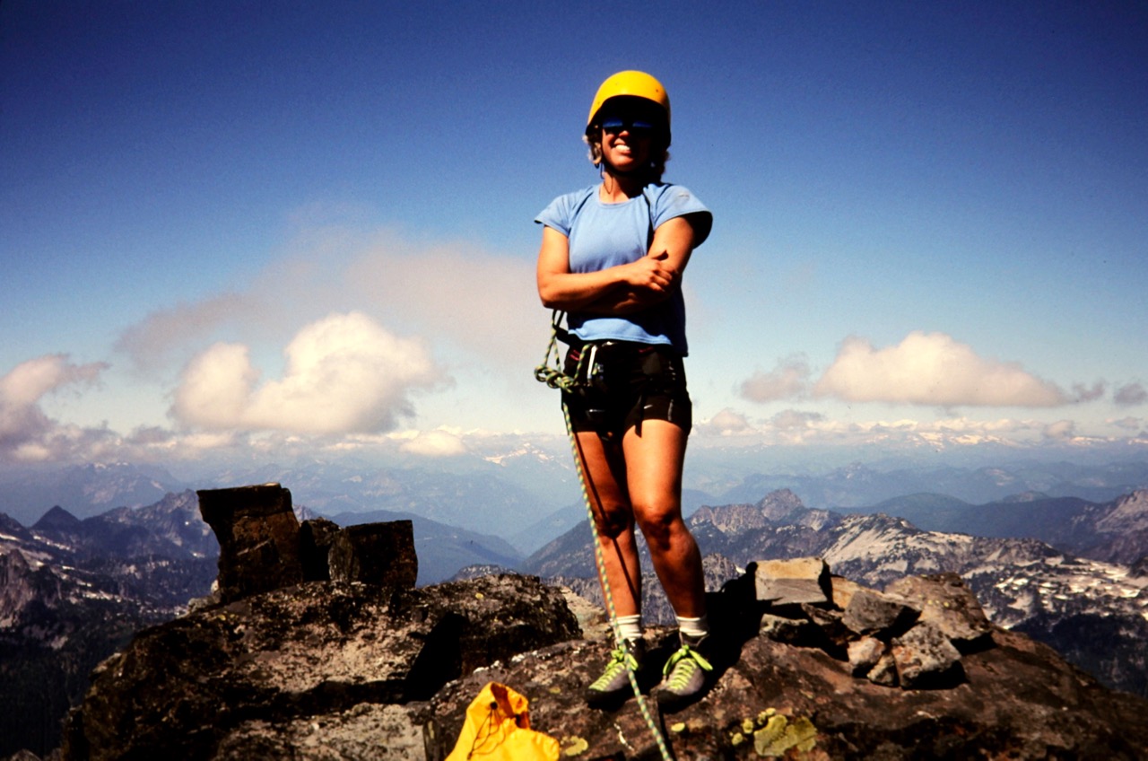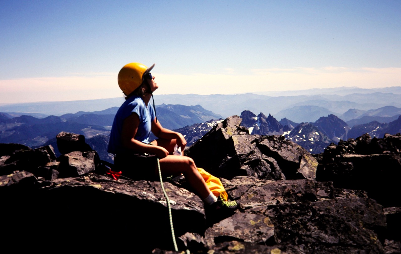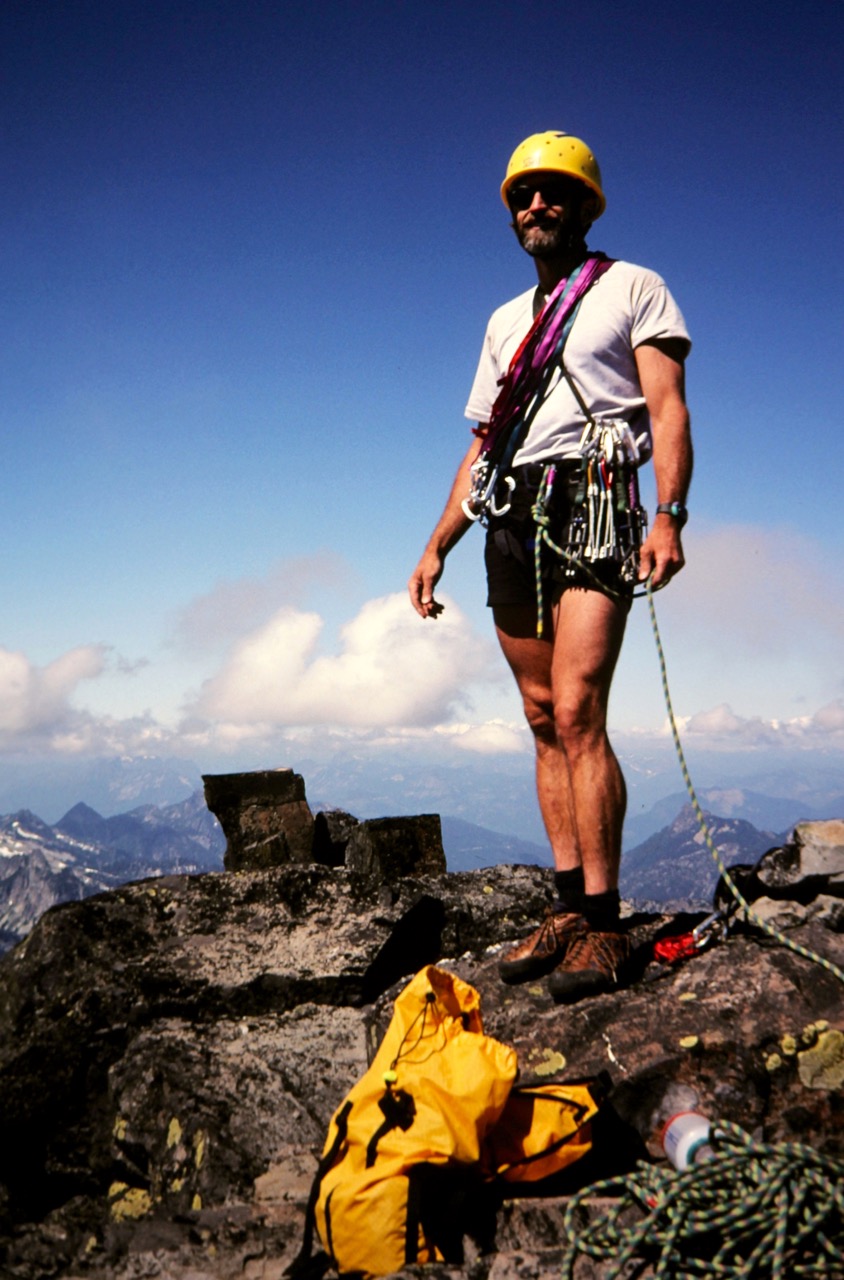 The last pitch ends in a delightful low-fifth-class chimney that tops out just a few feet from the summit cairn. We were on top at 4:30pm (8.4 hours from camp).