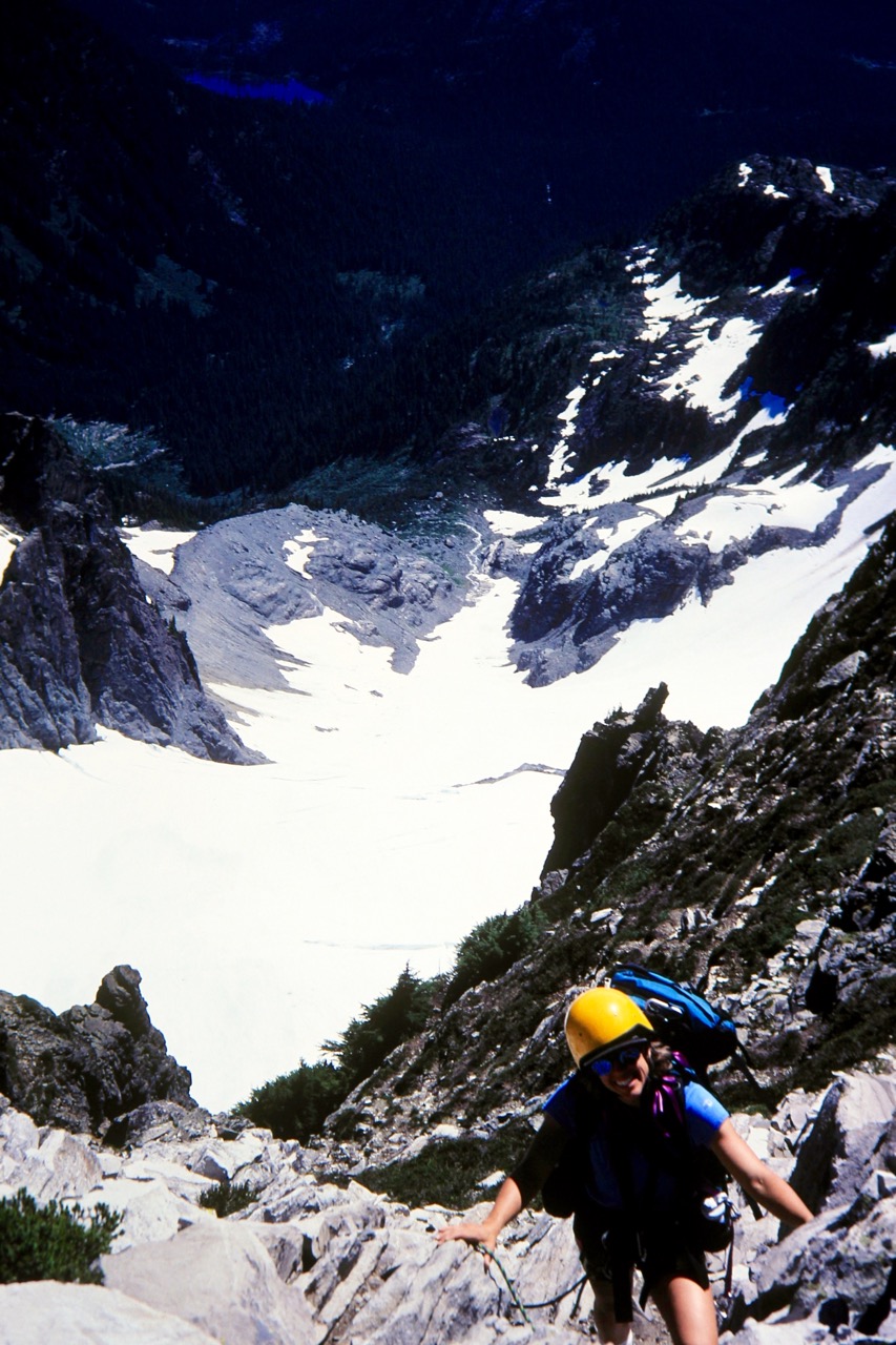 We arrived at the notch about 1:00 pm, with 600 vertical feet of climbing behind us. With an additional 400 vertical feet to the summit, we decided we didn’t have the time to reach the Main Peak summit and safely descend, so we traversed across a series of ledges to the South Peak (4.9 hours from camp), which is a worthy summit in its own right. Standing atop the small pinnacle, we took in the view of Rainier, the Stuart range, the Olympics, and other notable peaks.