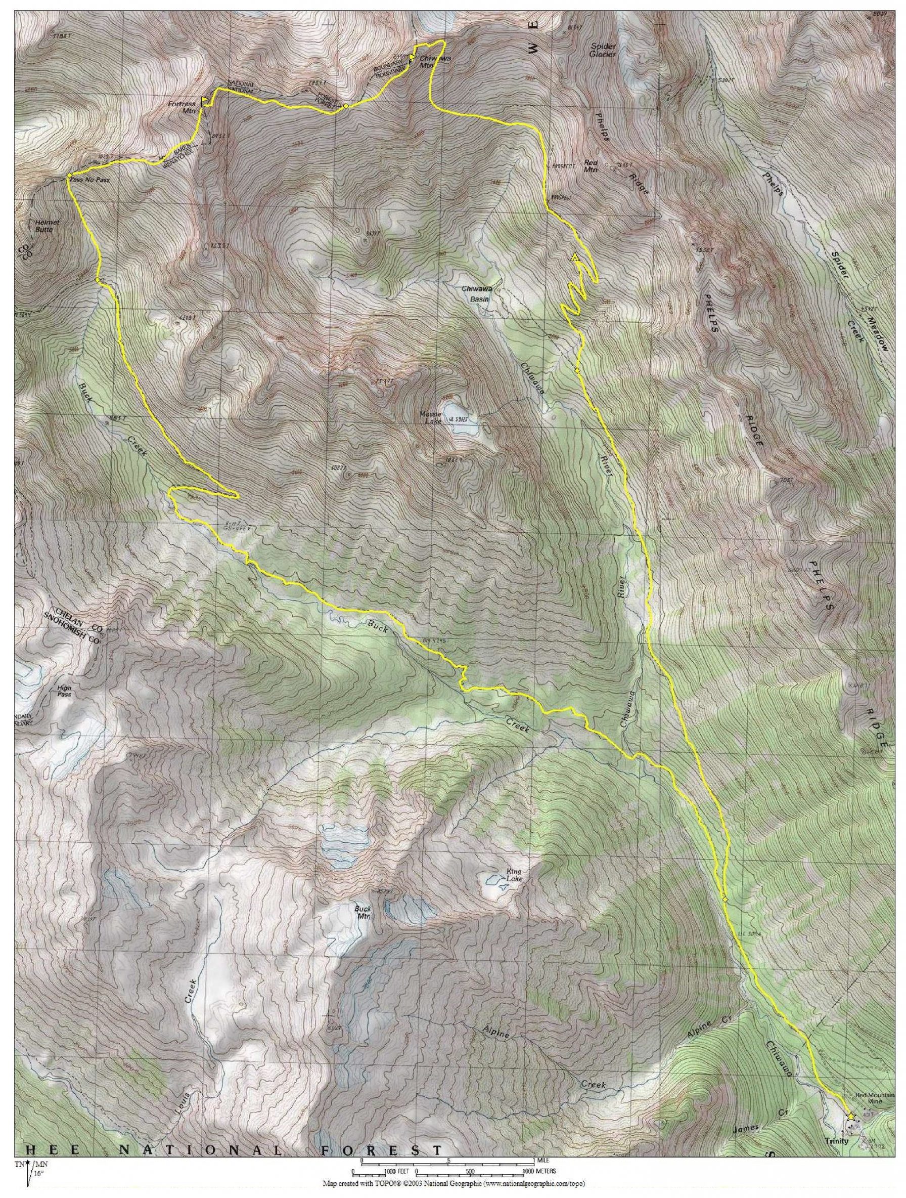 Way Points: Phelps Creek Bridge & Chiwawa River & Buck Creek Trail junction & Chiwawa Basin Trail junction & Red Mountain Prospects & Chiwawa Mountain summit & Chiwawa–Fortress Saddle & Fortress Mountain summit & Pass No Pass & Buck Creek Basin & Buck Creek & Chiwawa River Bridge (trail hike & snow climb & rock scramble)