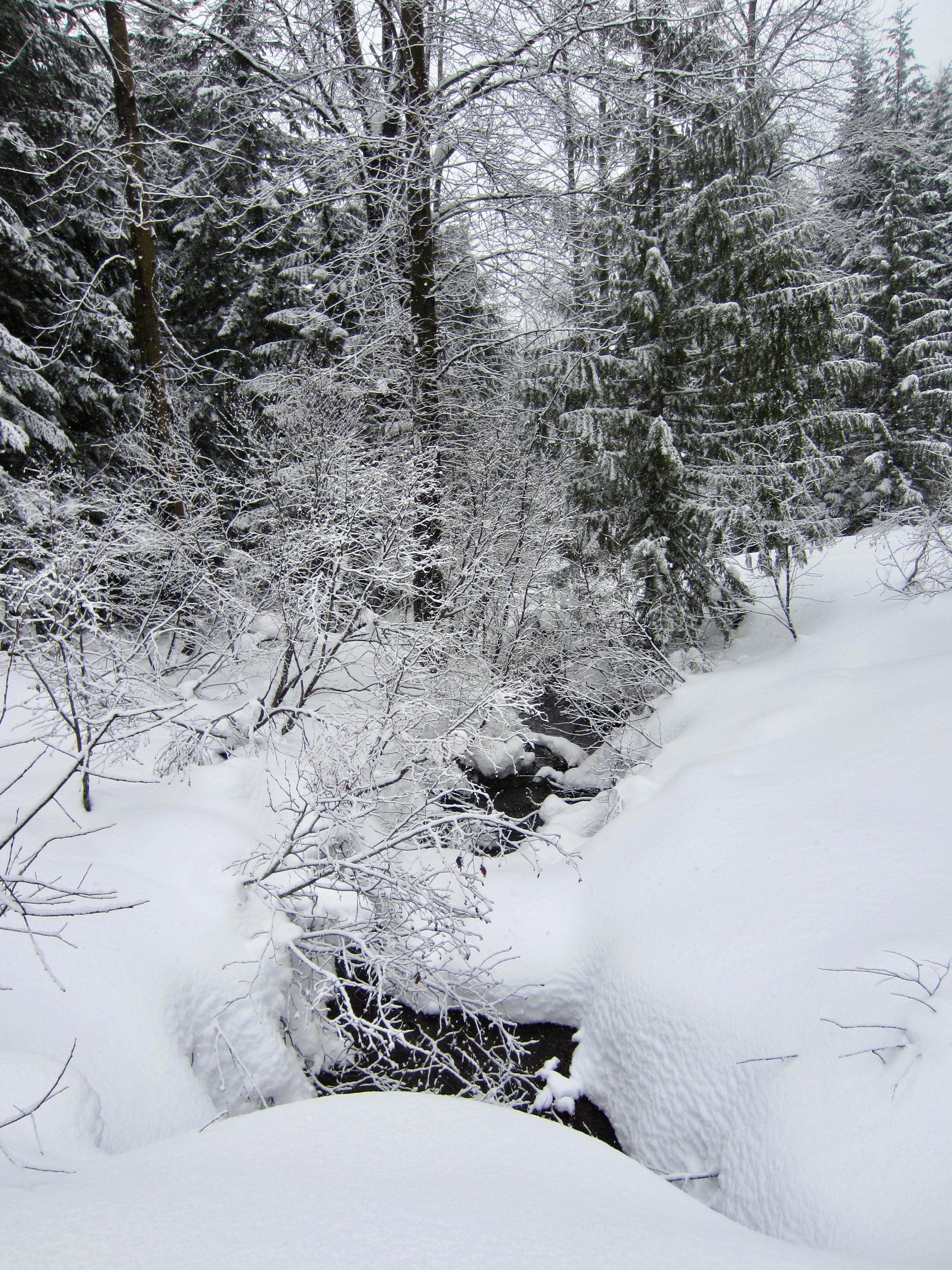 Goat Peak Road descends several hundred yards to a culvert crossing of upper Cole Creek, then it re-ascends a short distance to reach another unmarked fork. This fork represents a decision point for skiers and snowshoers. If your destination is Cole Creek Pond, take the right-hand (uphill) fork. If your destination is Cole Valley Overlook, take the left-hand (downhill) fork.