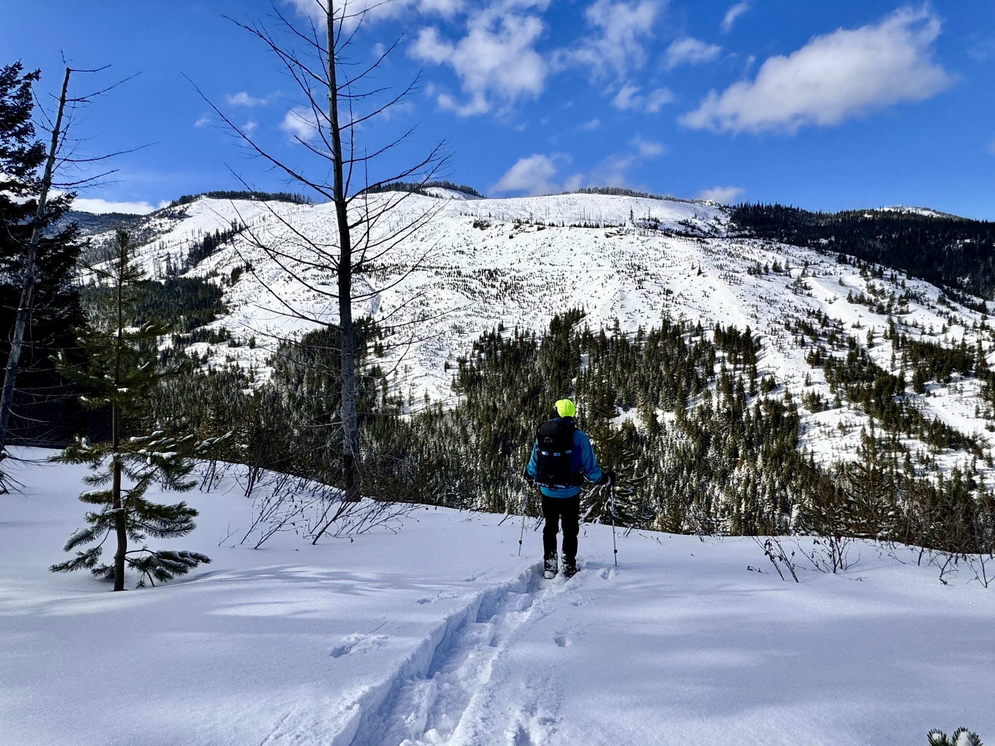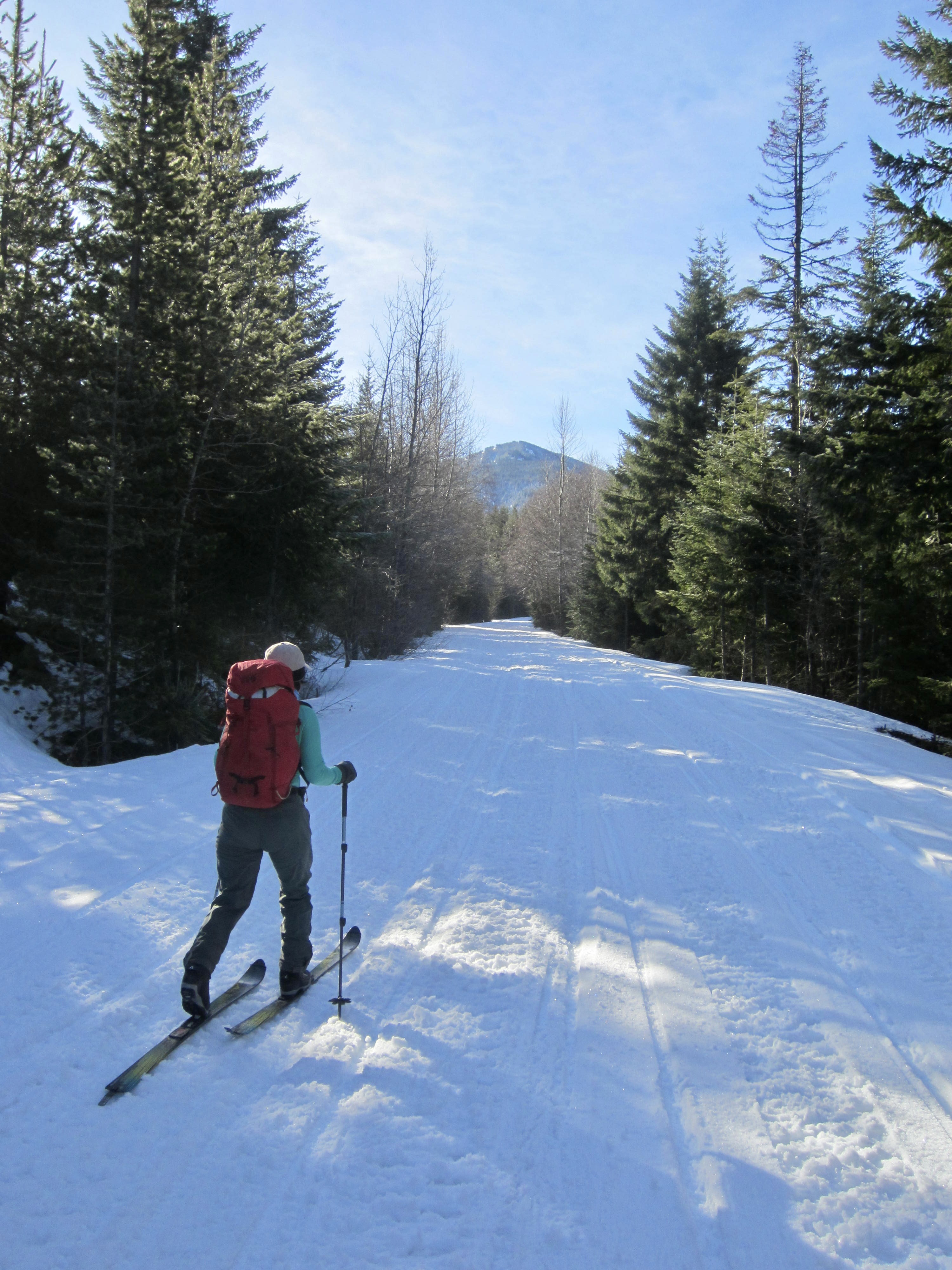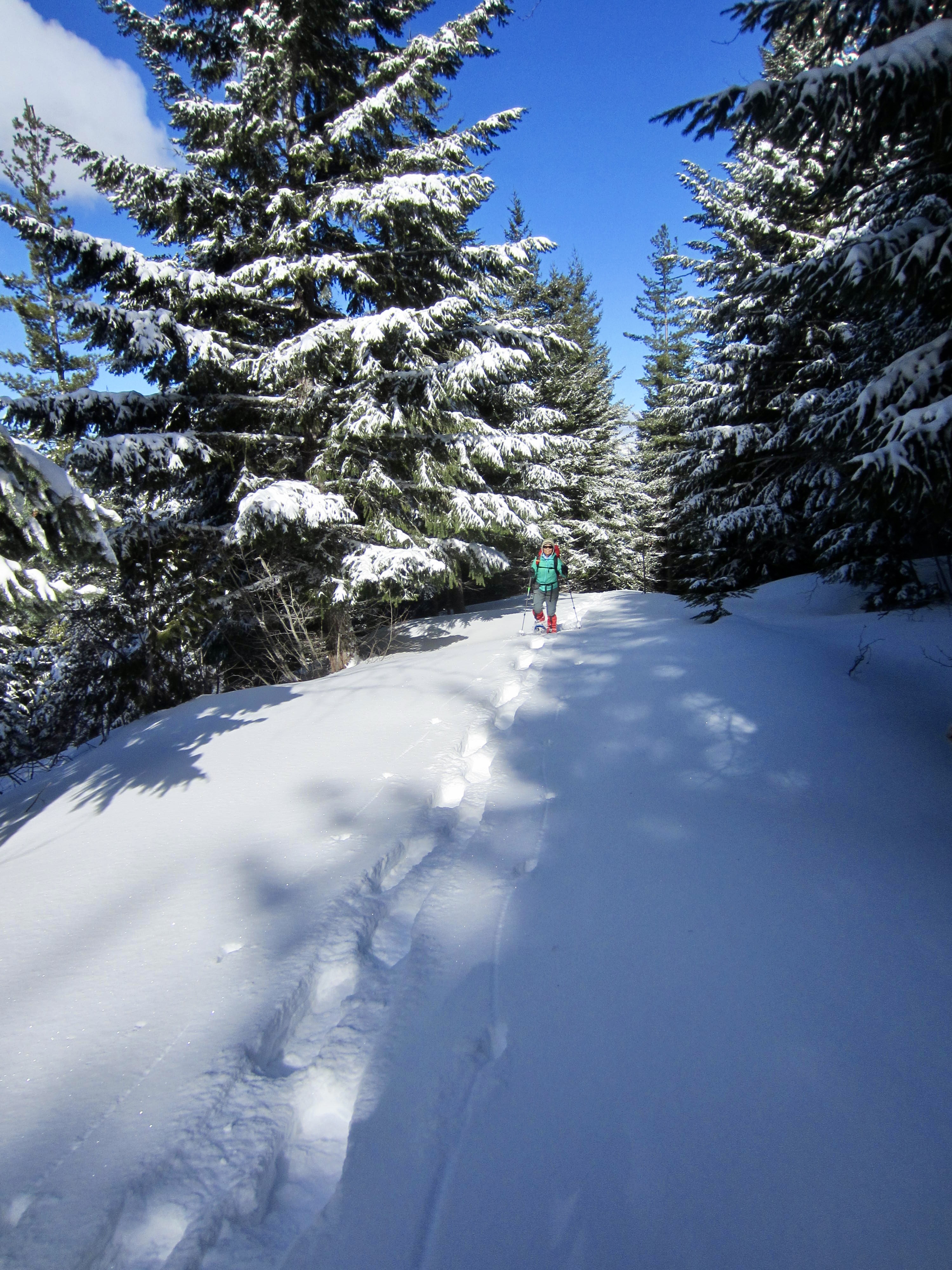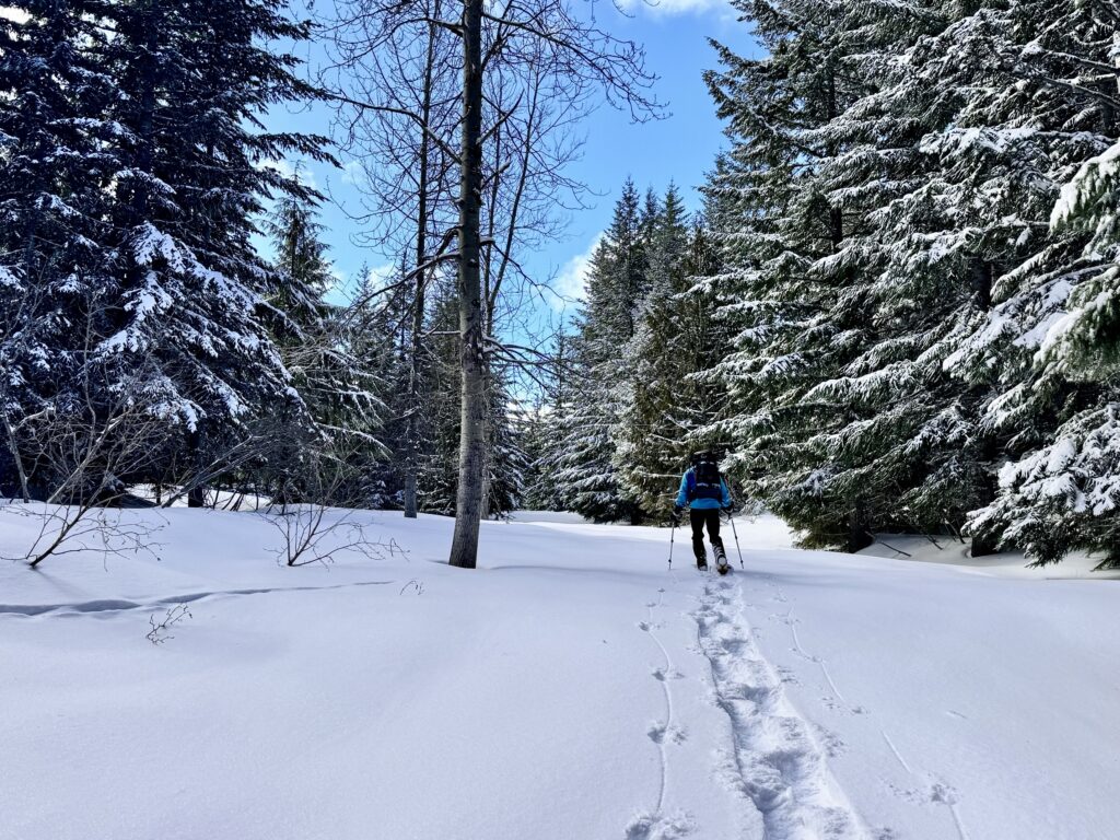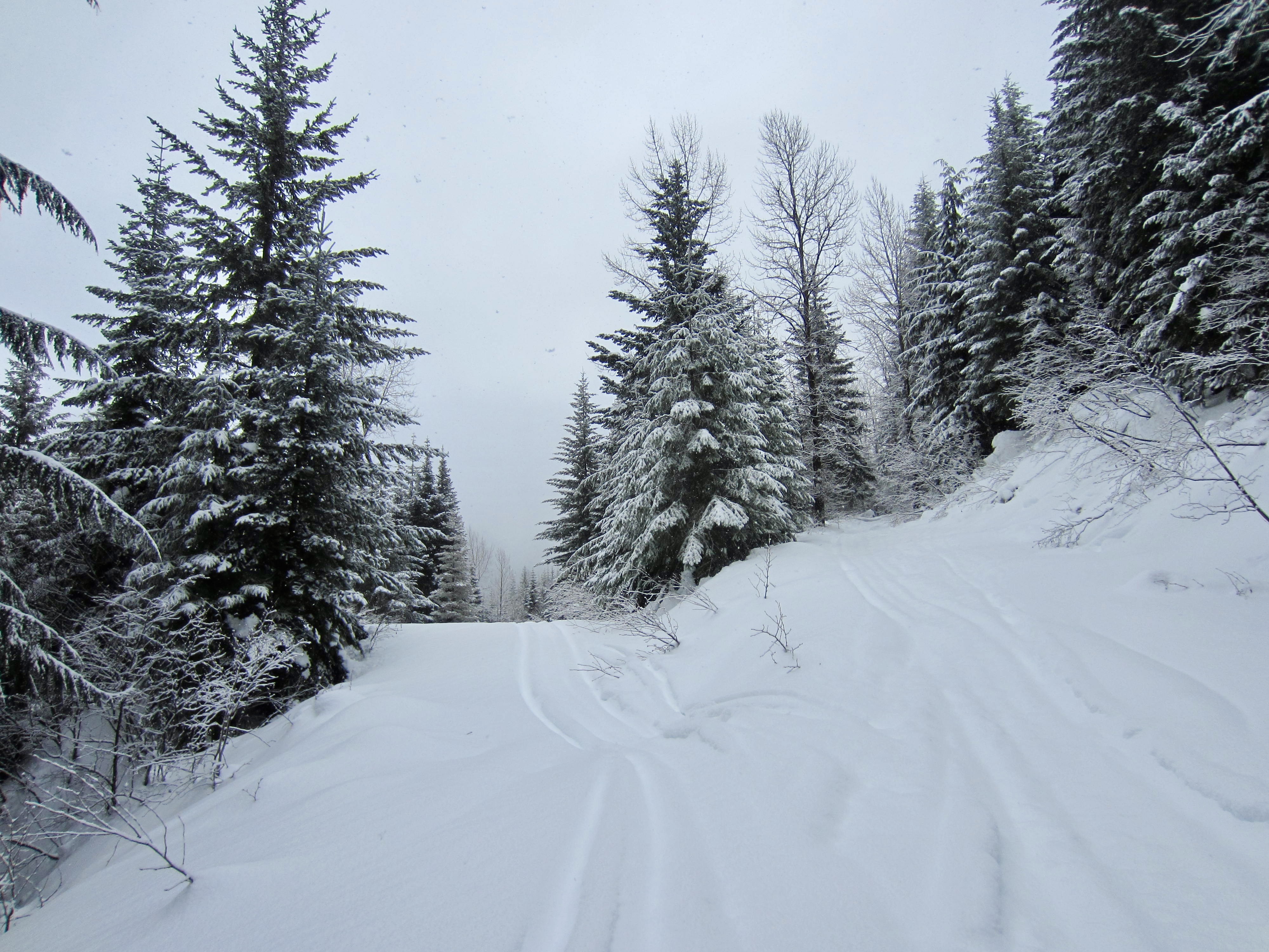 Cole Creek Road initially makes a steep climb through deep forest and then eases back a bit as it proceeds in a southerly direction, passing two spur roads along the way. Weekend snowmobile traffic keeps the snow pretty well packed down, but you might encounter annoying “washboard” sections. Occasional gaps in the trees offer views of Goat Peak and Cole Butte Benchmark over to the east.