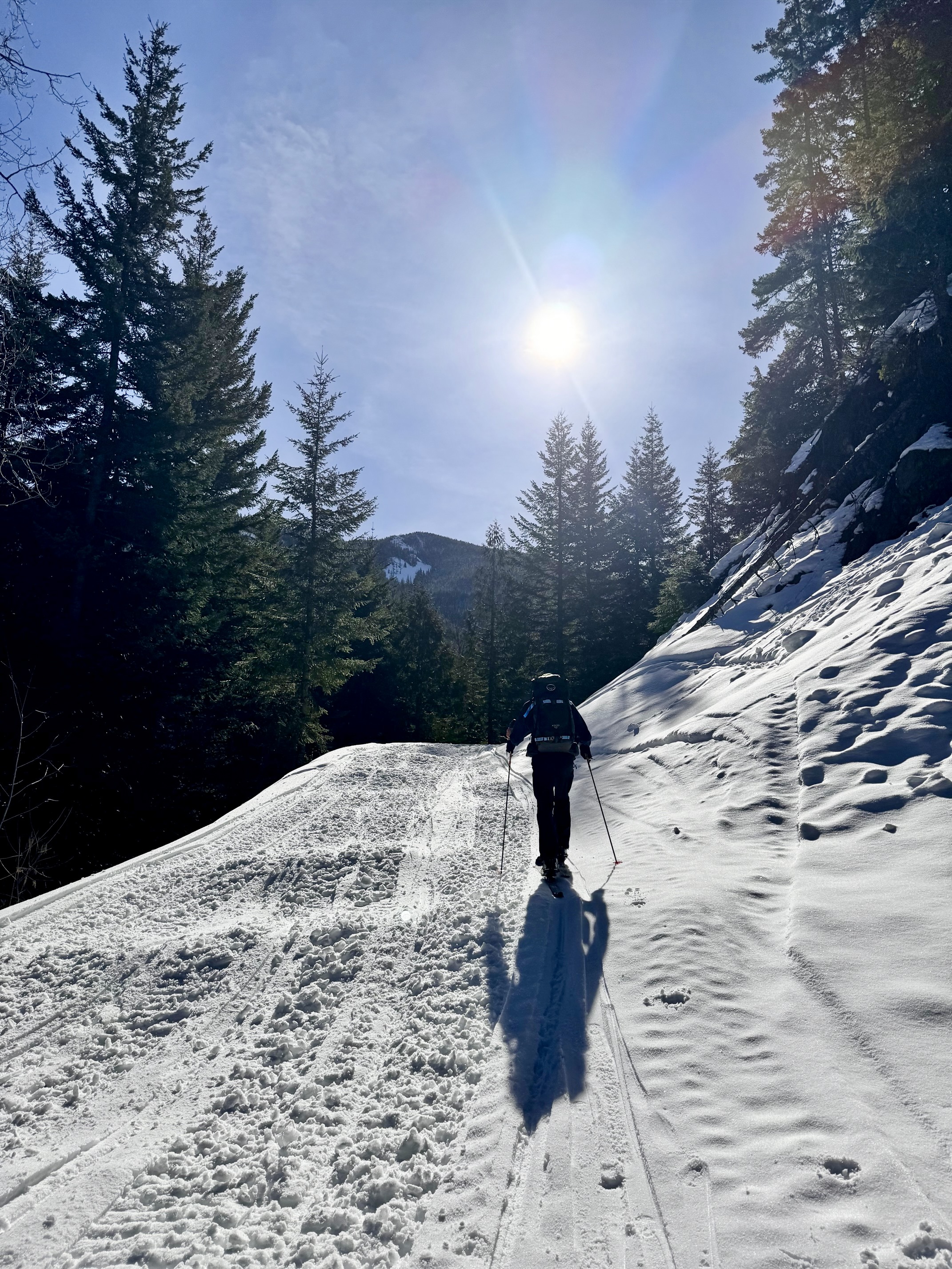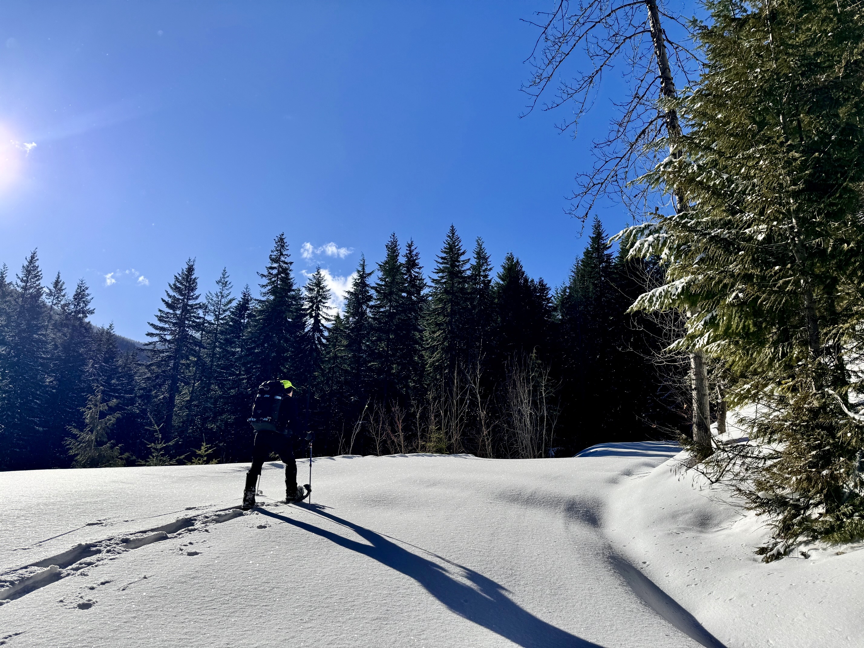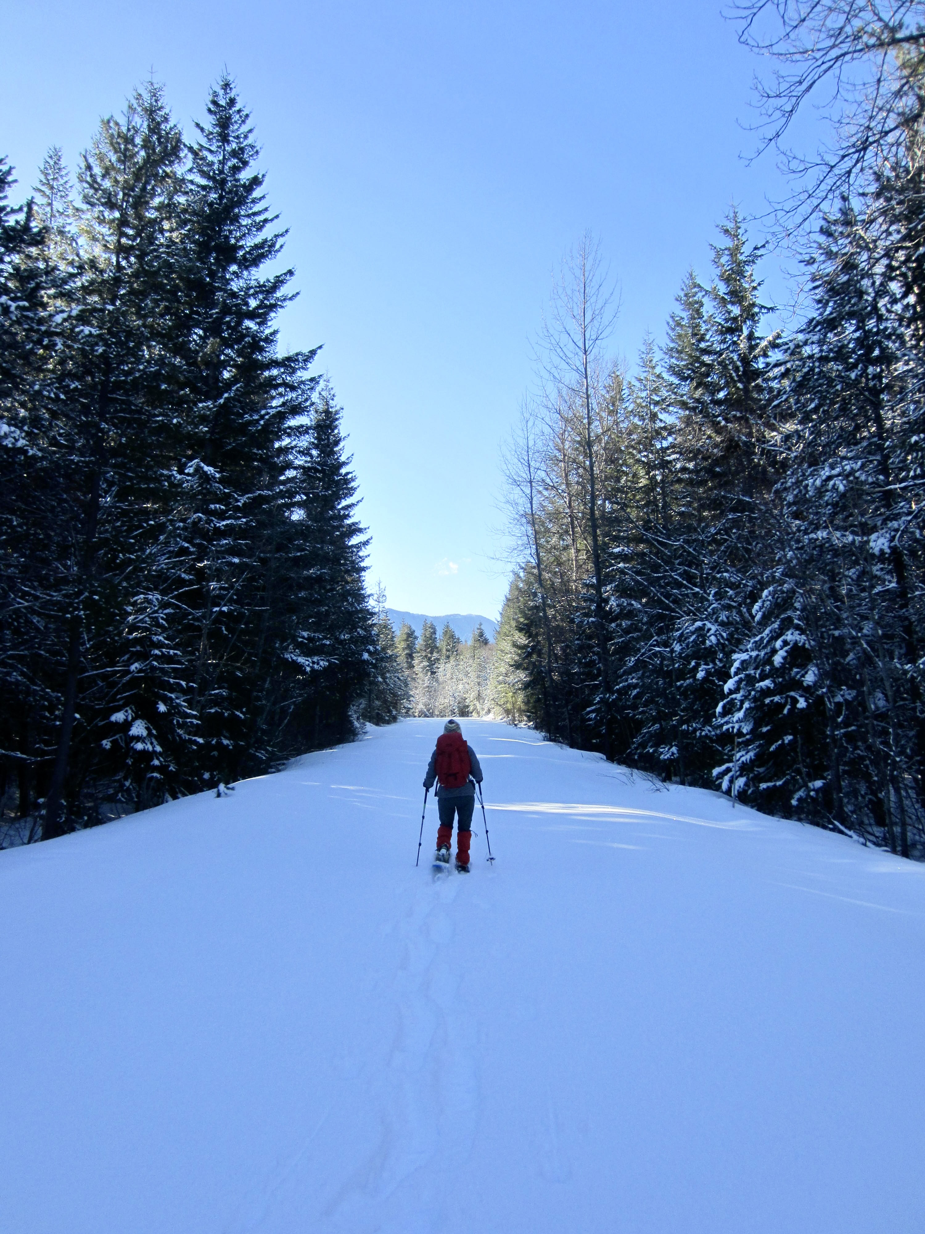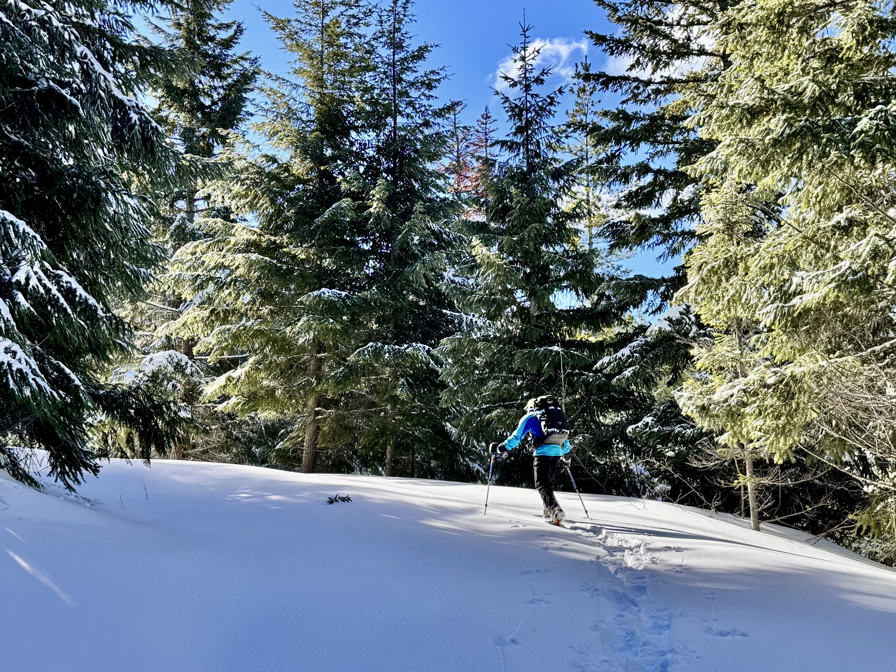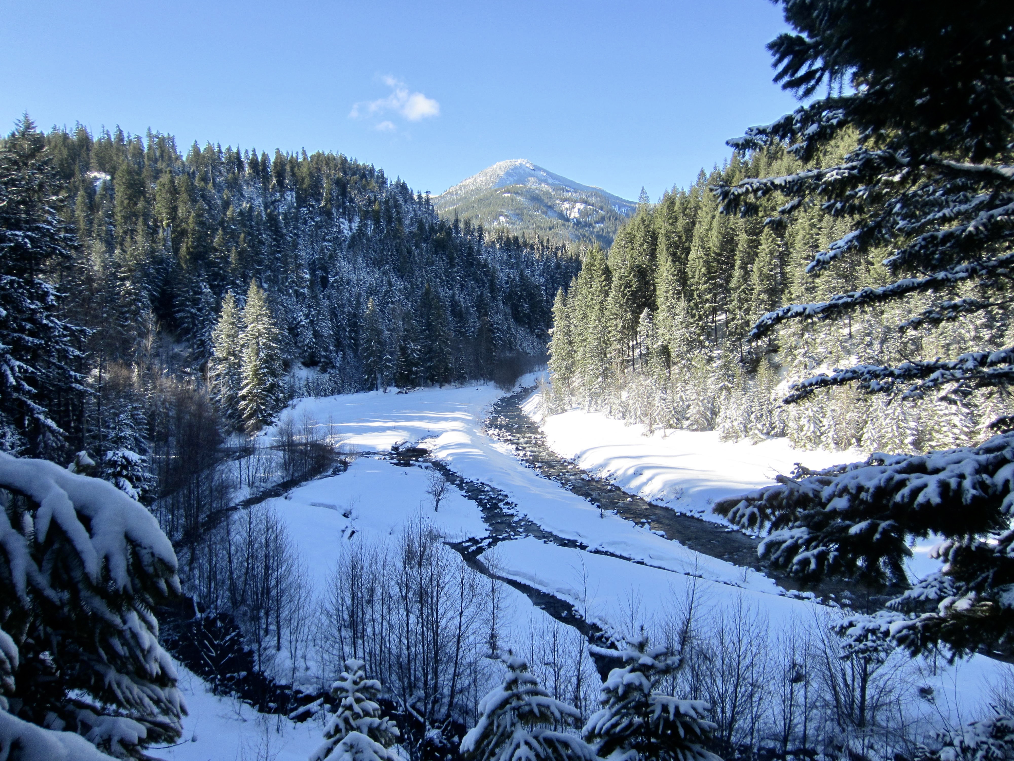 Cole Creek Road initially makes a steep climb through deep forest and then eases back a bit as it proceeds in a southerly direction, passing two spur roads along the way. Weekend snowmobile traffic keeps the snow pretty well packed down, but you might encounter annoying “washboard” sections. Occasional gaps in the trees offer views of Goat Peak and Cole Butte Benchmark over to the east.
