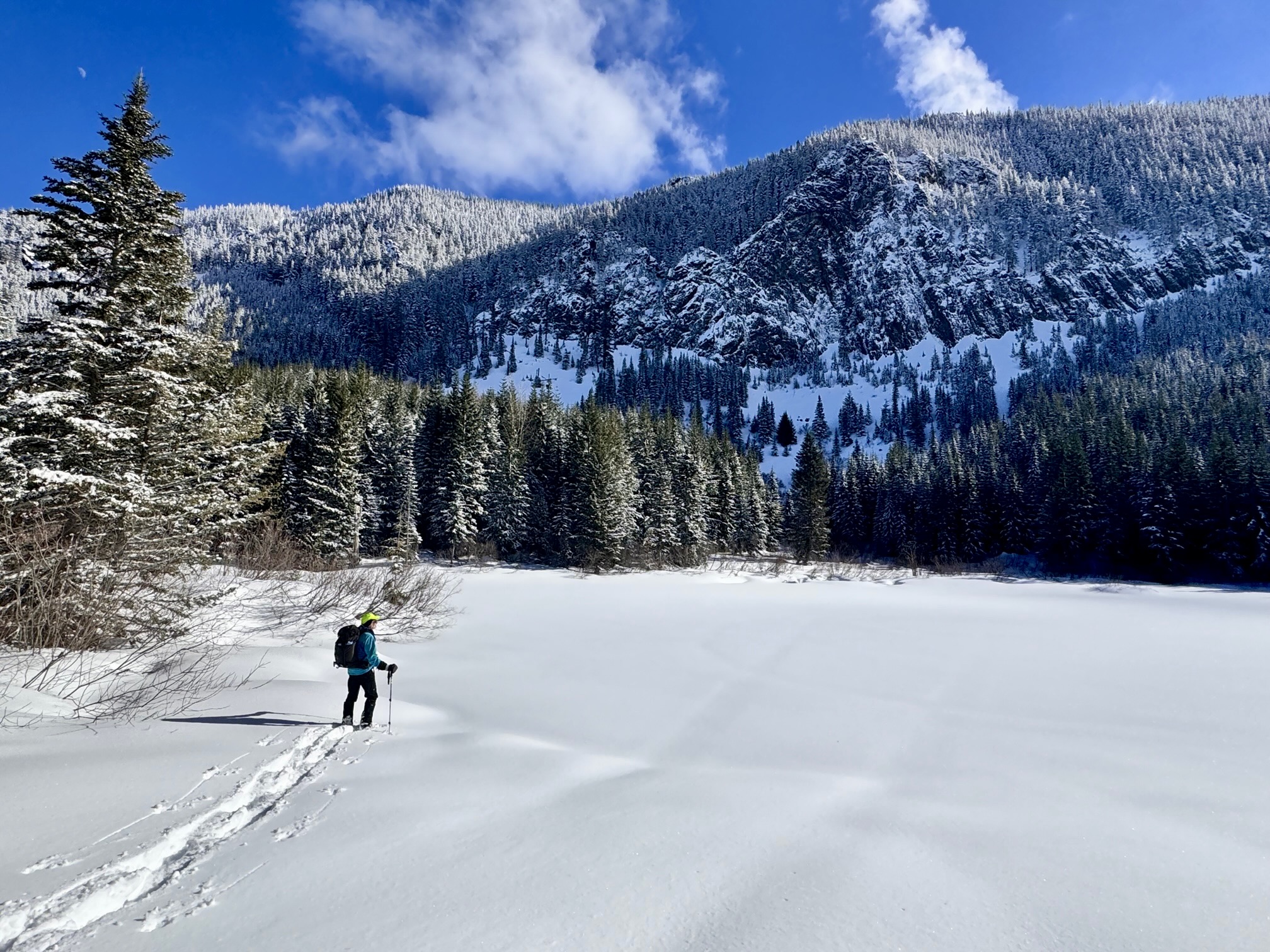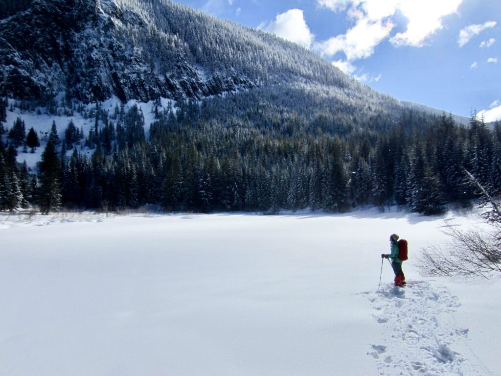 After an additional ⅔ mile, the road tops out on a gently sloping bench with delightfully open terrain (4.3 miles + 2050 feet from sno-park). Through the trees to your left is Cole Creek Pond, which sits at the base of an impressive triangular cliff. Through the trees to your right is a striking view of Cole Butte across Cole Creek Valley. Your only decision now is where to eat lunch; do you want a valley view or a lake view?