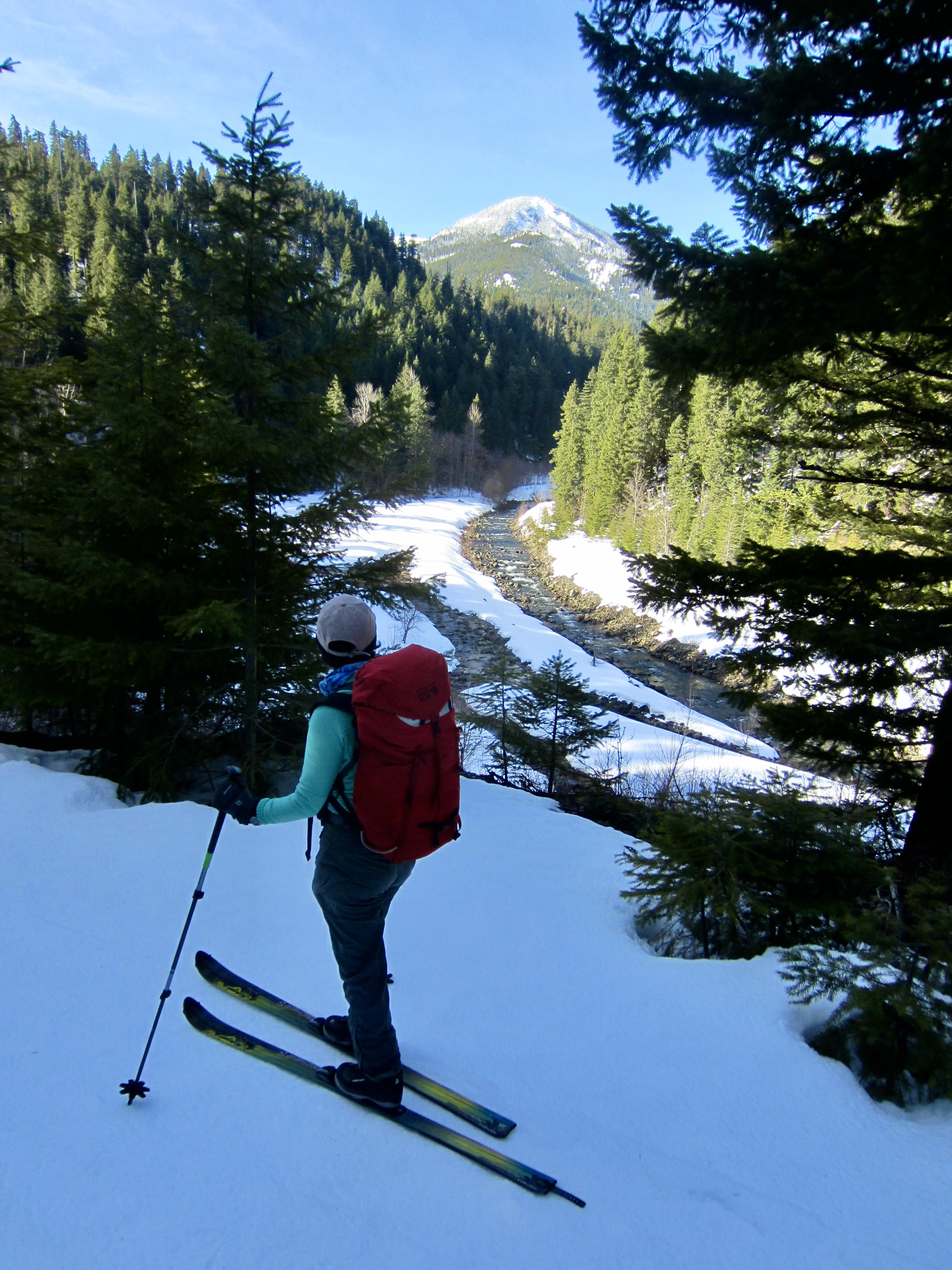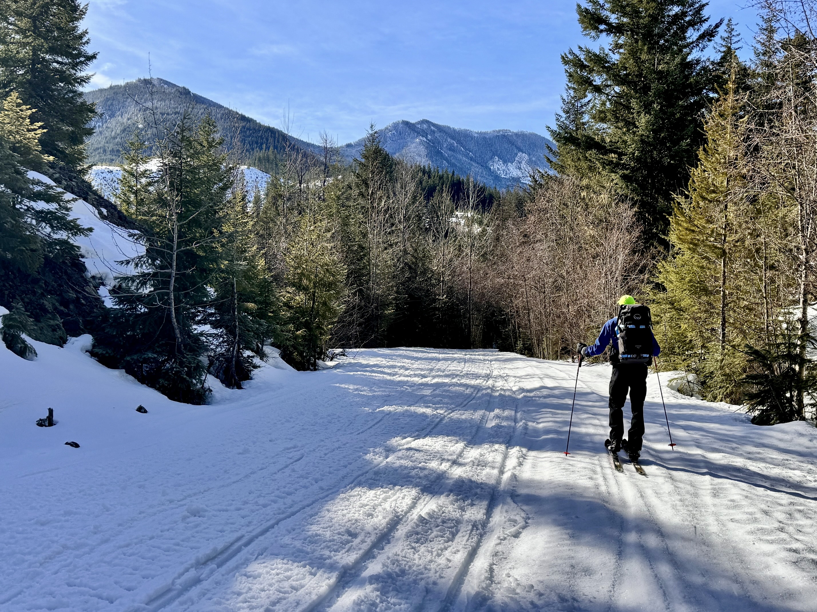 From Easton Reload Sno-Park, start skiing or snowshoeing southward on Cabin Creek Road. This road is very wide, fairly flat, and regularly groomed throughout the winter. In the first mile, it makes a gradual ascent over a low hump that overlooks Cabin Creek, with Cole Butte visible farther up-valley.