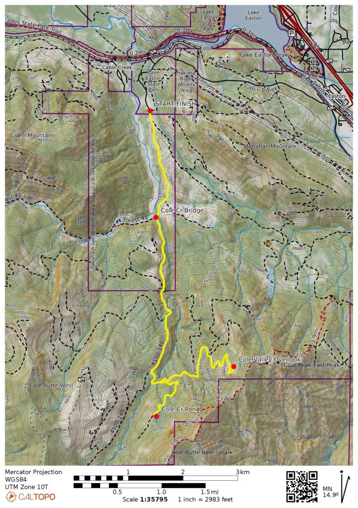 The following three subsections describe (1) the shared route from Easton Reload Sno-Park to the Goat Peak Road fork, (2) the continuation route to Cole Creek Pond, and (3) the continuation route to Cole Valley Overlook.