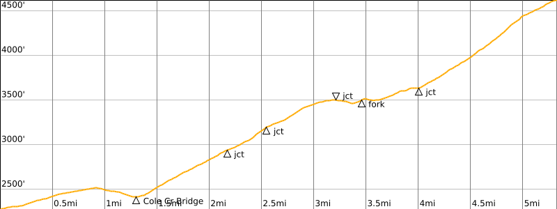 Approximate Stats (round trip): 10.6 miles round trip; 2650 feet gained & lost.