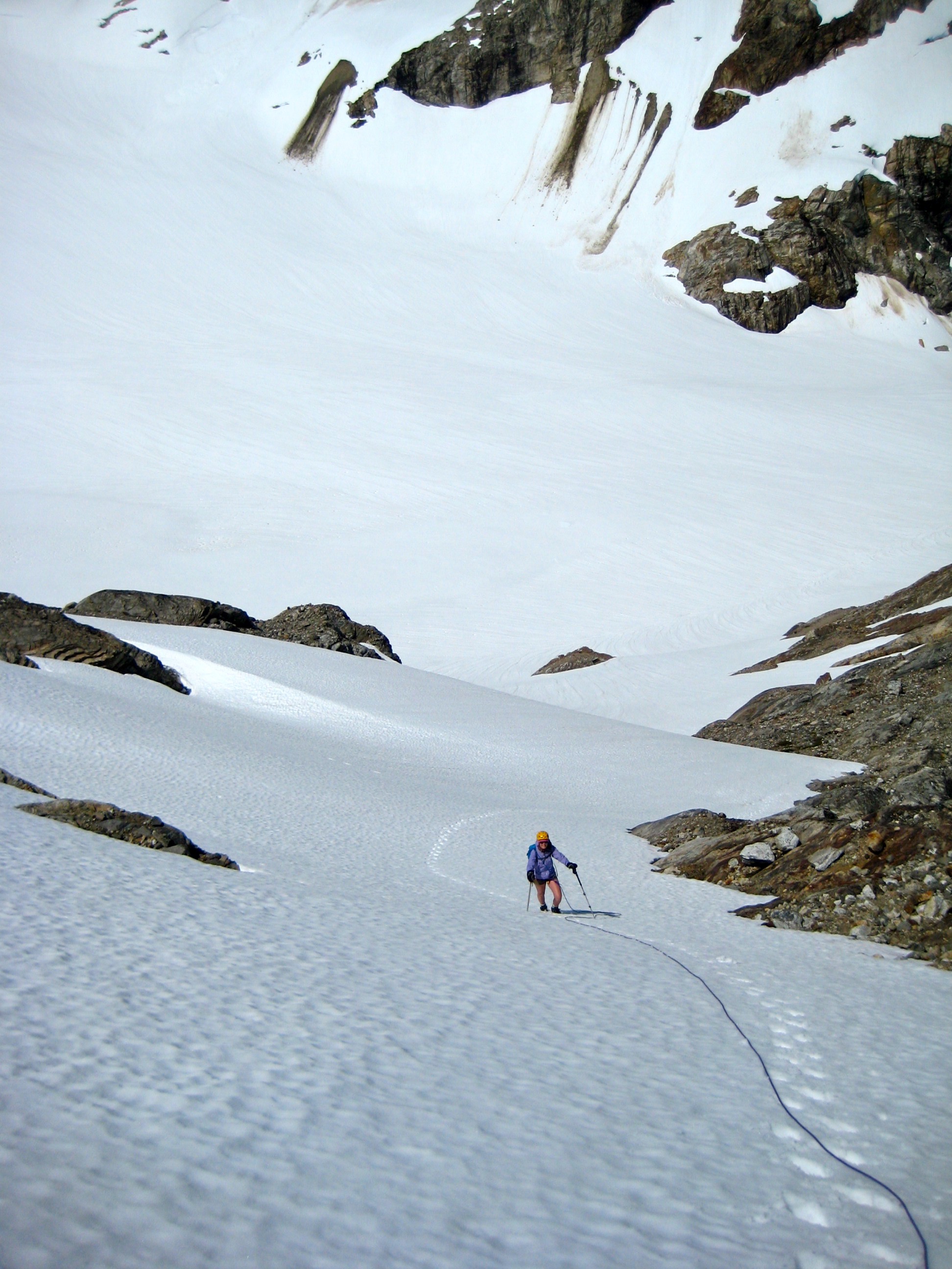 We dropped to the glacier and retraced our traverse route over to Pyramid Ridge, then headed down. A four-tent camp had been cut into the lee of the ridge, but there was no sign of activity as we passed by. Their early bedtime and well-coiled ropes hanging on well-positioned ice axes indicated a regimented climbing group.