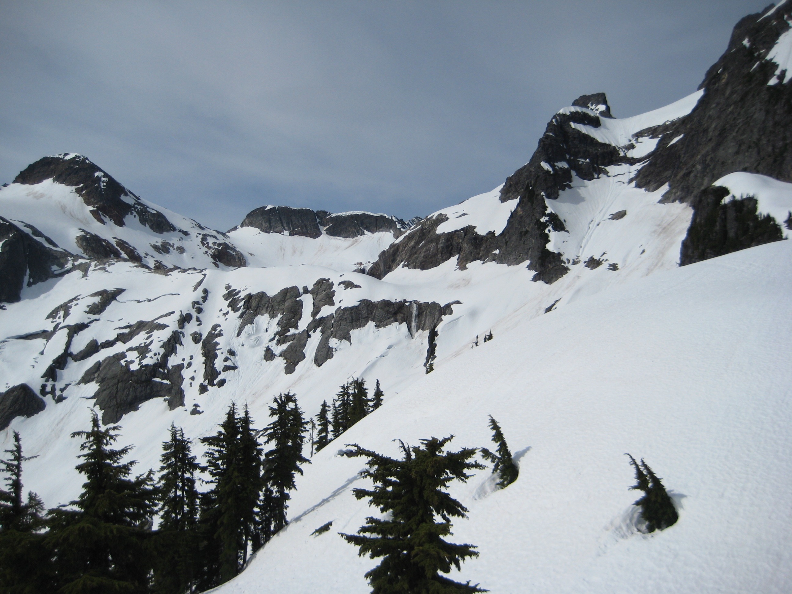 We headed up Pyramid Ridge, generally following the crestline over a series of cliff bands and snowy benches. Our route-finding was a bit off in places, so this part of the trip took longer than it should have to reach the ridge’s terminus below Pyramid Peak. Somewhere around mid-morning, we left the ridge and traversed steep snow over to the Colonial Glacier.