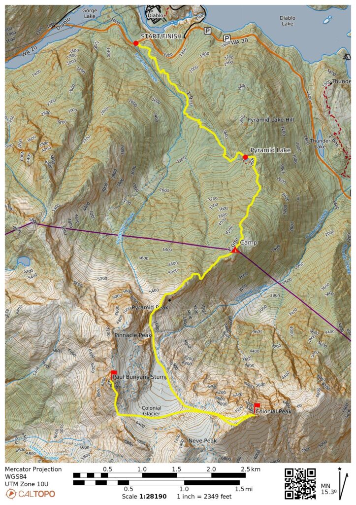 Paul Bunyan’s Stump, Pinnacle Peak, and Pyramid Peak enticed us from across the glacial cirque. We hoped to climb at least one of these alpine crags today.
