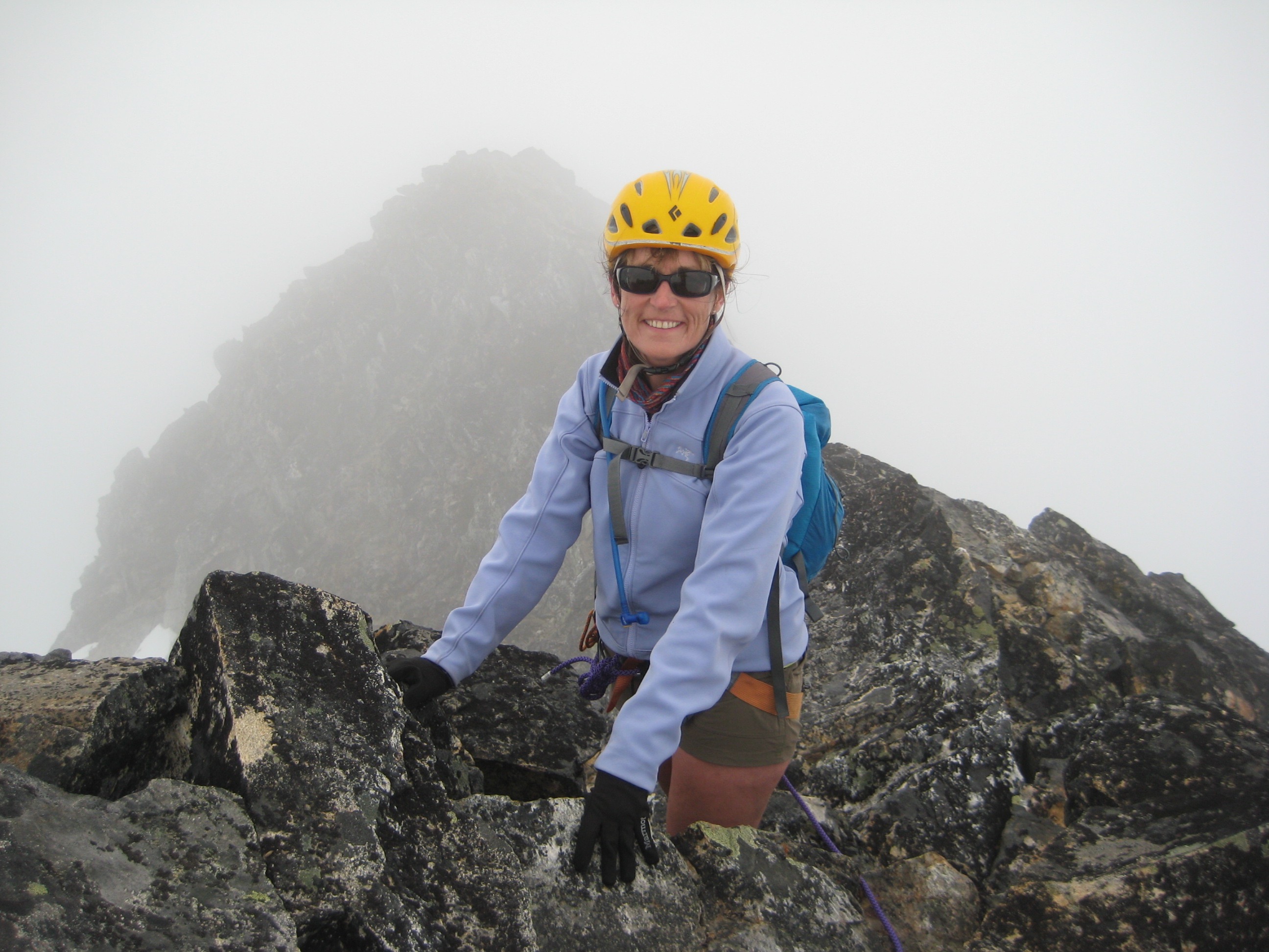 Naturally, a dense fog closed in on us just as we reached the start of the steep and serious scrambling. I had doubts about navigating in this fog, but Eileen switched over to I.F.R. mode and managed to find a way to the narrow summit ridge. We roped up for one short but severely exposed Class 3 rock pitch to the summit.