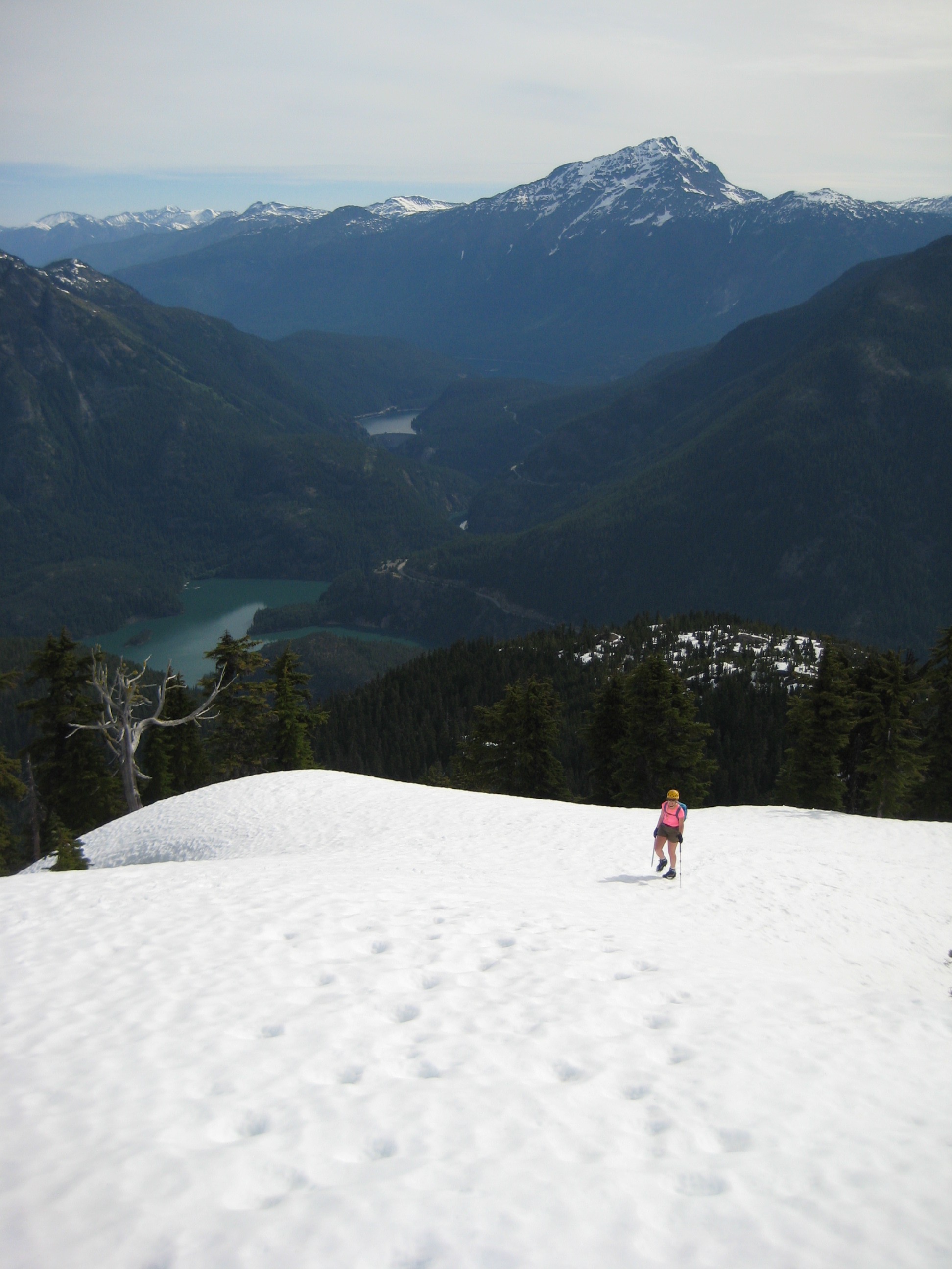 After working Friday morning, Eileen and I left town at noon and headed for the Pyramid Lake Trailhead on Hwy 20. We hiked past the lake and continued up Pyramid Ridge on a well-trodden climber’s path. Knoll 4555 provided us with a fine campsite (4.6 hours from TH) for the next two nights.