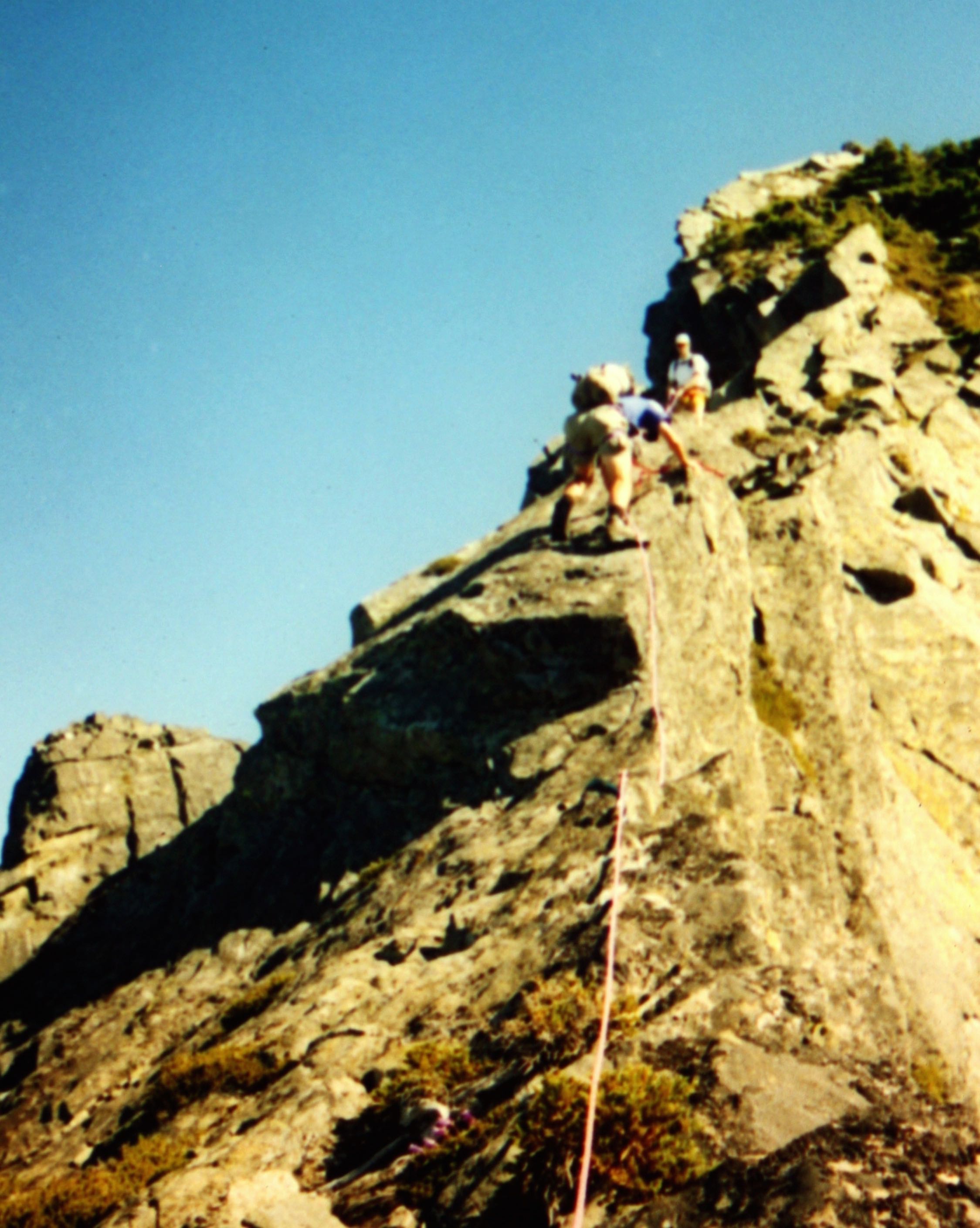 The lower portion of the summit ridge involved Class 2-3 shrubbery for about 100 yards, then a short segment of Class 2-3 rock. Rather abruptly, the ridge crest gets very narrow and exposed for about 20 yards. Hey, wasn’t this rated Class 3? By good fortune, we had brought an 8 mm rope and some runners, so we roped up. Bob easily led up the Class 4-5 crest, with the crux being a tricky mantle move on nice rock.