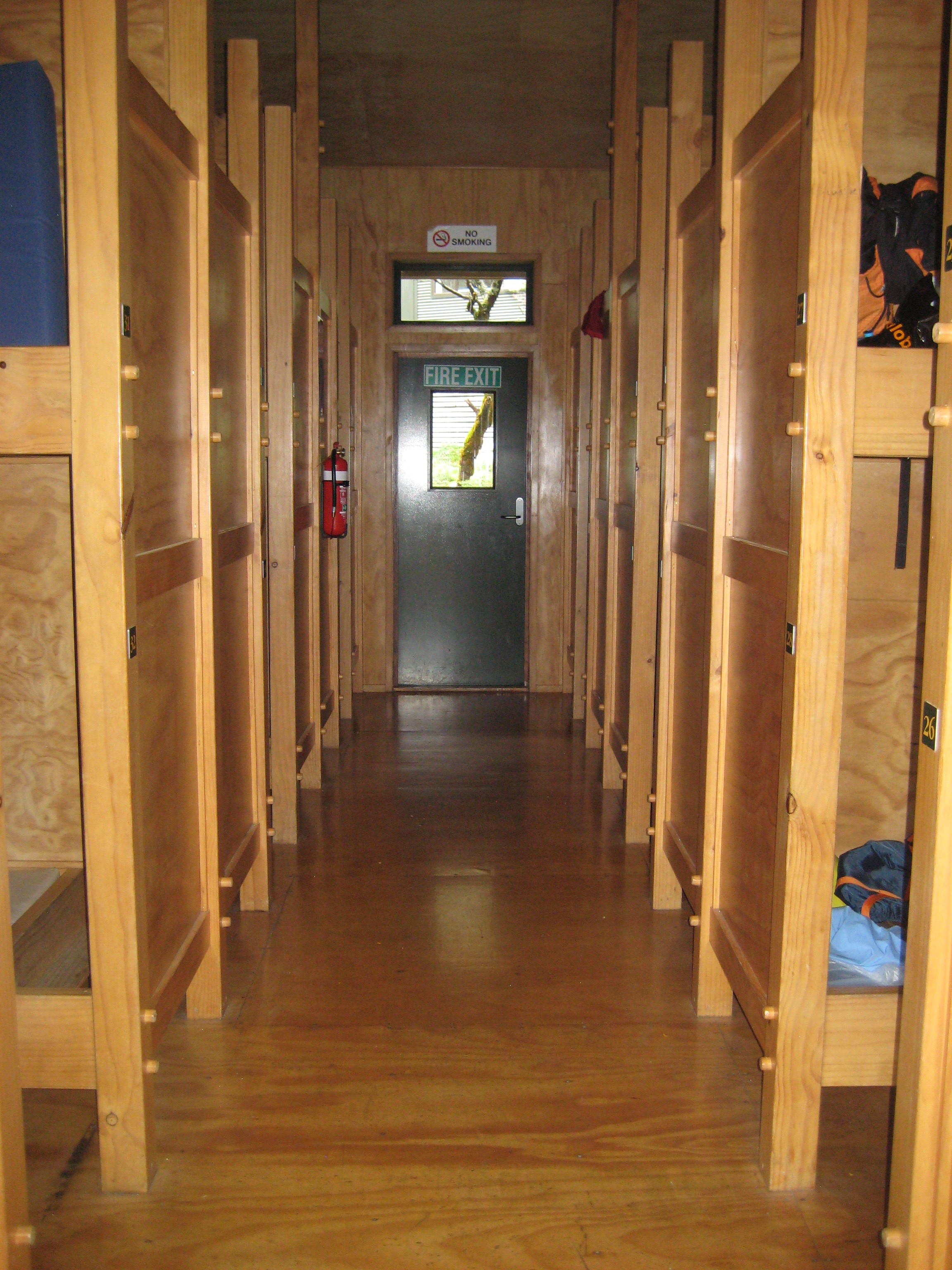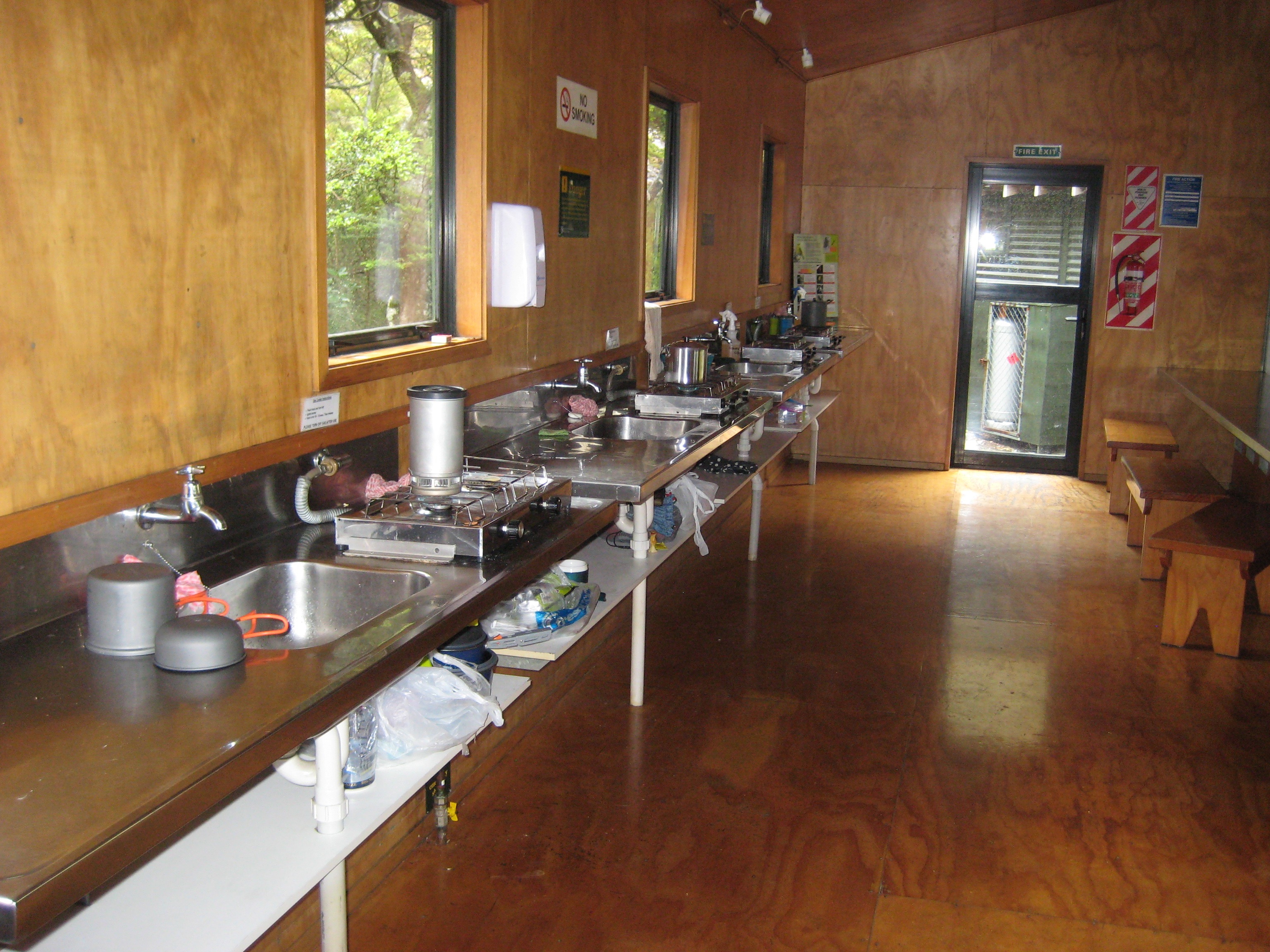 Like many backcountry huts in New Zealand, this one is well-constructed, very clean, and nicely appointed. The kitchen has a long countertop and numerous cooking stations equipped with propane stoves and cookware. The dining area is spacious and well-lit by large windows. The sleeping bunks have thick foam pads, but trekkers must bring their own blankets, sleeping bags, and other personal gear.