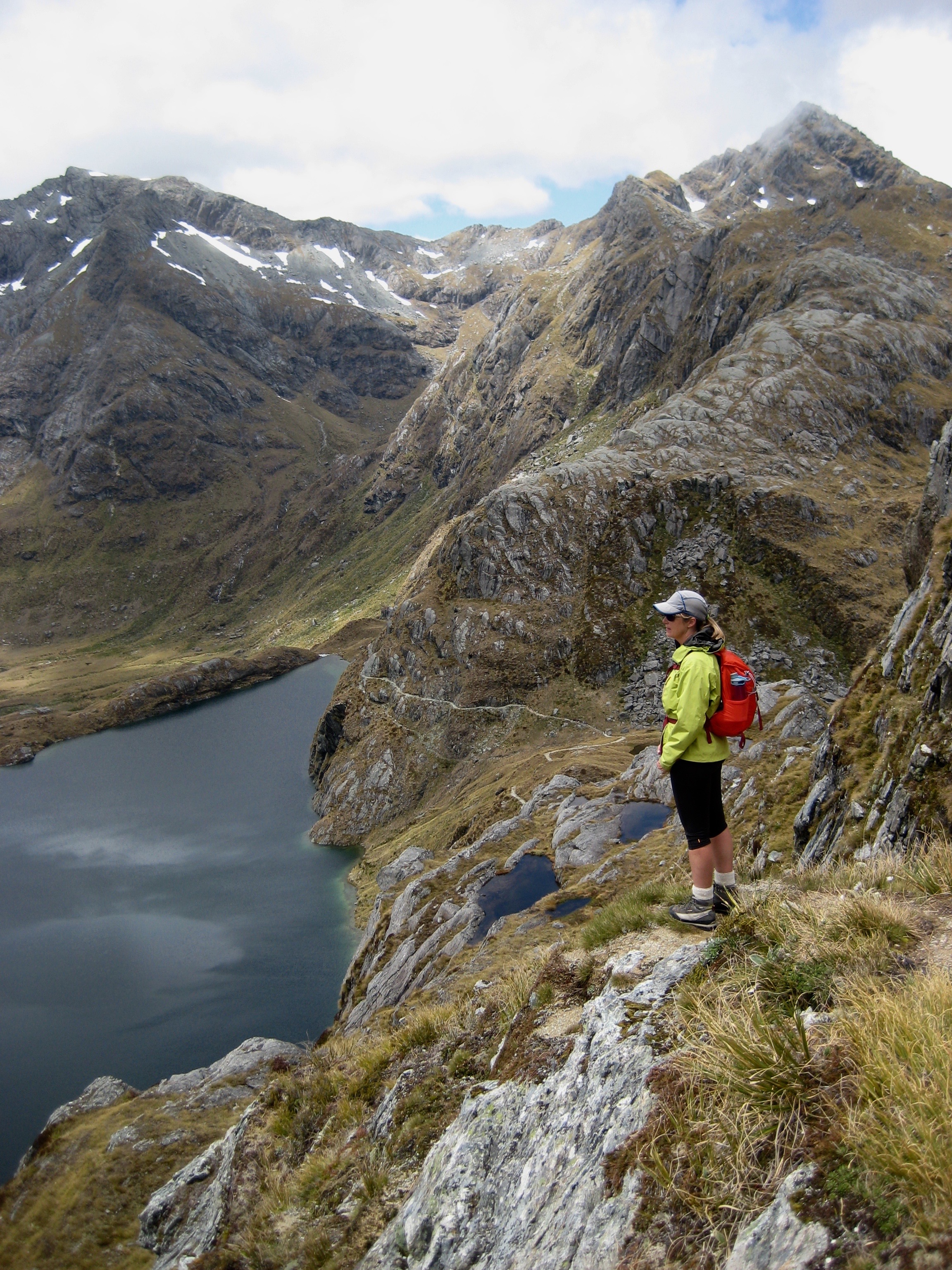 A hiker looks across Lake Harris below Conical Hill on the Routeburn Track