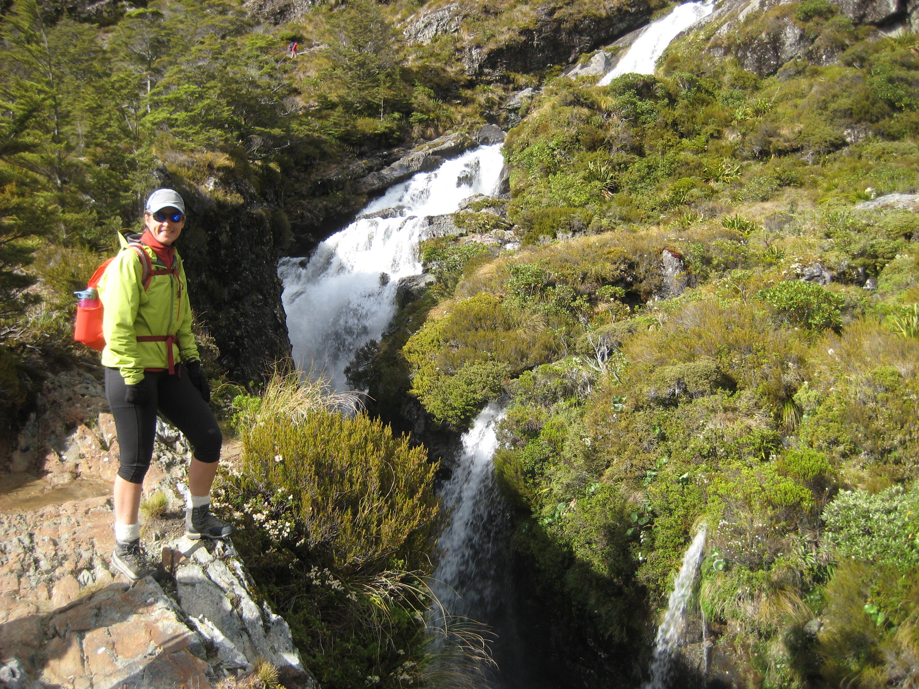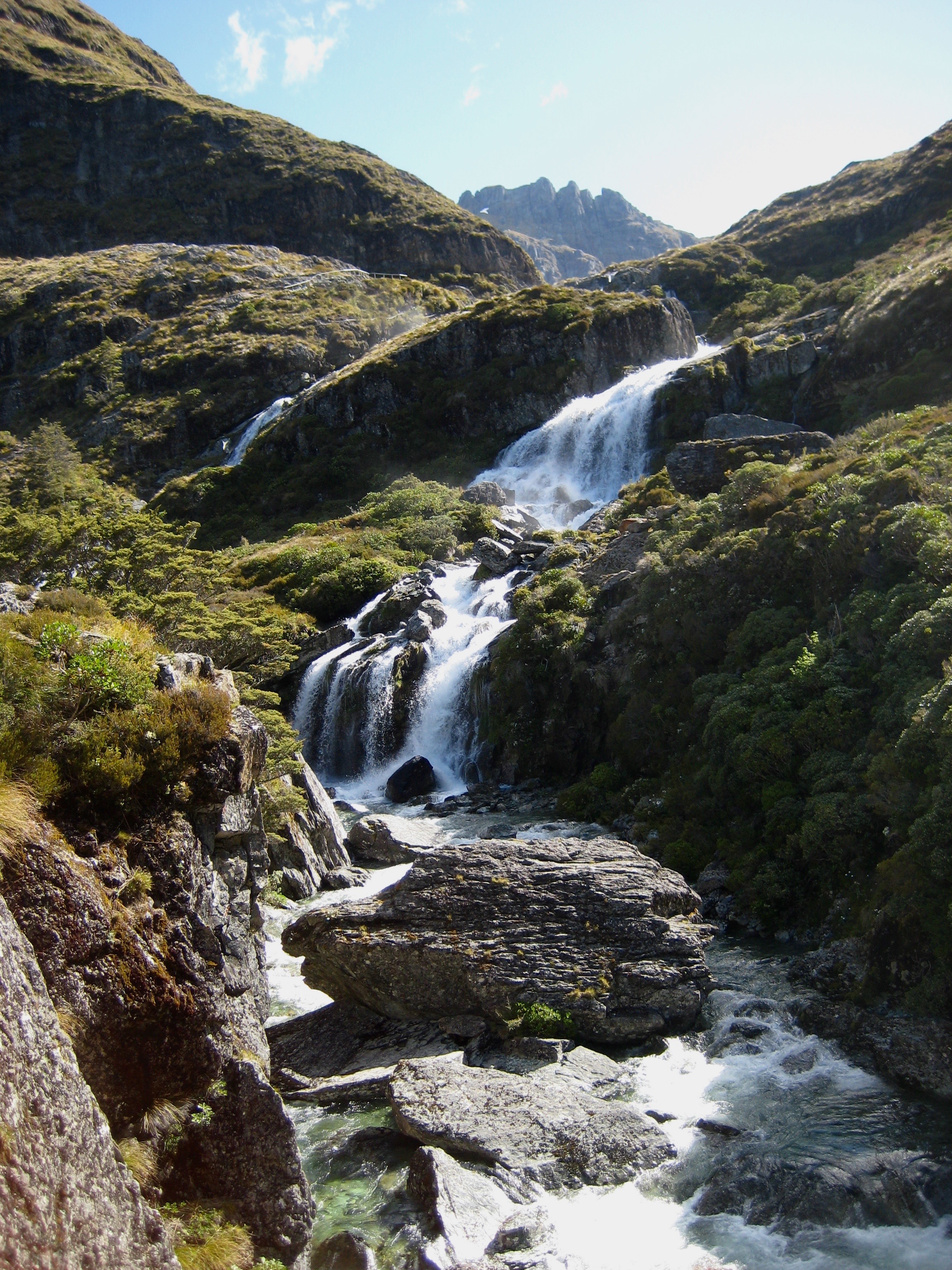 The storm abated during the early morning hours, such that we awoke to mostly sunny skies. Eileen and I took advantage of the favorable weather by doing a sidetrip up Conical Hill, a popular destination west of the hut. The first scenic stop on our sidetrip was Routeburn Falls, which consist of several creek braids that cascade into a lateral gorge.