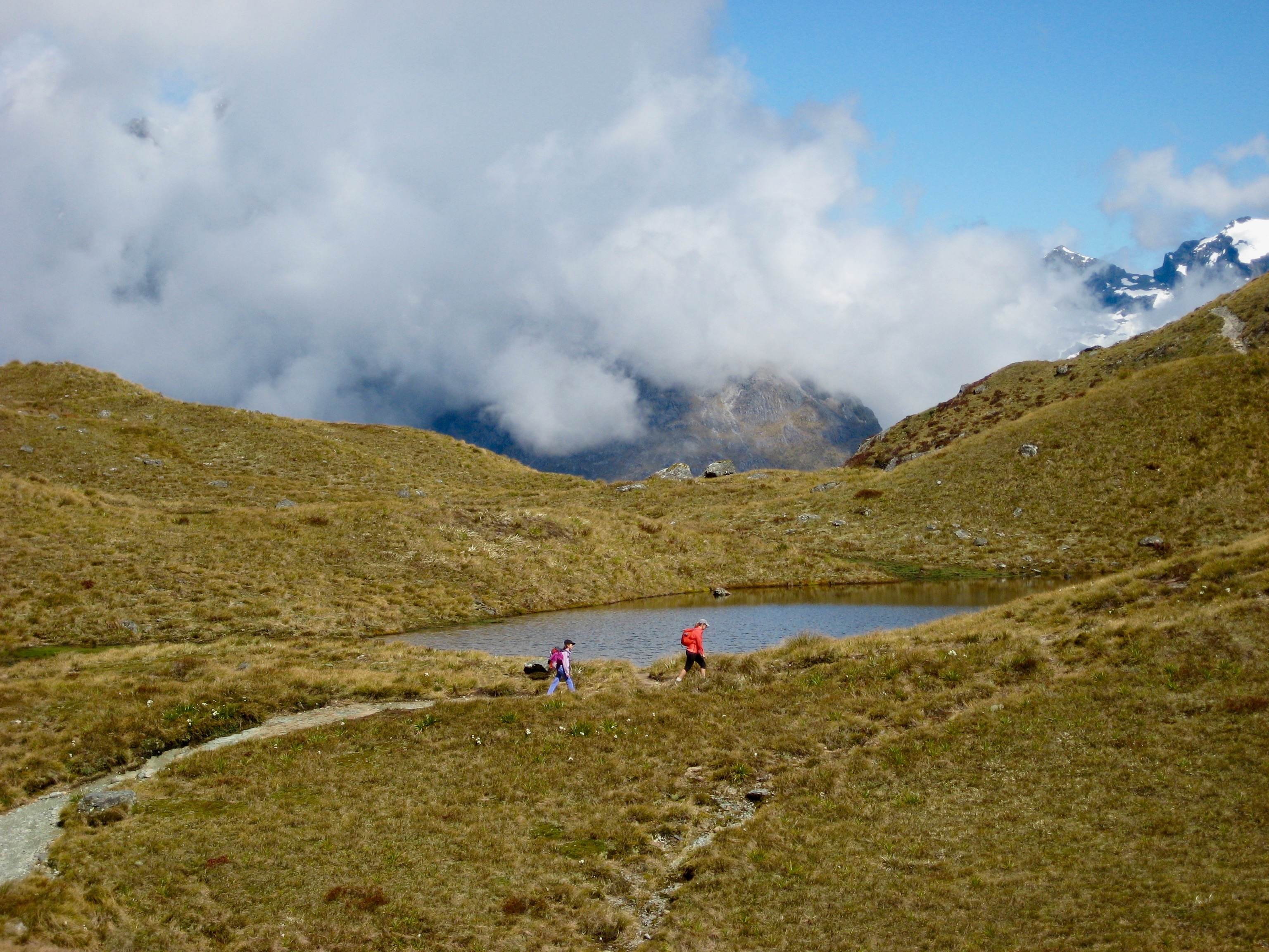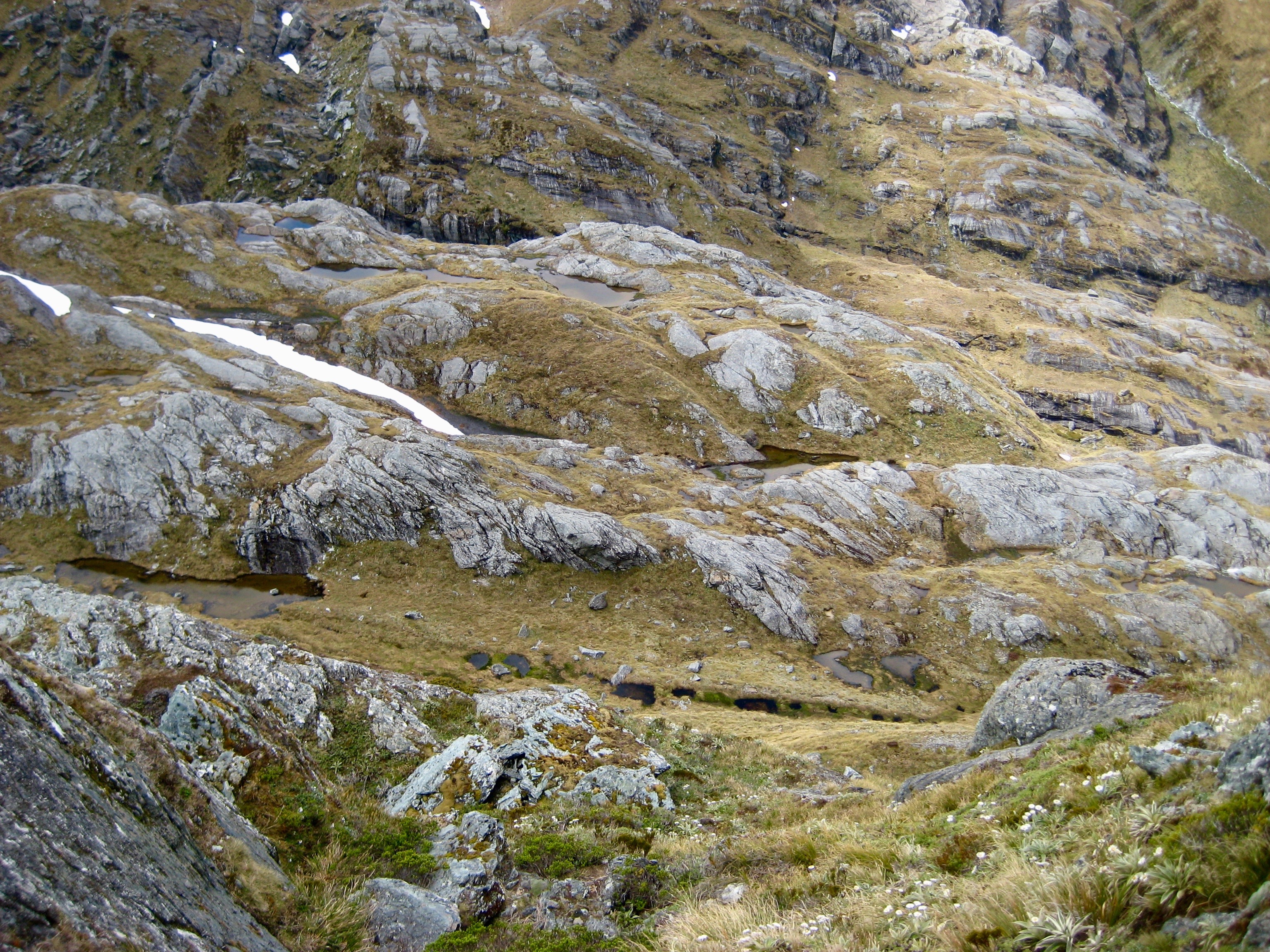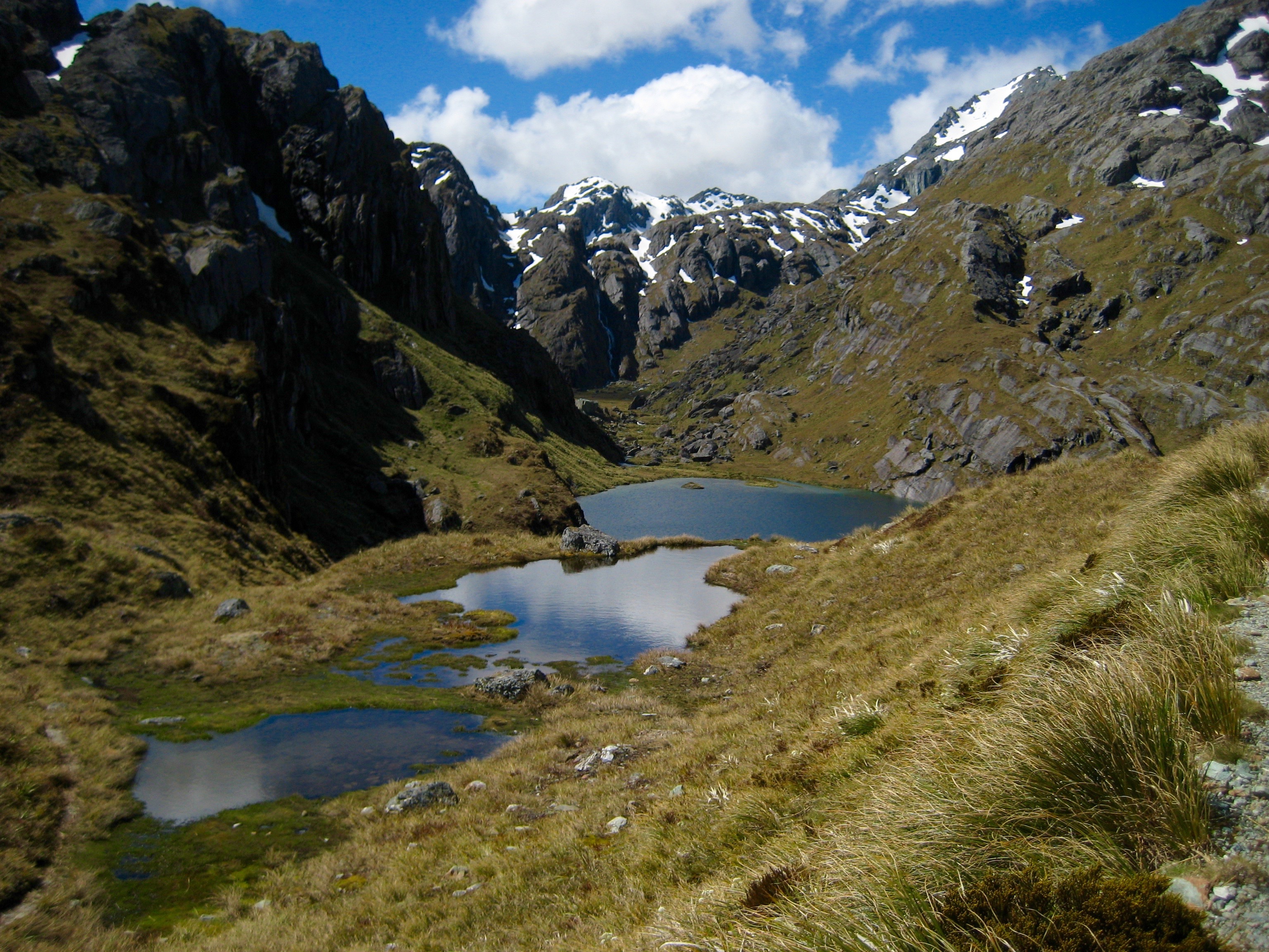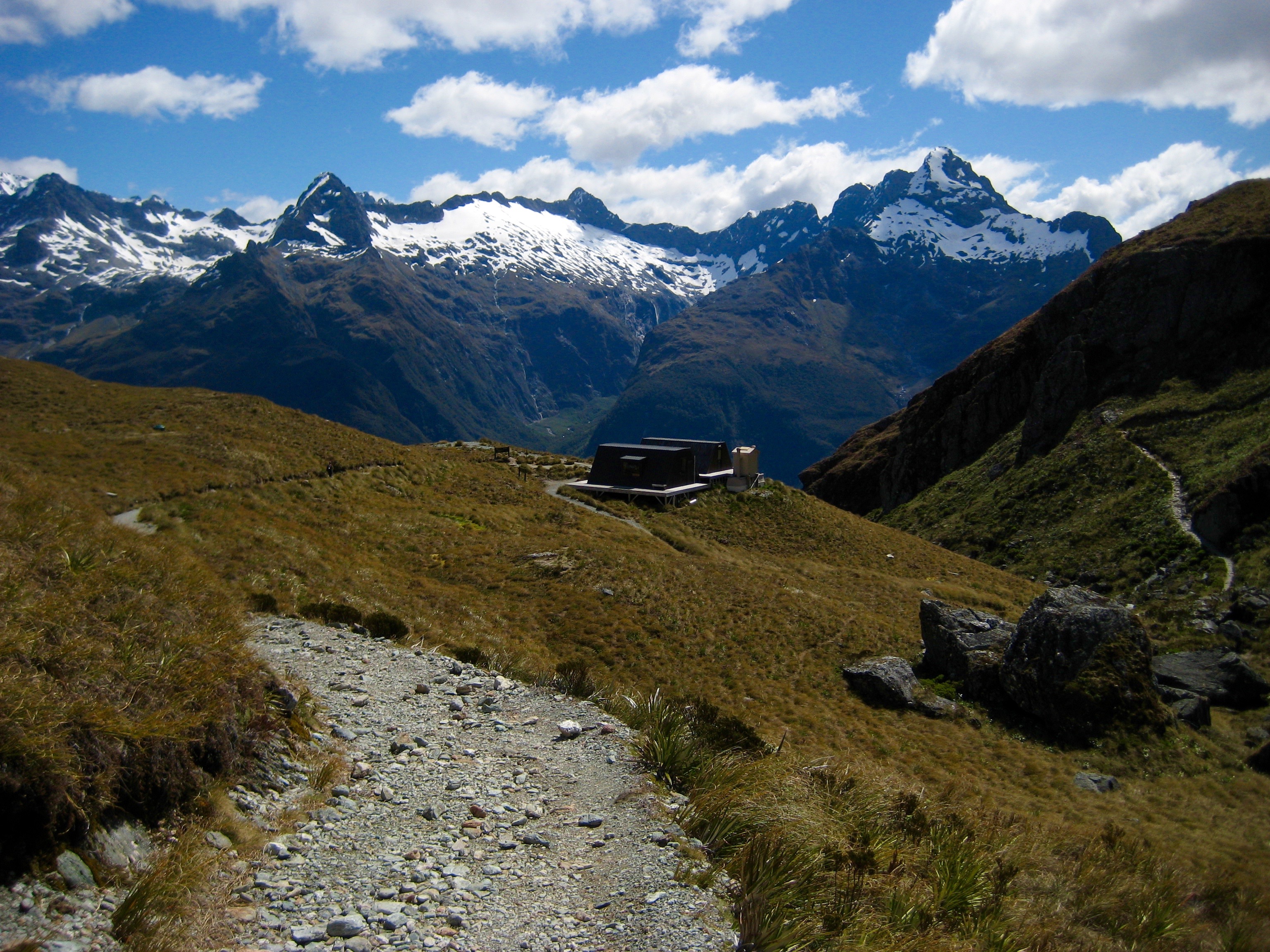 Beyond Routeburn Falls, we entered a huge, grassy meadow that sweeps gracefully up to Harris Lake. The trail traverses a steep above this lake and crosses through Harris Saddle, then immediately comes to a junction adjacent to Harris Shelter—a rudimentary sleeping hut on the Routeburn Track. We had now officially stepped over the border from Mt. Aspiring National Park to Fiordlands National Park.