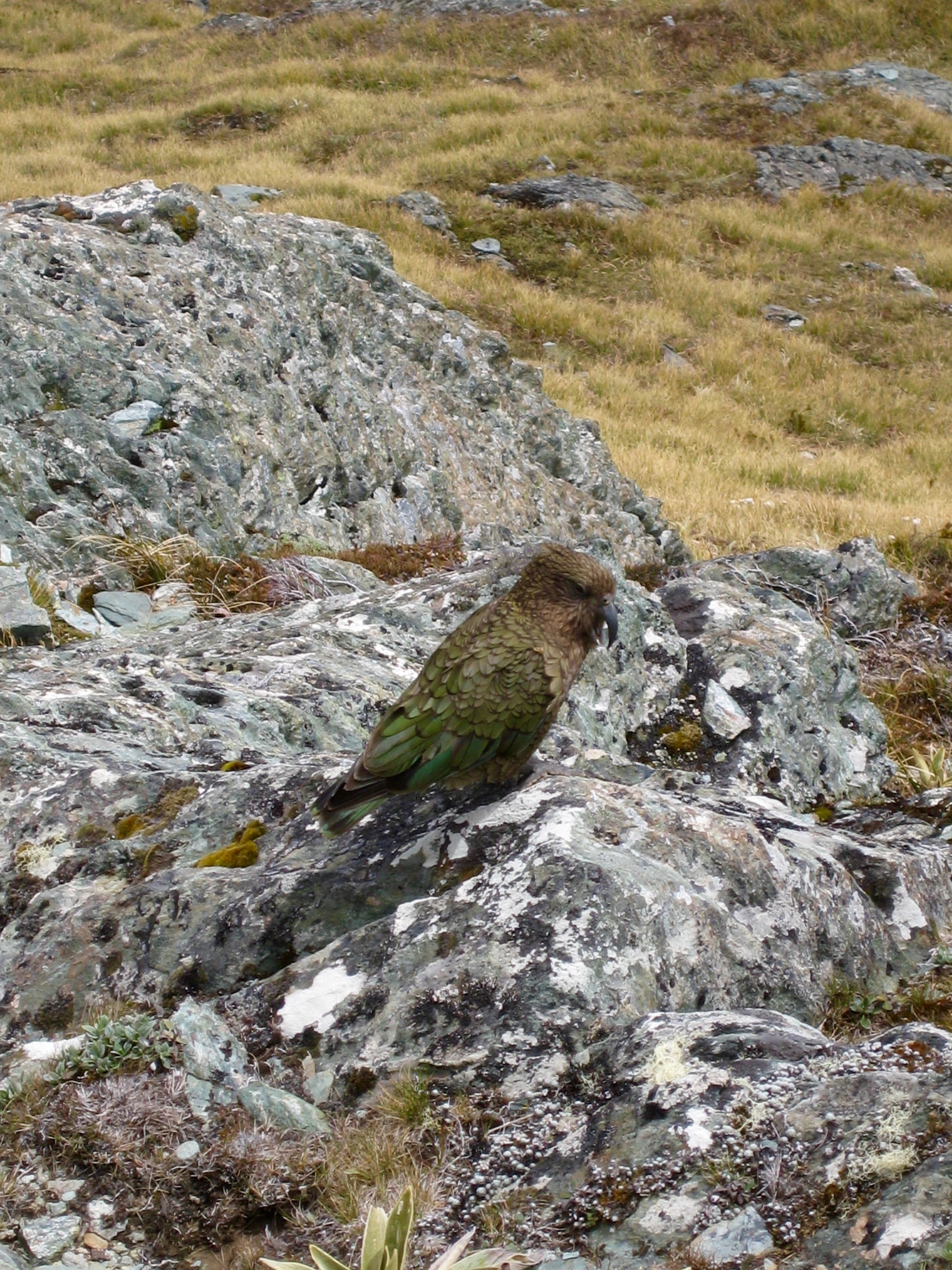 Turning right (north) at the junction, we departed from the main trail and followed a spur trail that switchbacks steeply up Conical Hill. We gained the broad summit in early afternoon (3.8 hours from Routeburn Falls Hut) and took in the views of surrounding mountains as well as nearby lakes and tarns. All the while, a sneaky kea bird prowled around our rucksacks in hopes of stealing some food!
