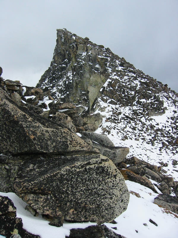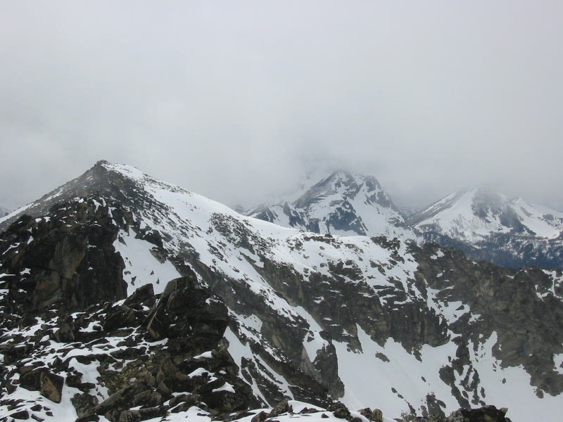 Swirling fog precluded any hopes of sighting from Libby to Corax, so I quickly headed east along the connecting ridge. The traverse over semi-treacherous, snow-and-ice-covered talus took a bit more than an hour but seemed much longer, as I slipped and fell repeatedly. Finally, the horn-shaped summit of Corax Peak appeared through the fog, and I scrambled up the south slope on Class 2-3 rock (5.2 hours from TH).