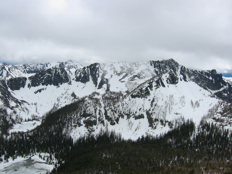 From the lake, I headed due west into a little larch basin, then straight up to a saddle in the ridge spanning between Libby Mountain and Mt. Bigelow. Snow conditions steadily improved and punch-throughs decreased, but there were about 4 to 8 inches of fresh snow that seemed very prone to start sliding over the old corn. I turned right on the ridge crest and followed snow-covered boulders to the top of Libby Mountain (3.9 hours from TH).