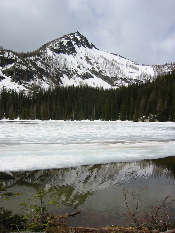 The Crater Lake trailhead at 4750 feet was snow-free and mostly sunny, but it did occasionally sprinkle a rain/snow mix. The first mile of trail was also bare; snow appeared in patches at 5200 feet, then became prevalent at 6000 feet. The snowpack was randomly unconsolidated, and I postholed up to my knees every few steps. I stumbled onto Crater Lake at noon (2.0 hours from TH). Snow snifters continued to come down, and a few rumbles of distant thunder threatened.