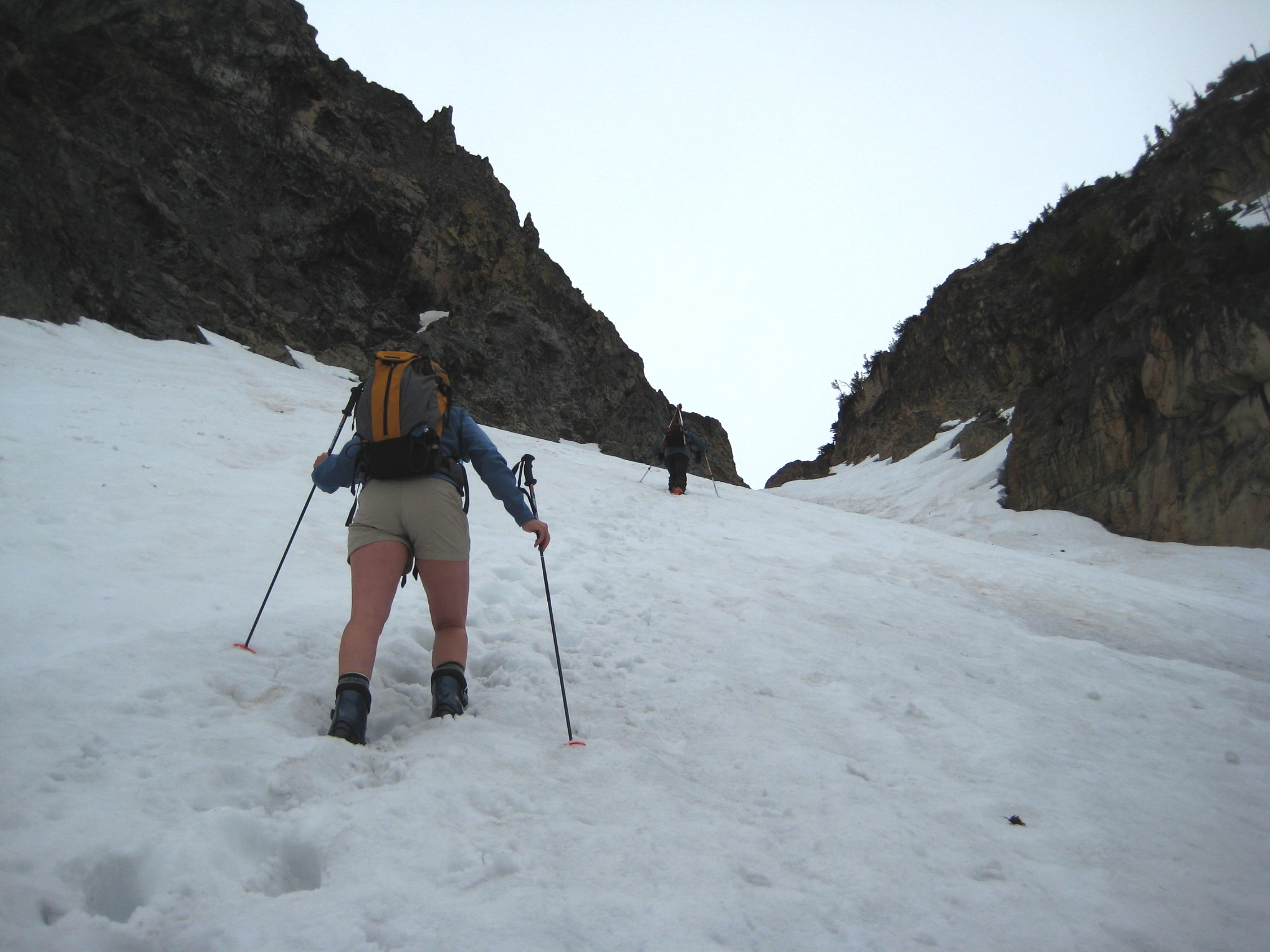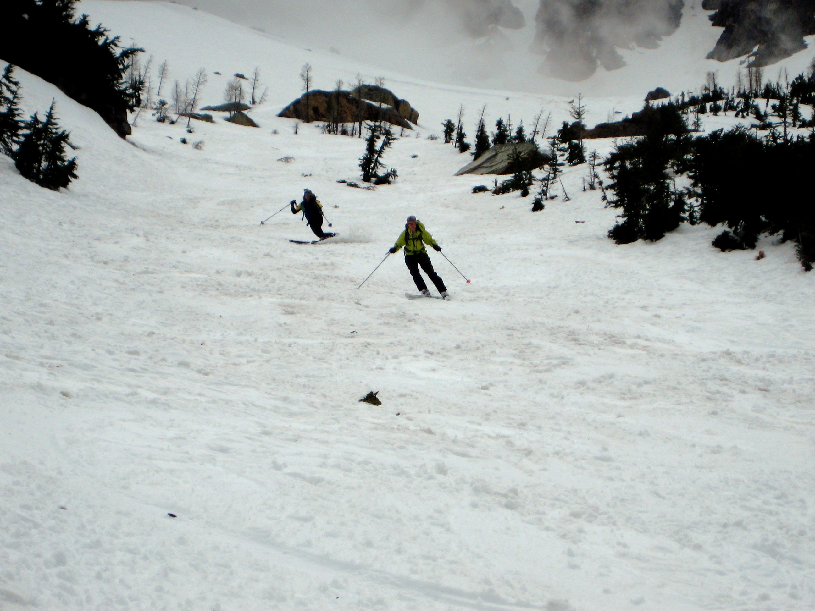 We quickly booted back to Spire Col and on down to our ski stash. Just below the col, we encountered two skiers who had just climbed up. They turned out to be Tony D and Kevin K from Bremerton, comprising half of a quartet of good Samaritans whom Eileen and I had met on our BHB Traverse last summer!