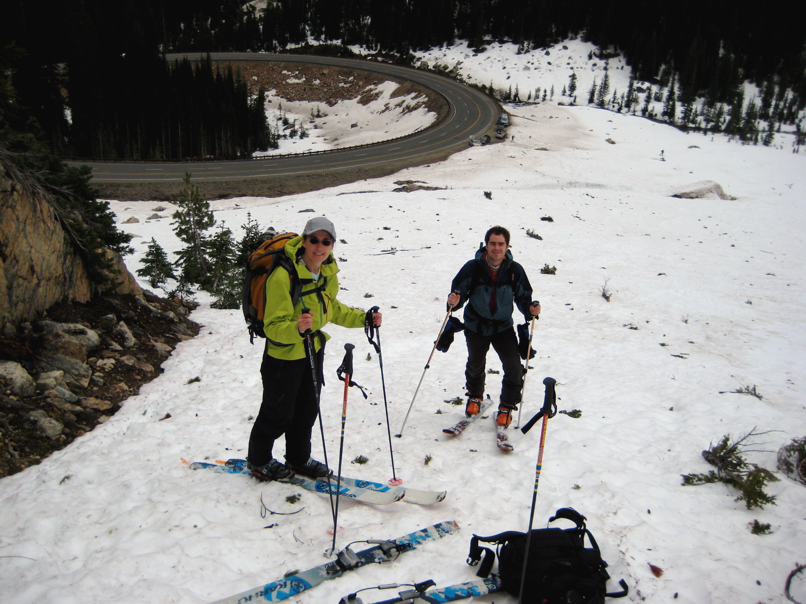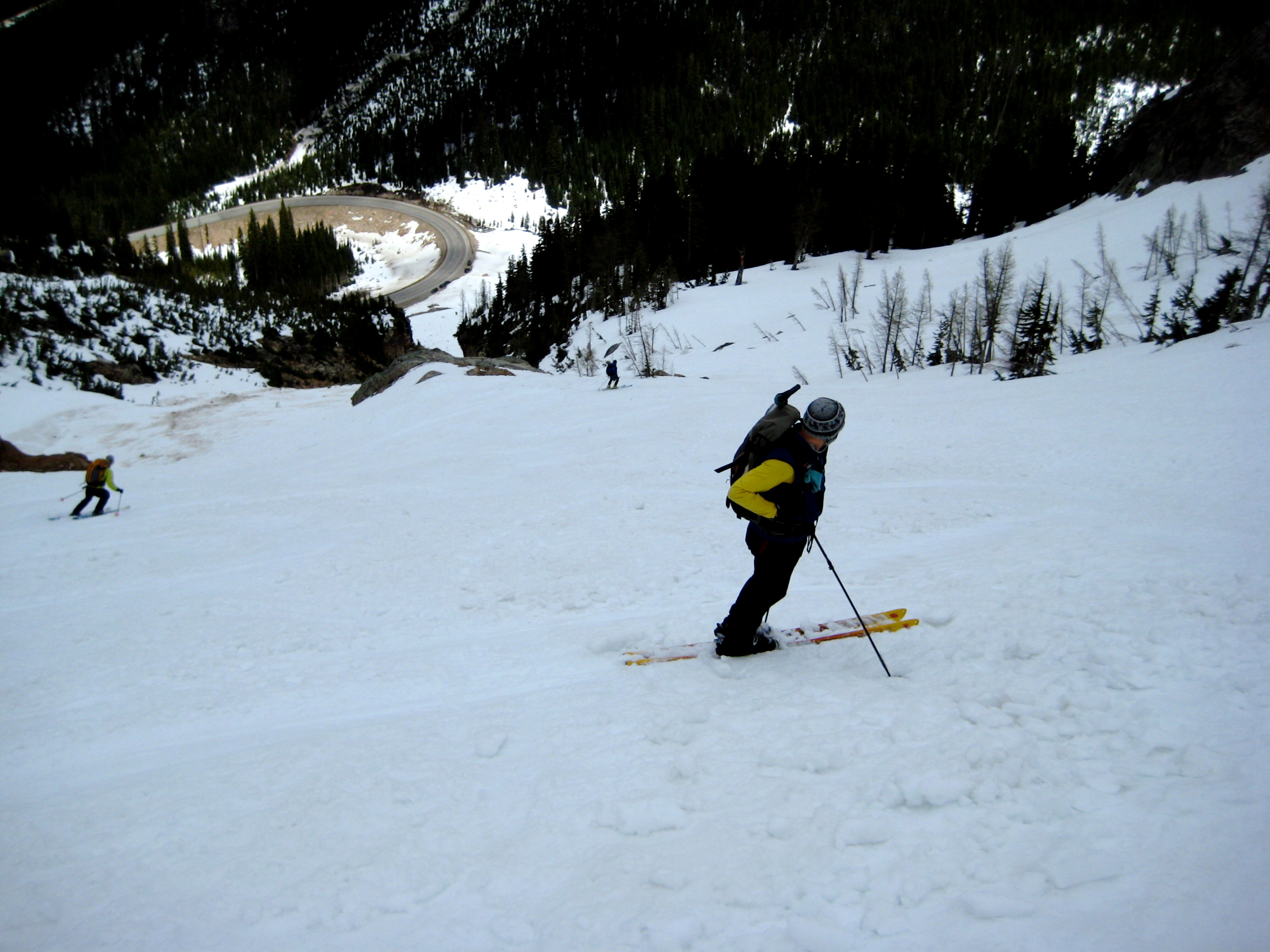 Our group of eight then caravanned up to the Early Winters Hairpin and made hasty plans. Randy, Peter, Linda, Steve B, and Anita chose to ski up Early Winters Basin to the south, whereas Oriol, Eileen and I chose to ski up Spire Couloir to the west.