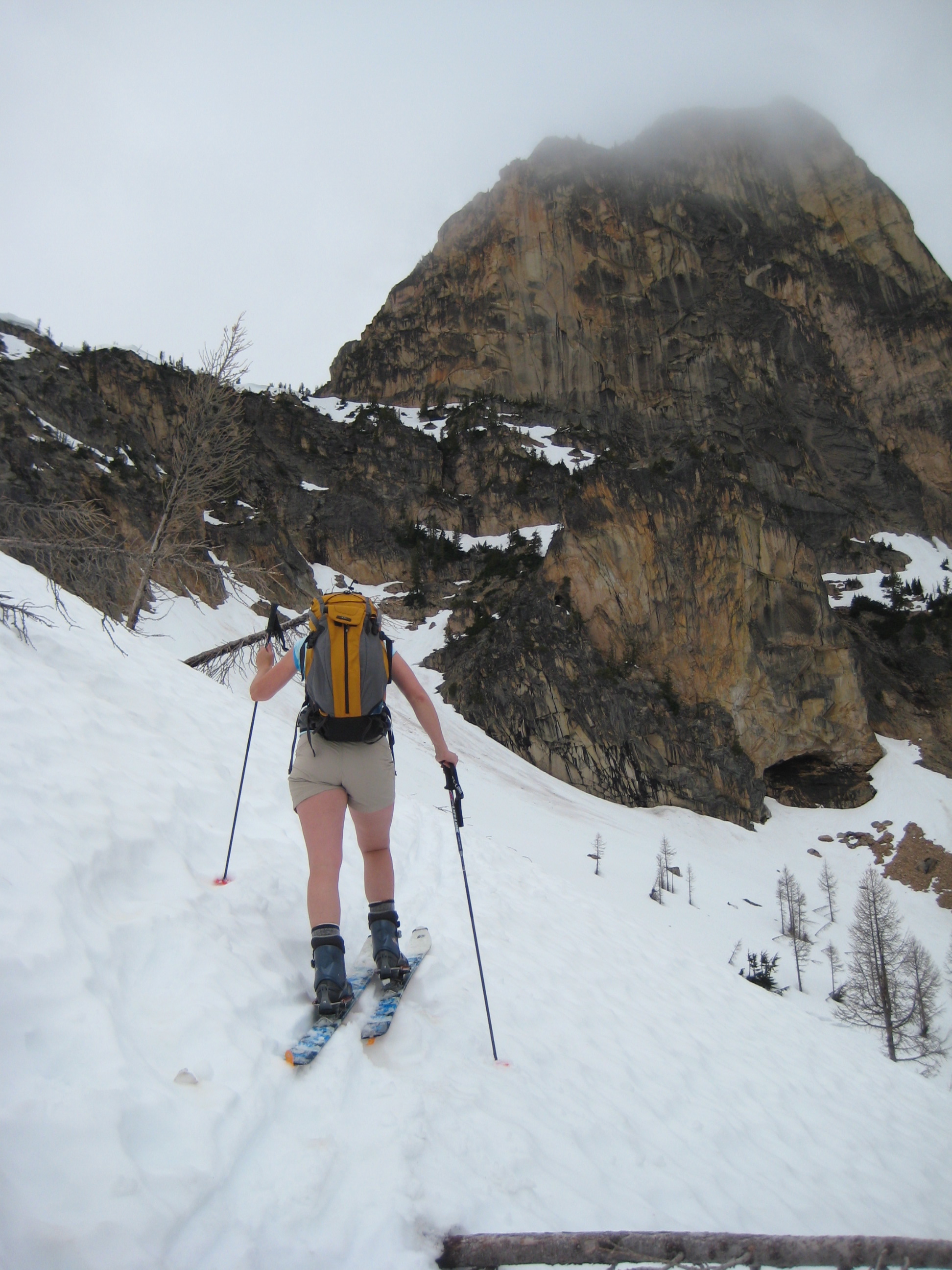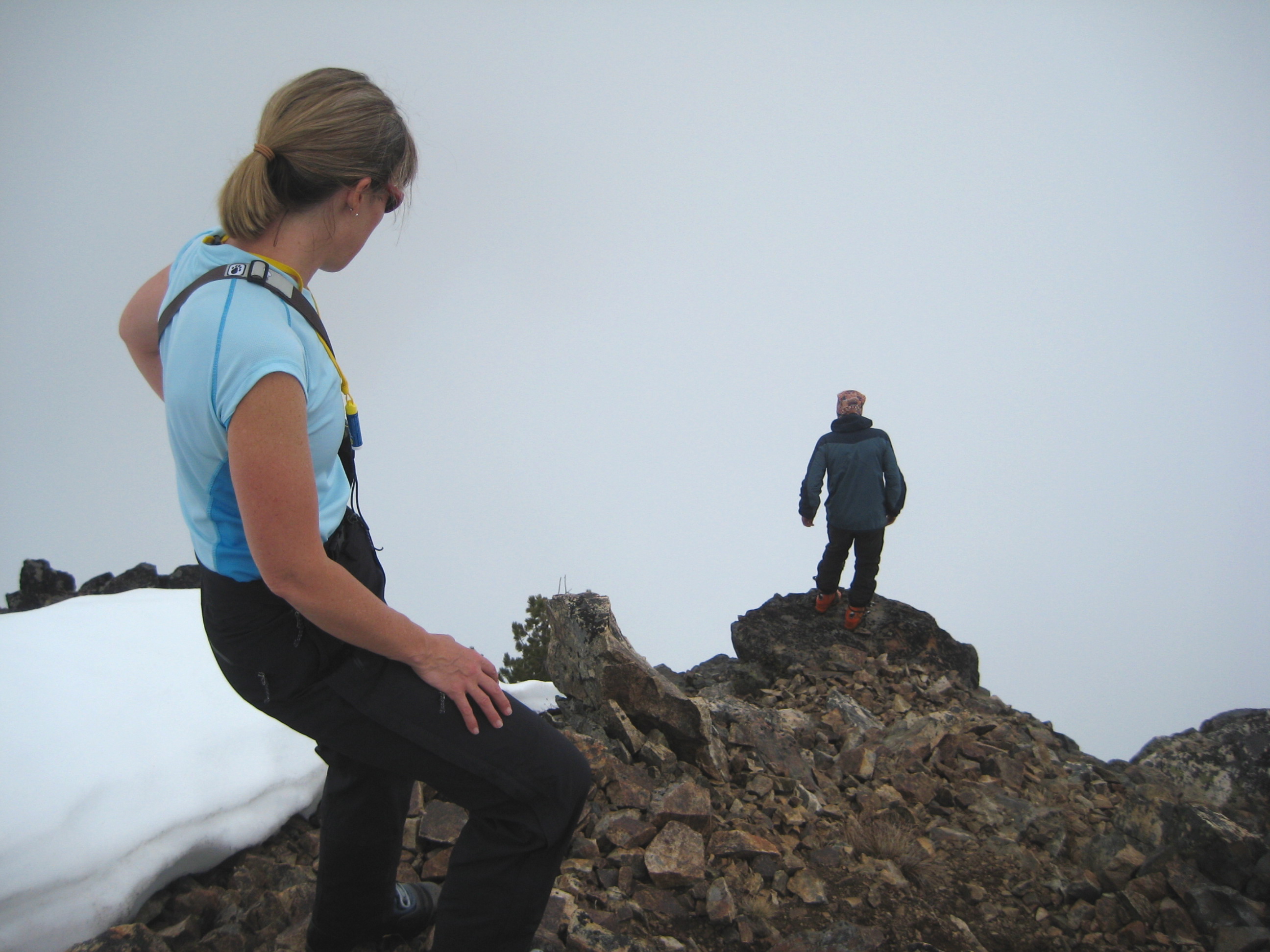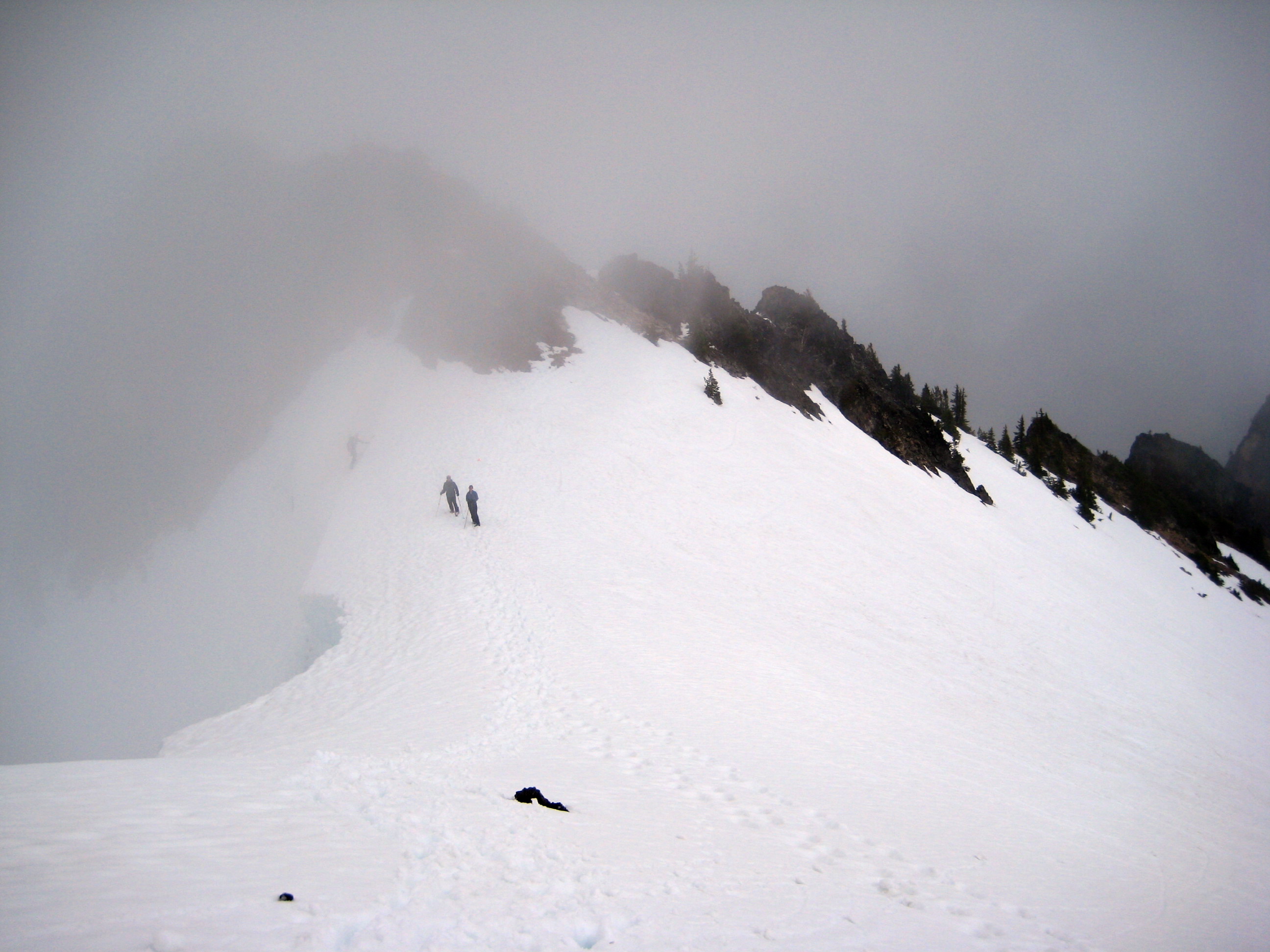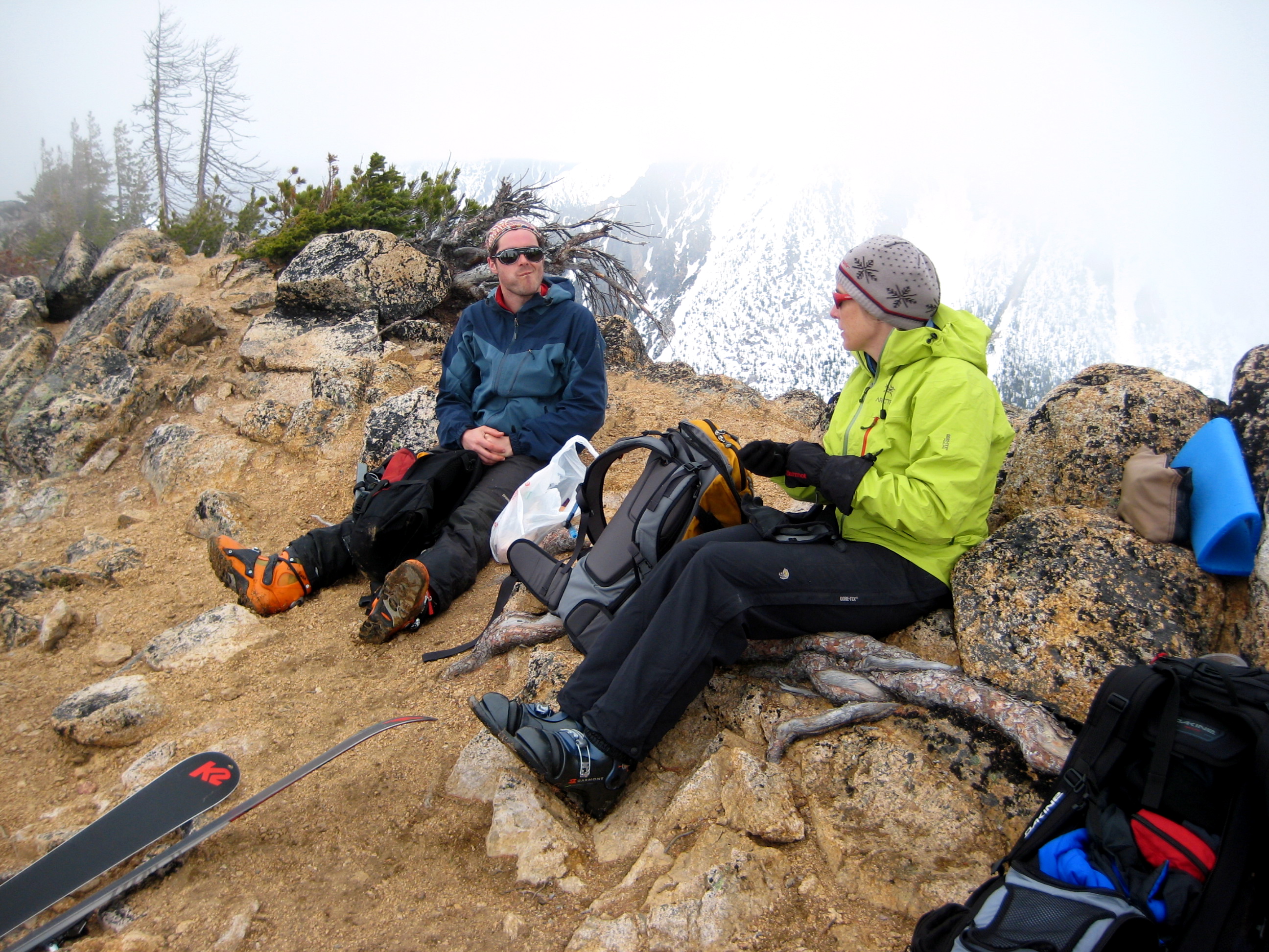 We then booted up the remaining 500 feet to Spire Col (7300′), which was pretty well fogged in.