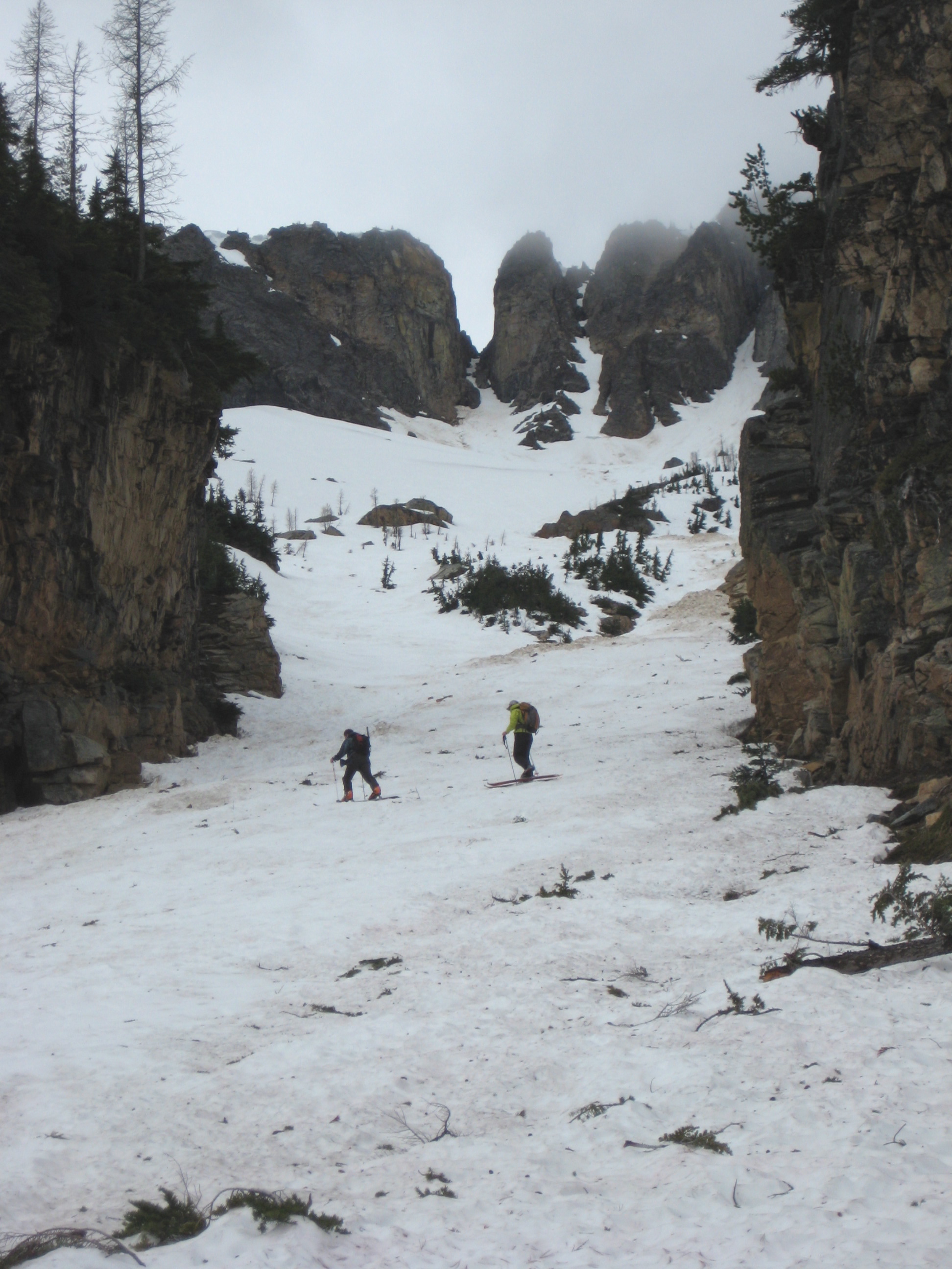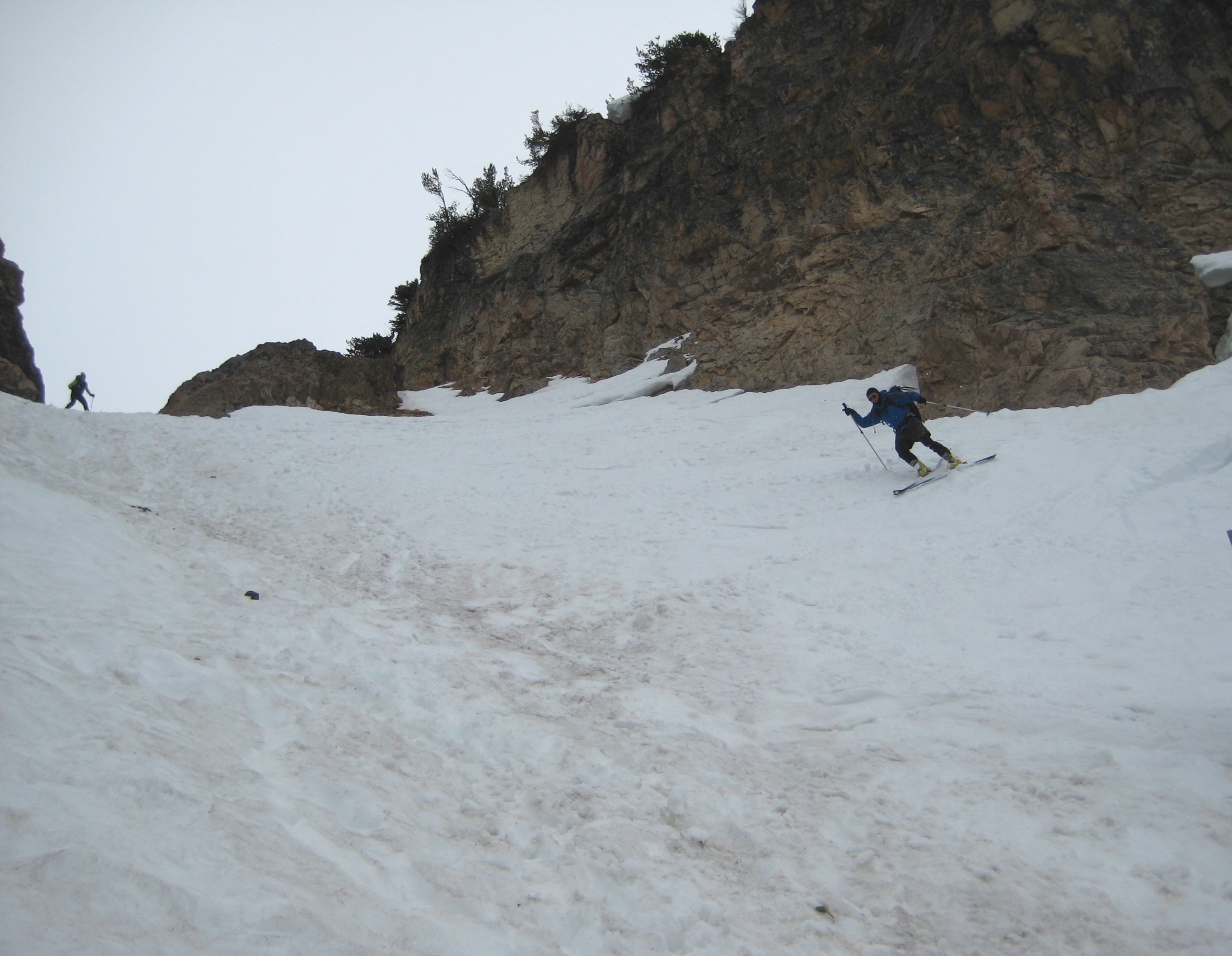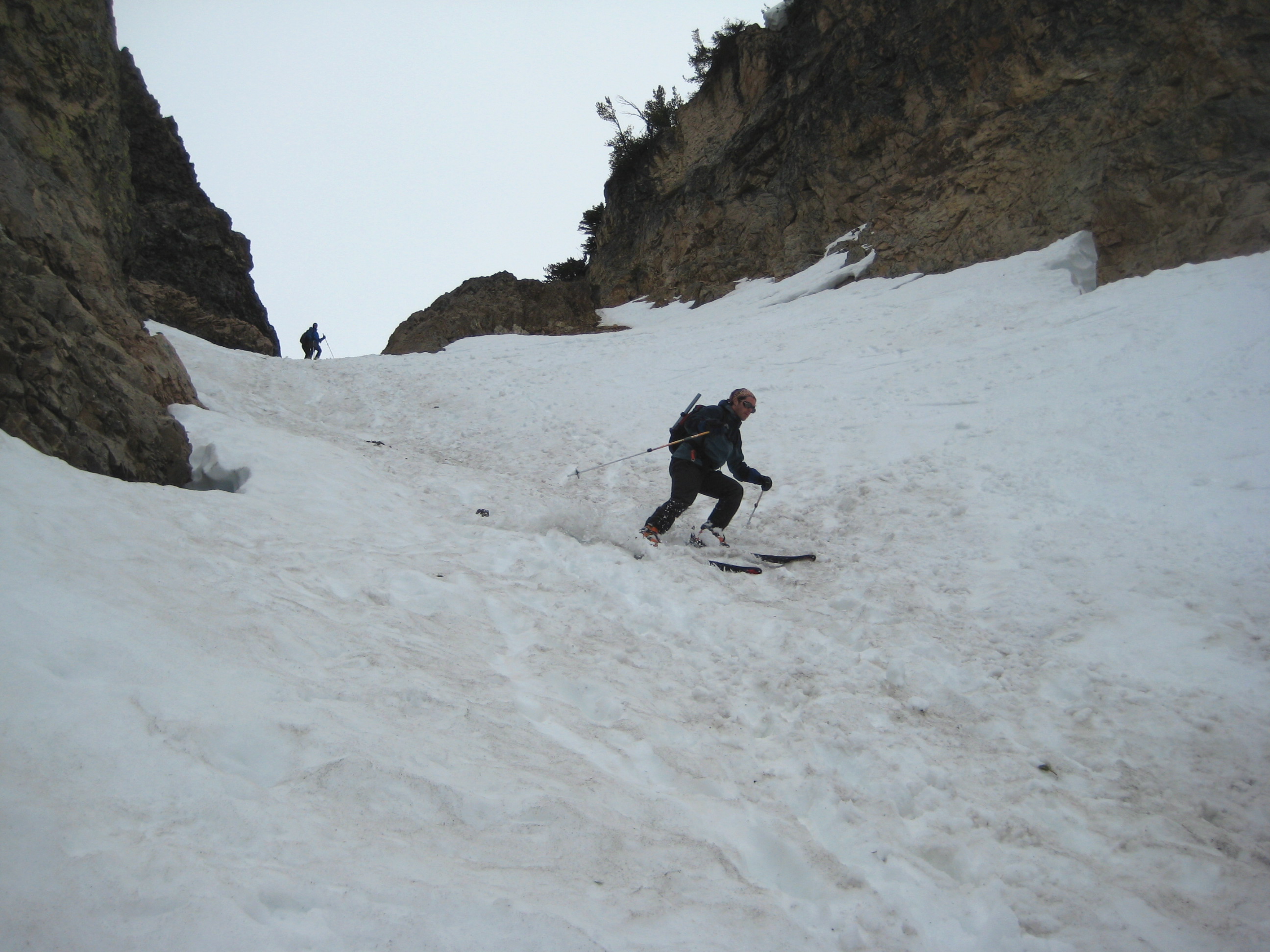 After parting company with the others, our trio skinned up the narrow and somewhat steep couloir to near the final chute.