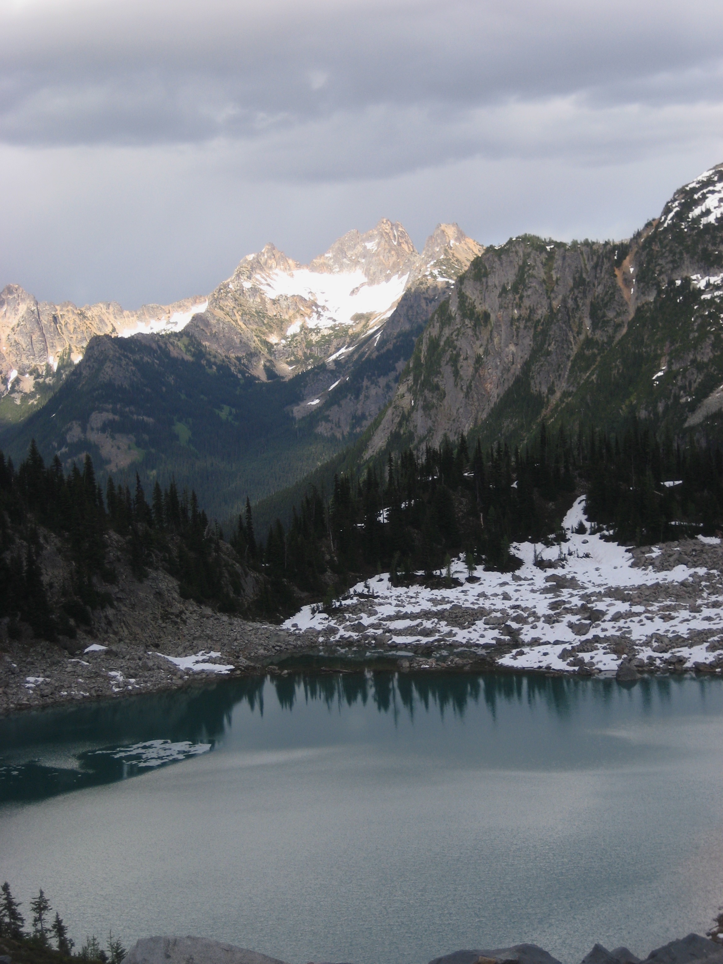 Eileen and I stayed long enough to soak in the views of Black Peak, Mt. Goode, McGregor Mountain, and the upper Methow peaks. Meanwhile, the temperature dropped enough to produce a little graupel shower. This was quite unexpected after the stretch of hot weather all week.