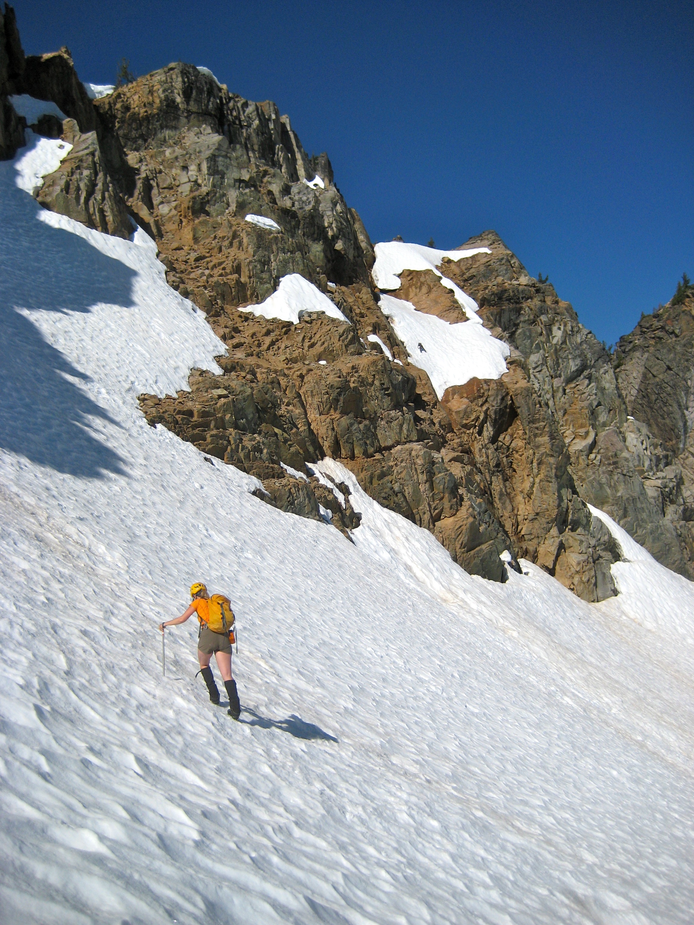 Eileen and I followed Sue’s route up the glacier and rightward toward Corteo’s northwest ridge. We then watched as she made a dicey looking traverse along some rock ledges, across a steep snow patch, and then up a thin strand of snow. She seemed to know where she was going, so why not follow?