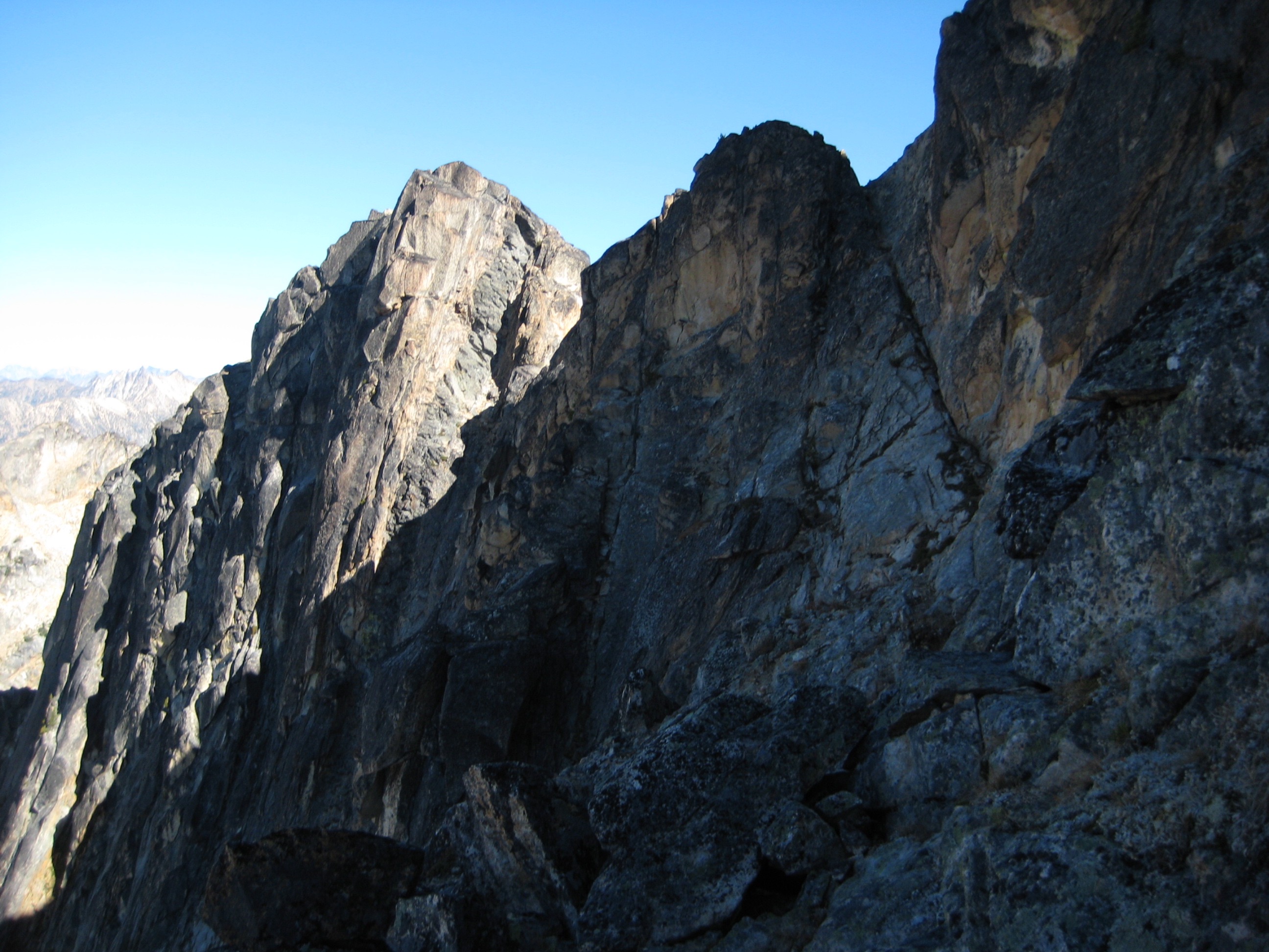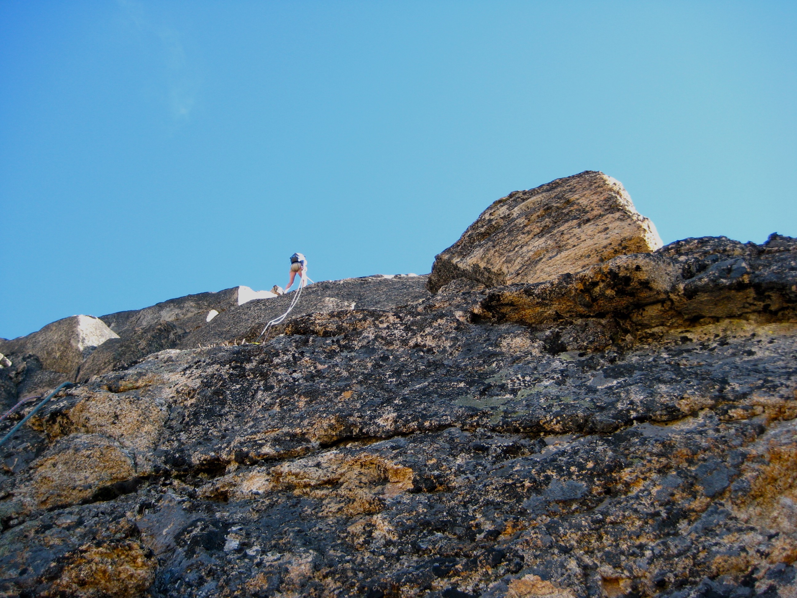 We did running belays over and around a series of crestline horns, and then across the northwestern face of the summit block, finally ending at the upper north ridge.