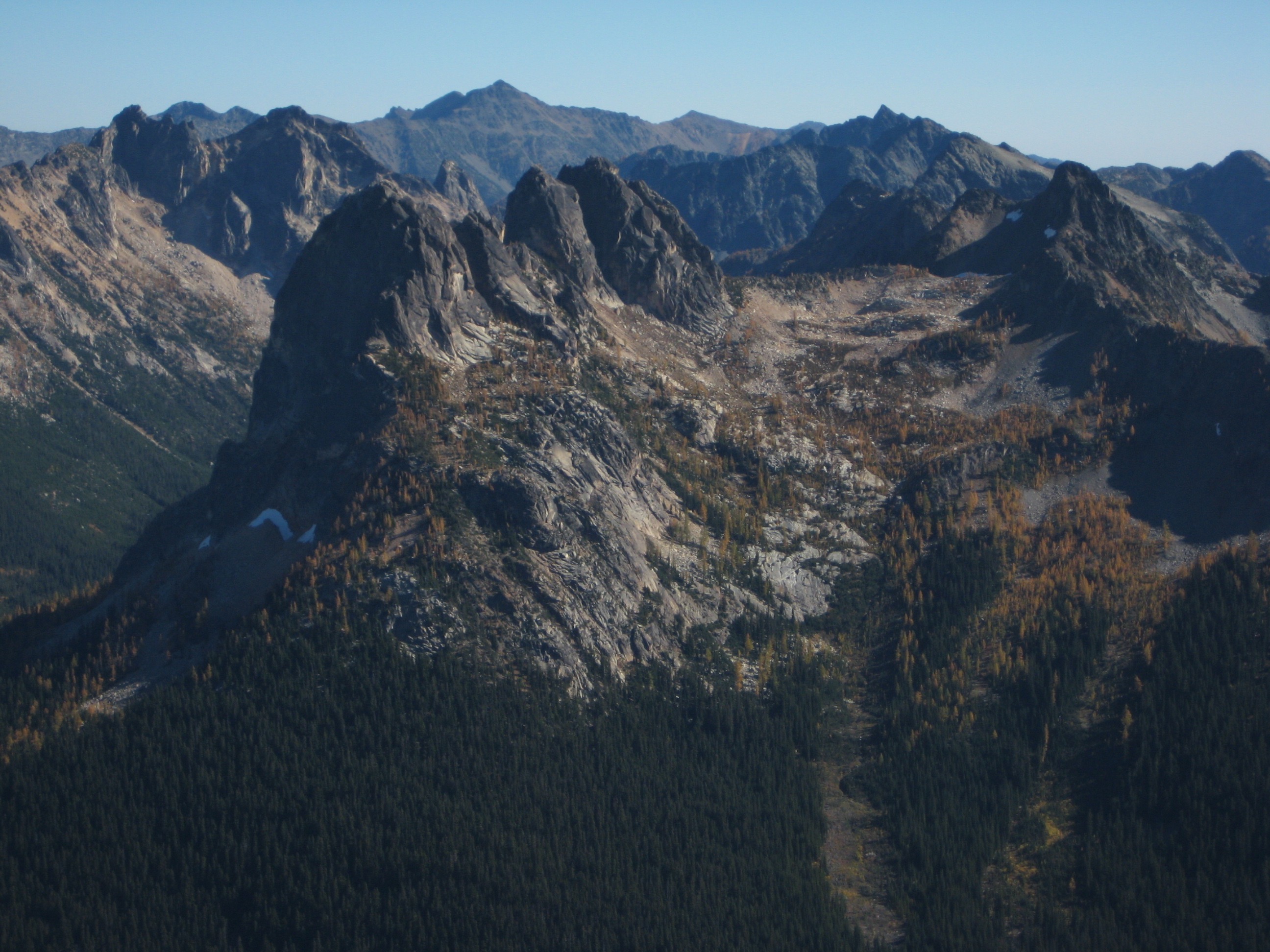 Norm and Nick were already on top, having survived their horrible gully. We shared some summit photos with them and made an agreement to combine resources on our descent…but only after enjoying a long break to soak in the autumn views. We all marveled at the favorable positioning of Cutthroat Peak, which offers a whole new perspective on familiar mountains.
