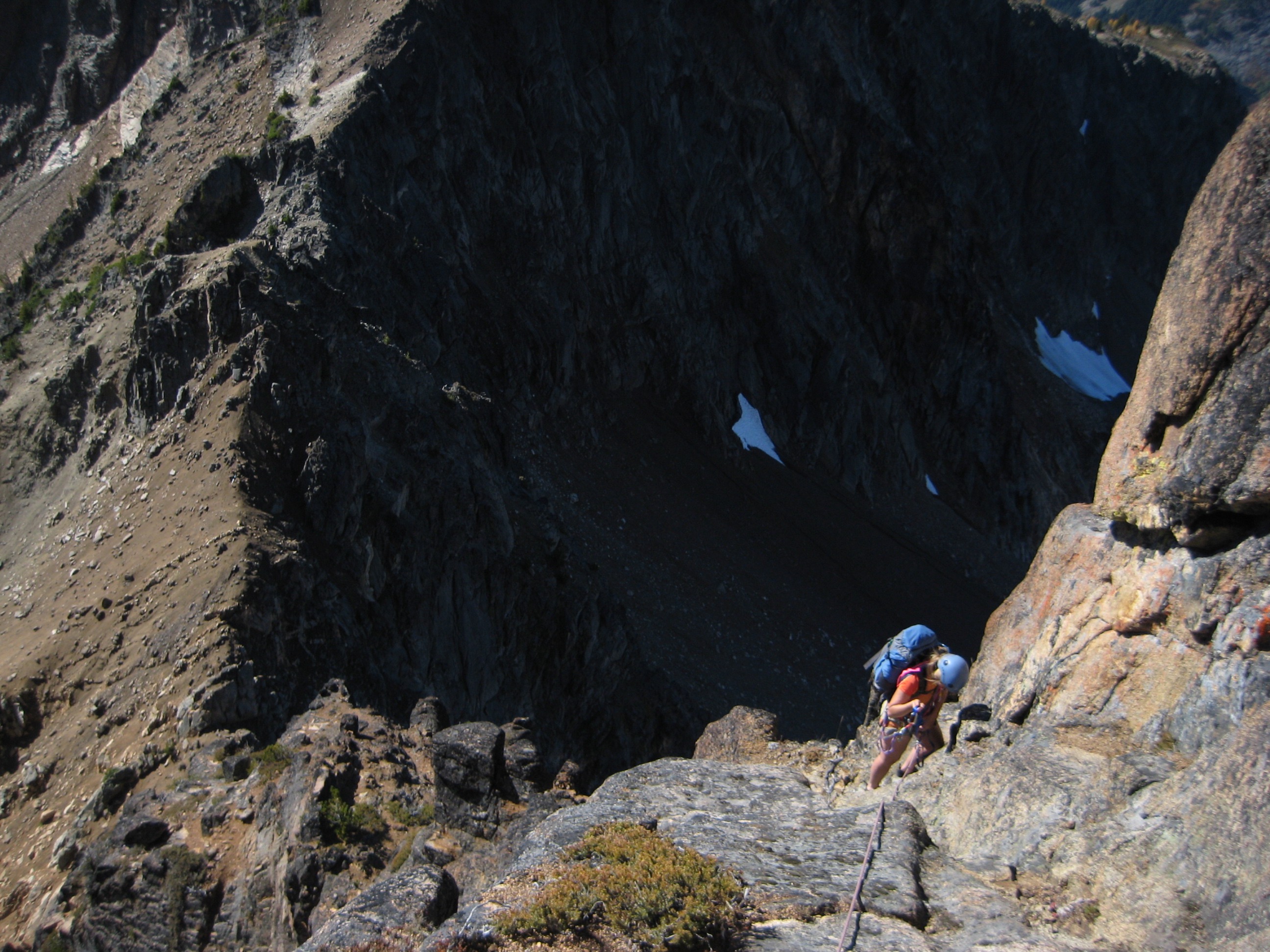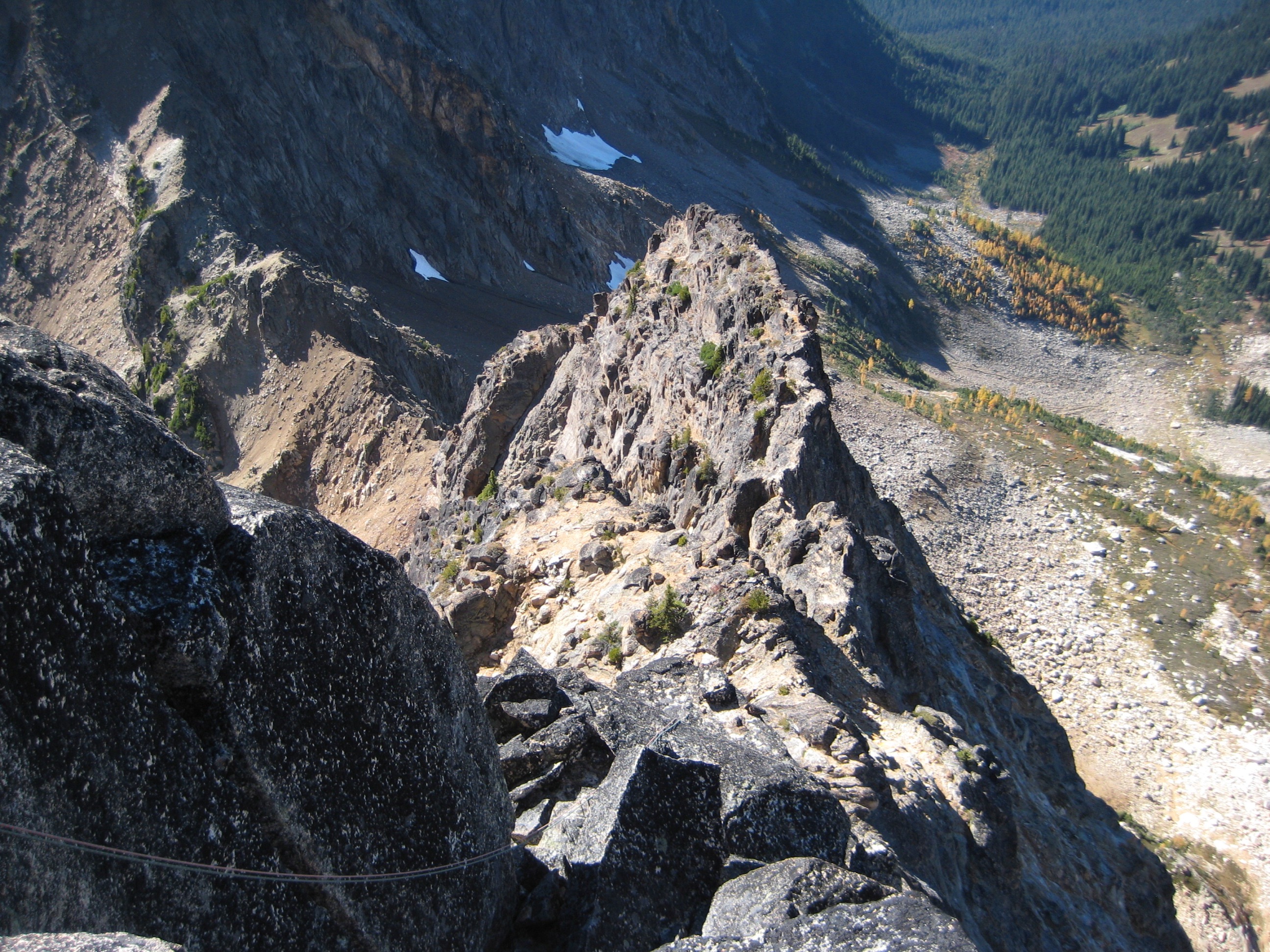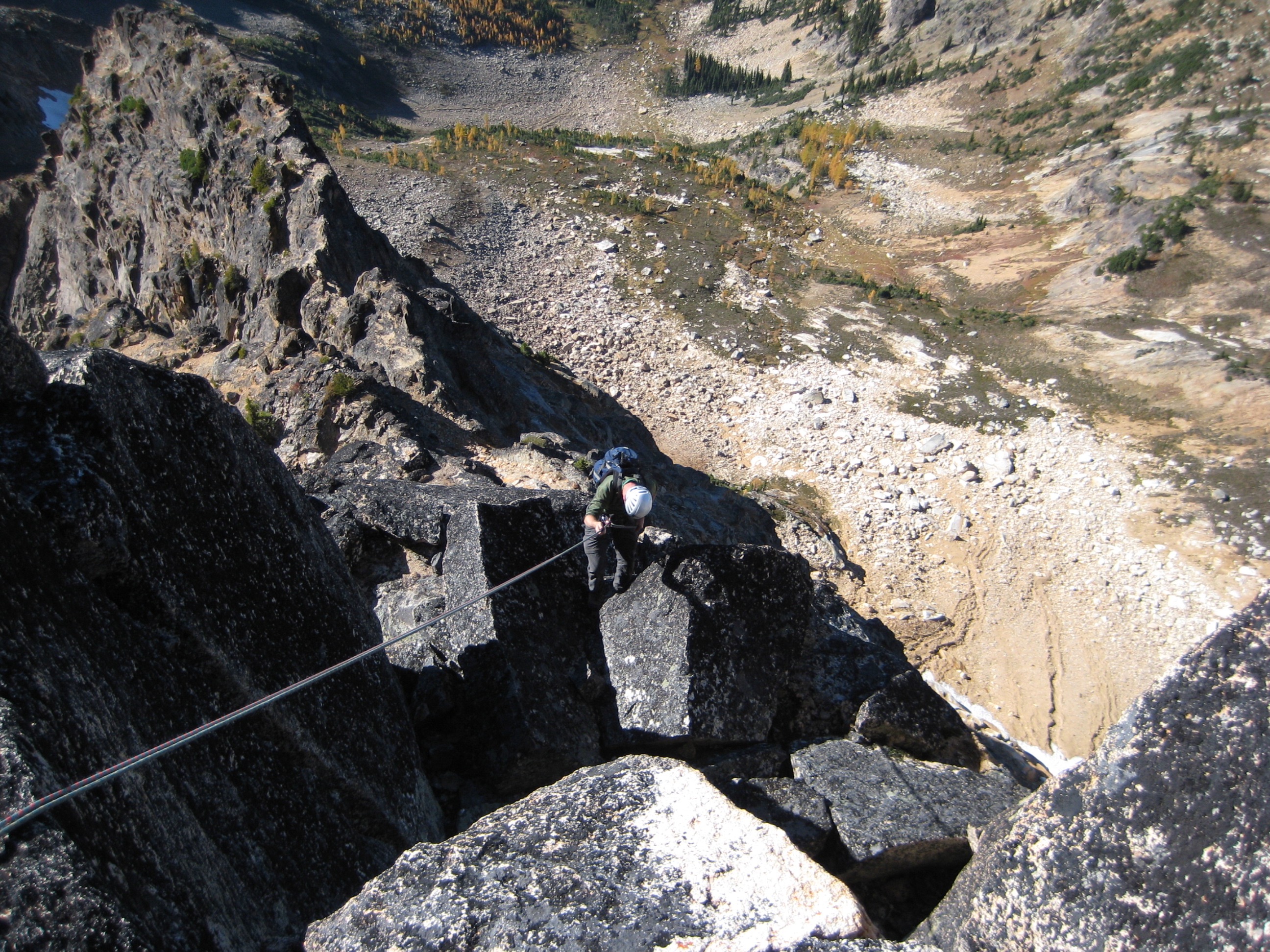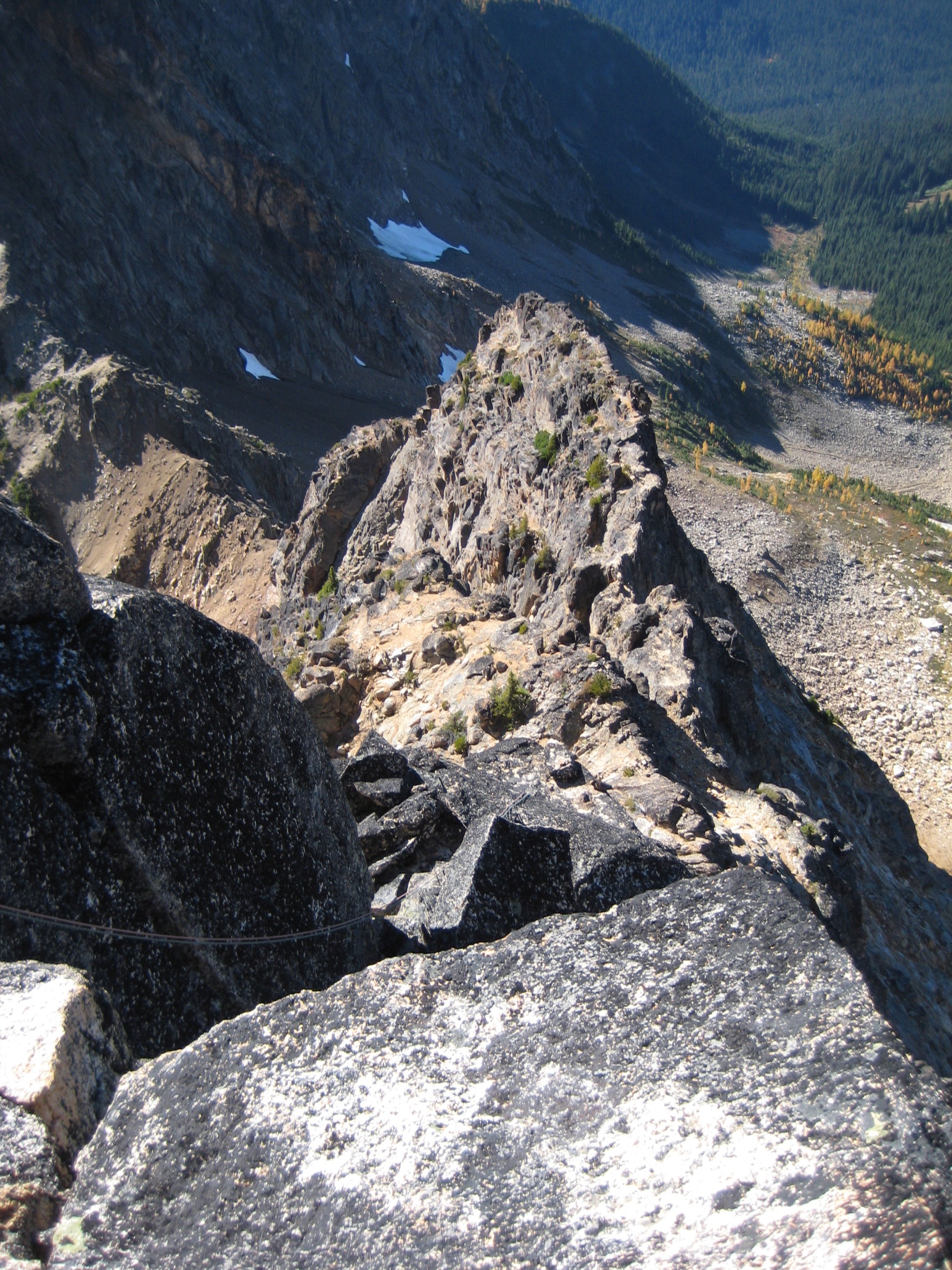 Our 50-meter ropes came up 10 meters short, but we were able to scramble down to a ledge and then over to the ridge notch. A long, roped traverse back down the exposed crest allowed us to reach a second double-bolt rappel station. From there, we made another double-rope rappel down the “first southwest gully.”