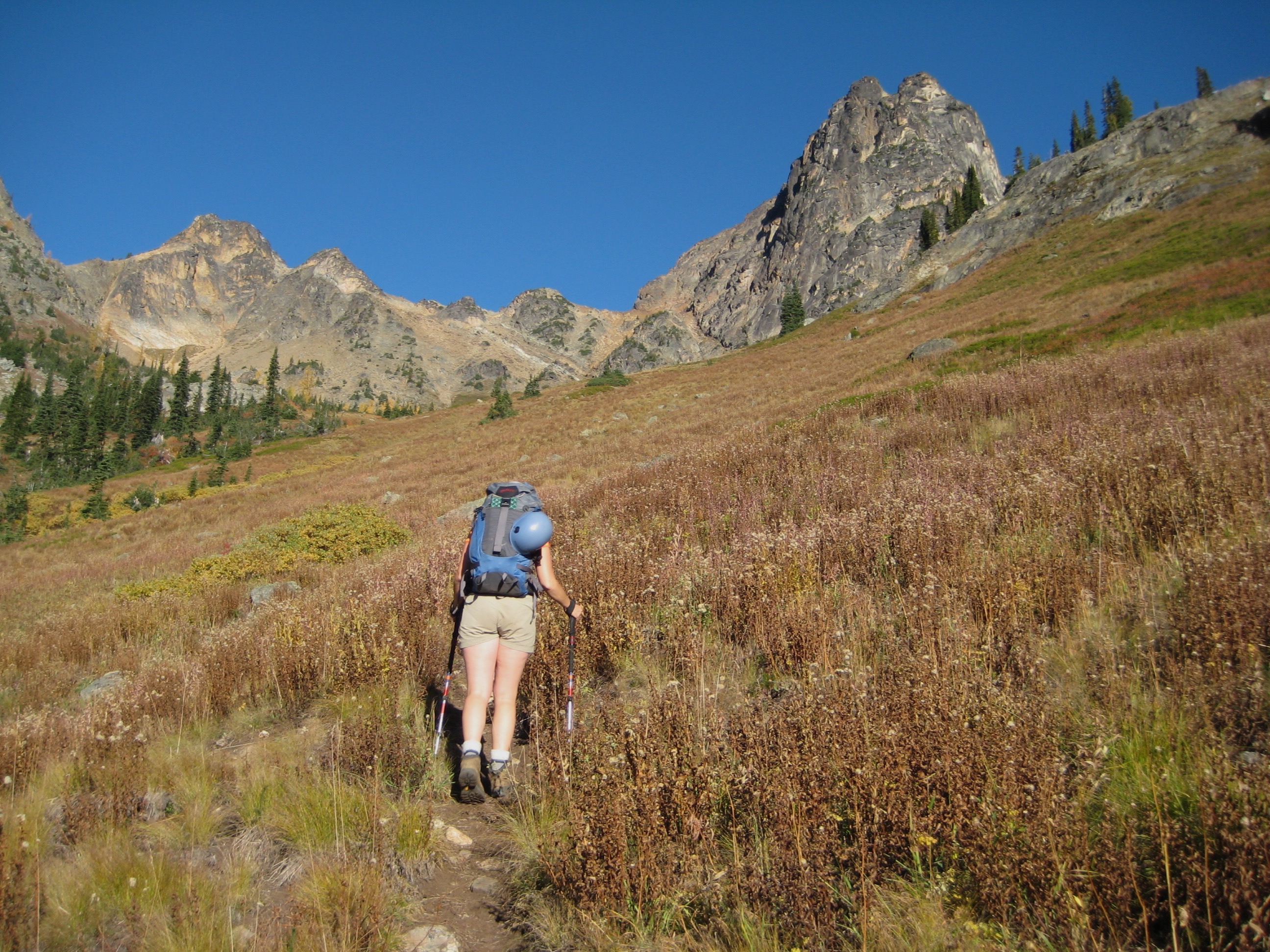 Another party of two (Norm and Nick, from Bellingham) left minutes before us, with the same goal. Not finding any sort of climber’s path down to State Creek and back up the other side, we were all immediately faced with thrashing through dense, wet, scraggly bushes and trees. Thankfully, this ickiness was short, and we were soon hiking up a well-beaten path through sweeping meadow slopes.